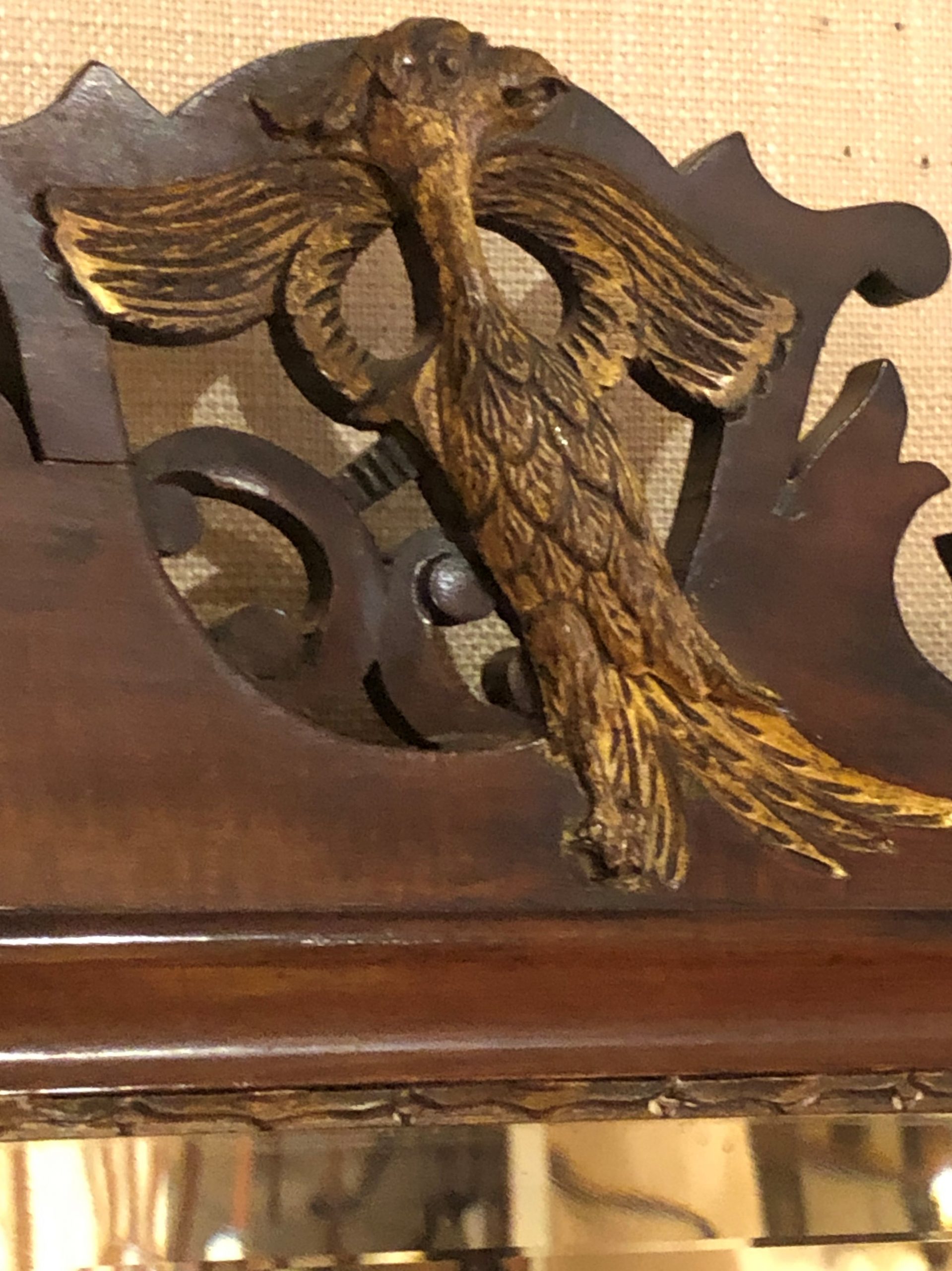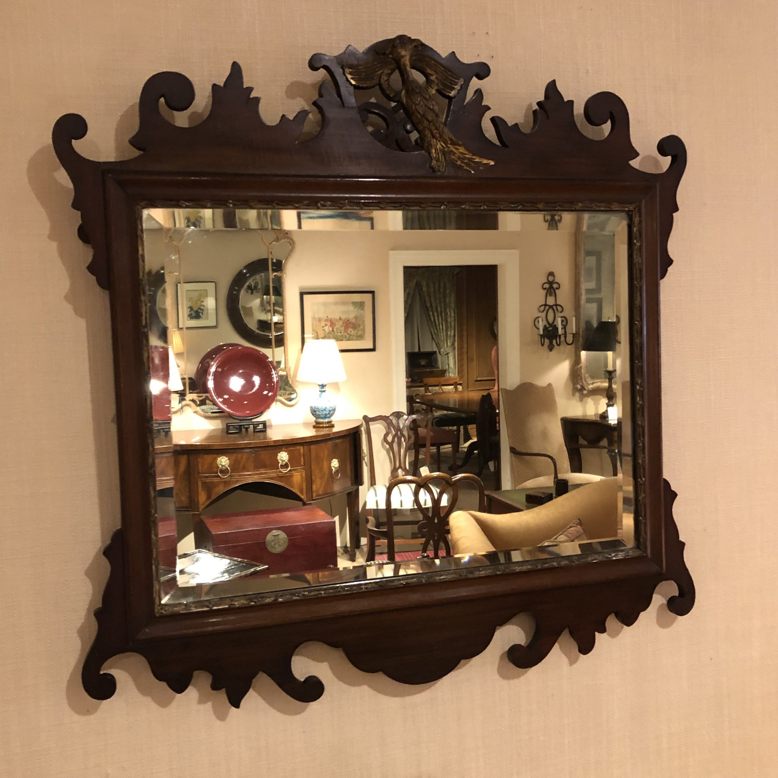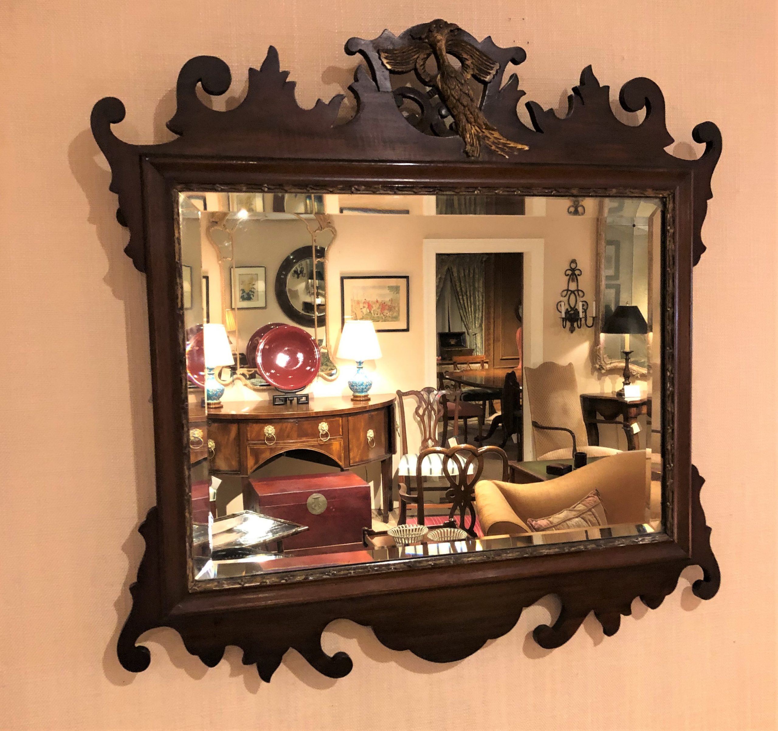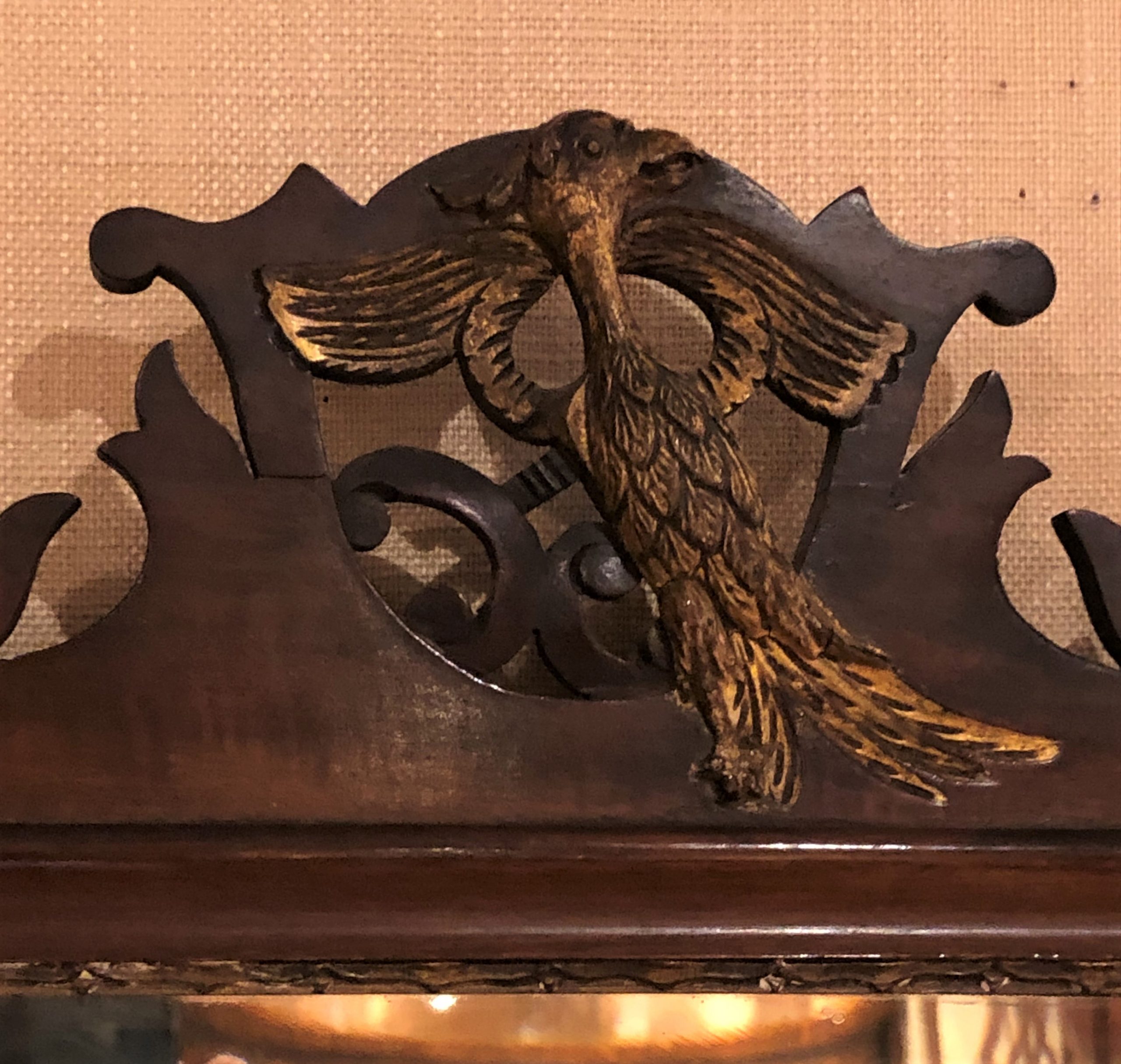 Lovely 19th century Edwardian Chippendale style Mahogany Mirror with “C” scroll fretted frame crested by a hand carved & gilded Hoho bird. Horizontally retangular beveled mirrorplate parcel gilt & moulded around. Circa 1890.