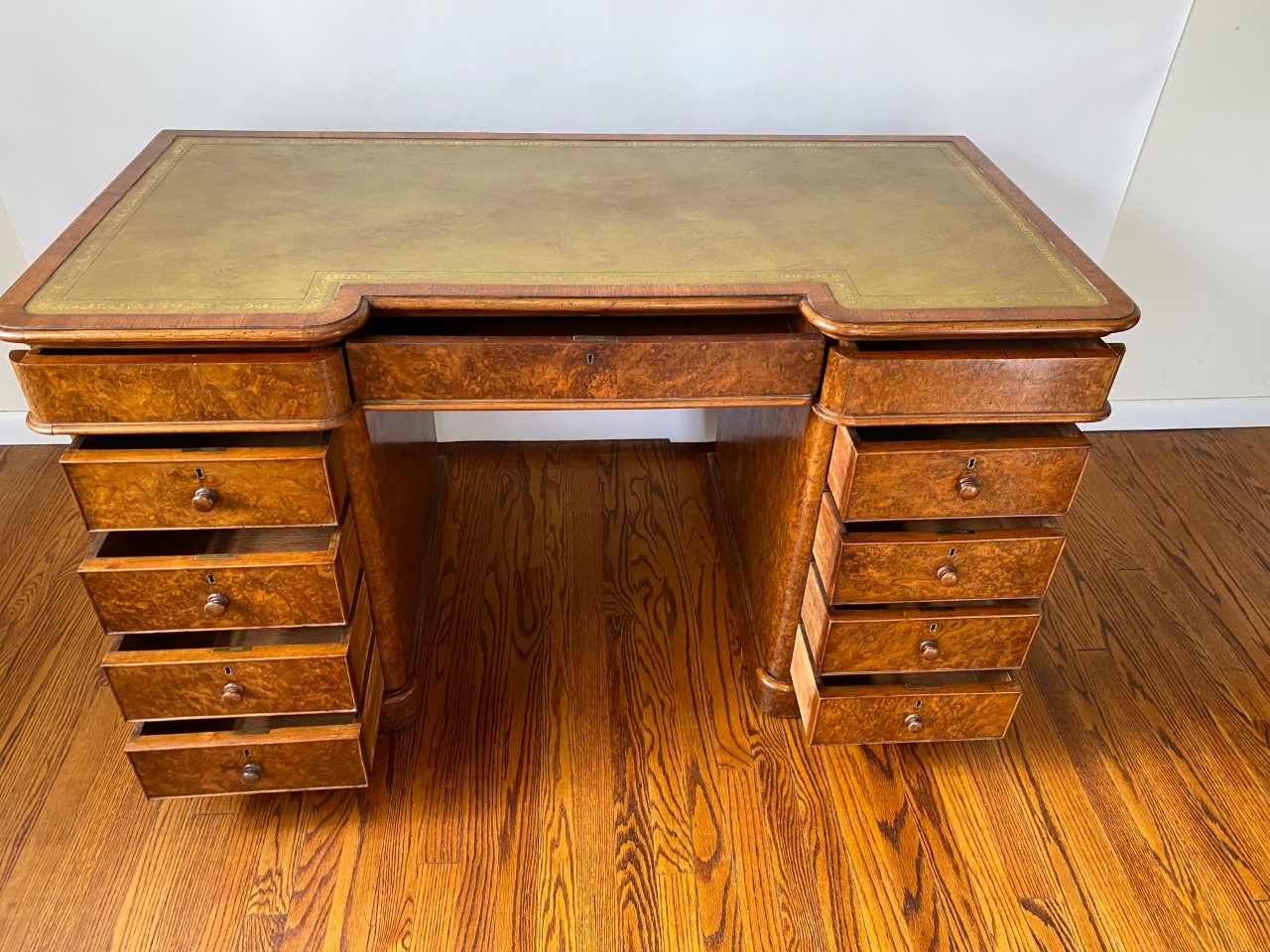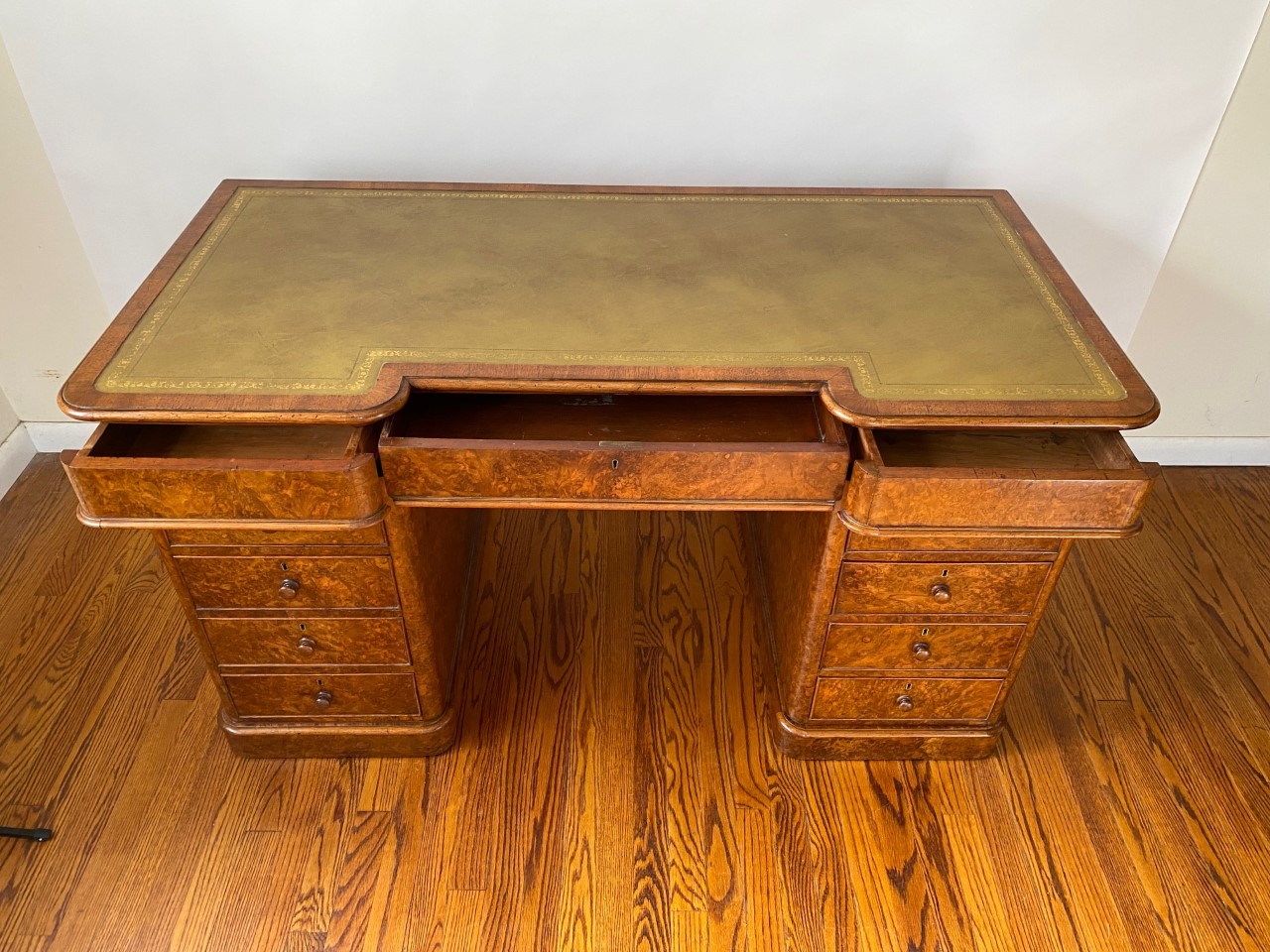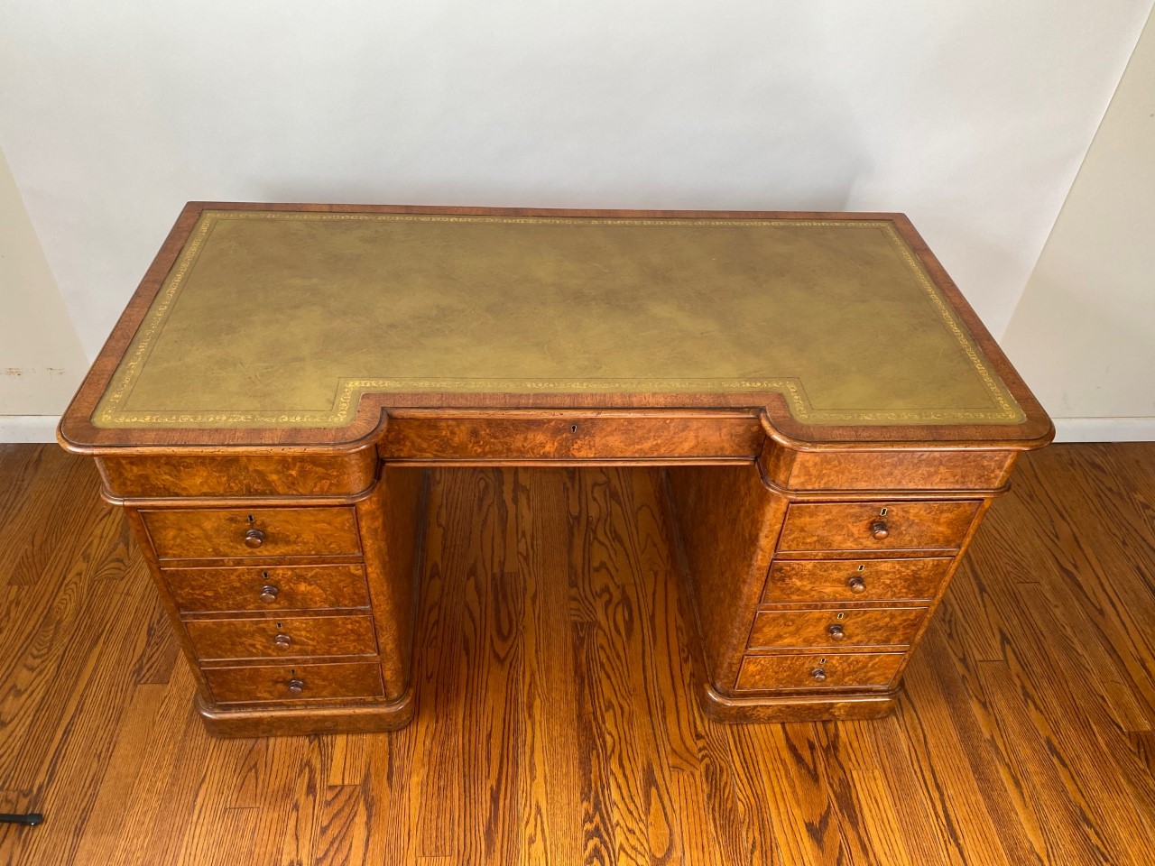 A statement piece for any home office, den or living room! This attractive 19th century English made Burr Walnut pedestal desk has a gilt tooled leather top with a shaped break on the users side and three fitted “blind” drawers. Each pedestal with four fitted box drawers resting on a plinth base. Circa 1850.