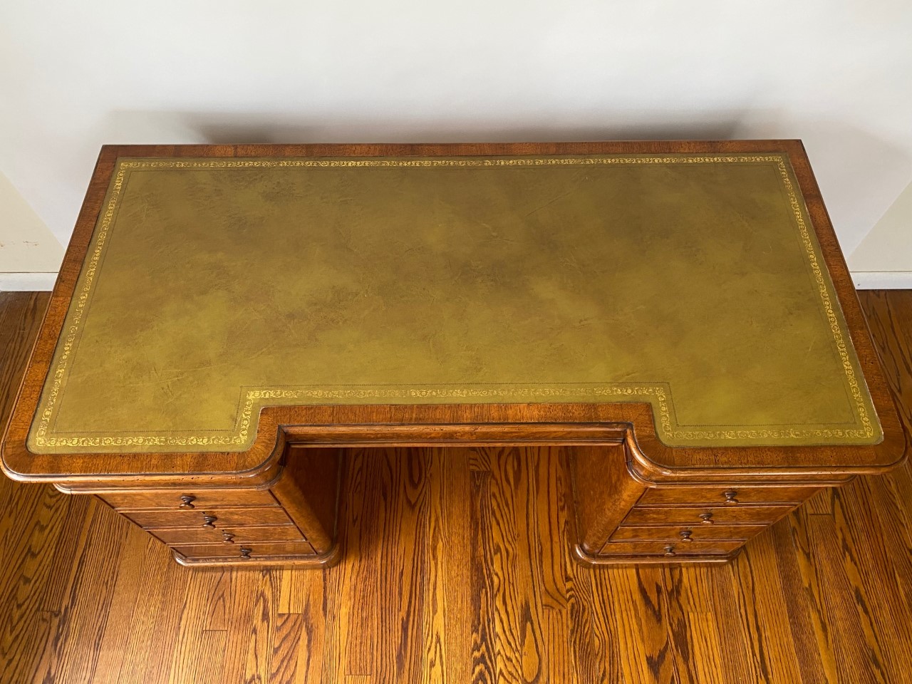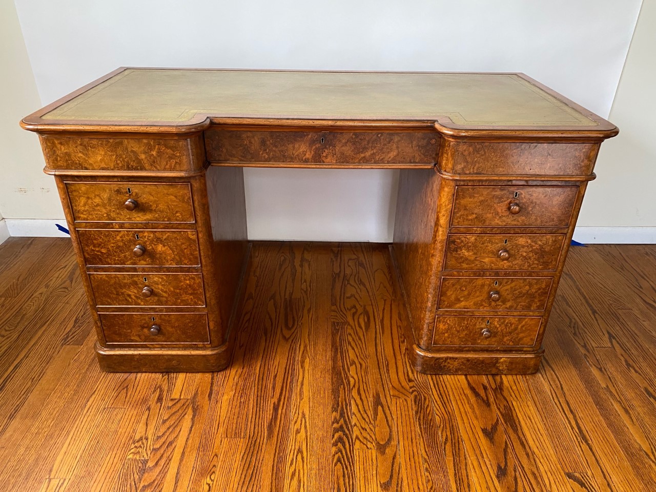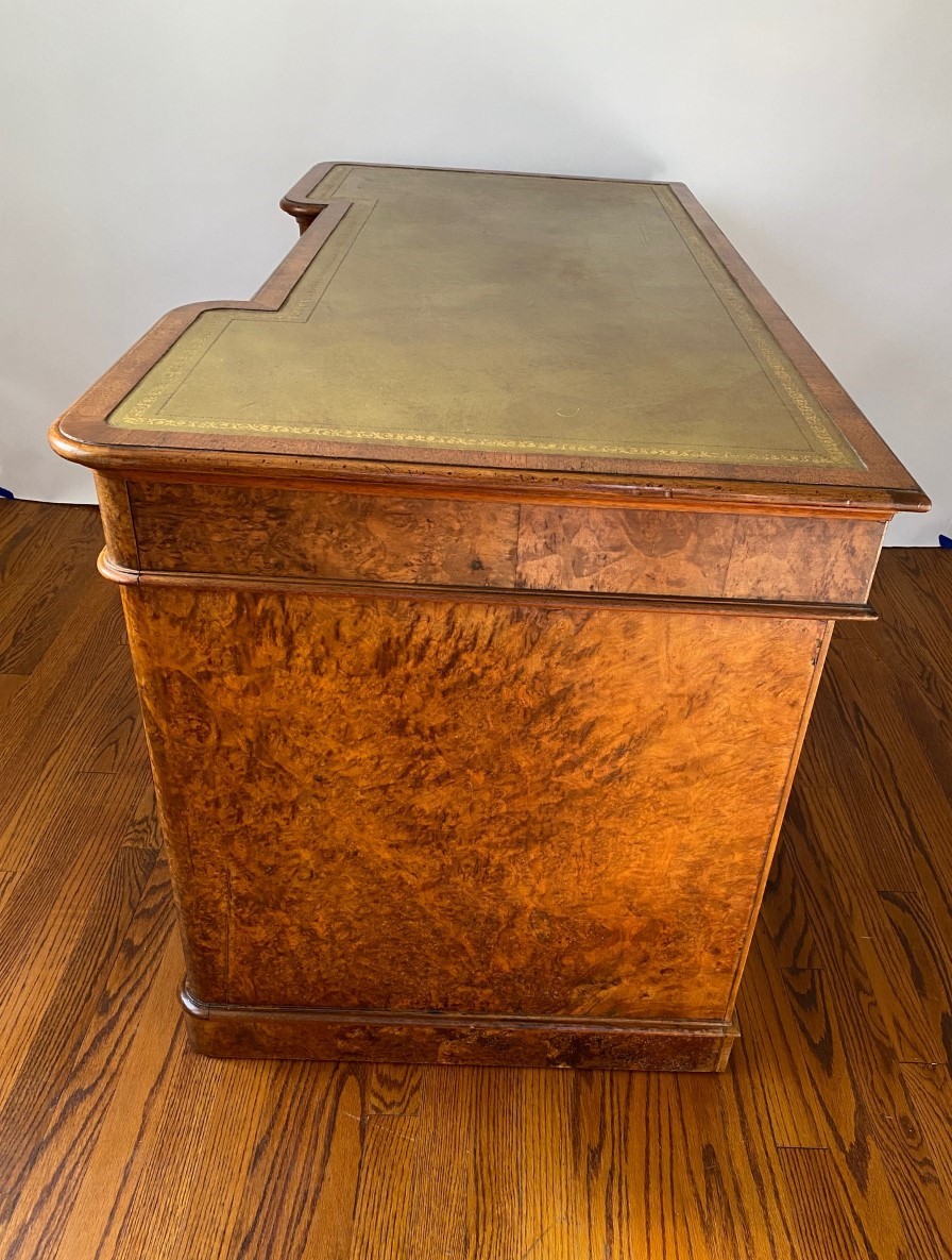A statement piece for any home office, den or living room! This attractive 19th century English made Burr Walnut pedestal desk has a gilt tooled leather top with a shaped break on the users side and three fitted “blind” drawers. Each pedestal with four fitted box drawers resting on a plinth base. Circa 1850.