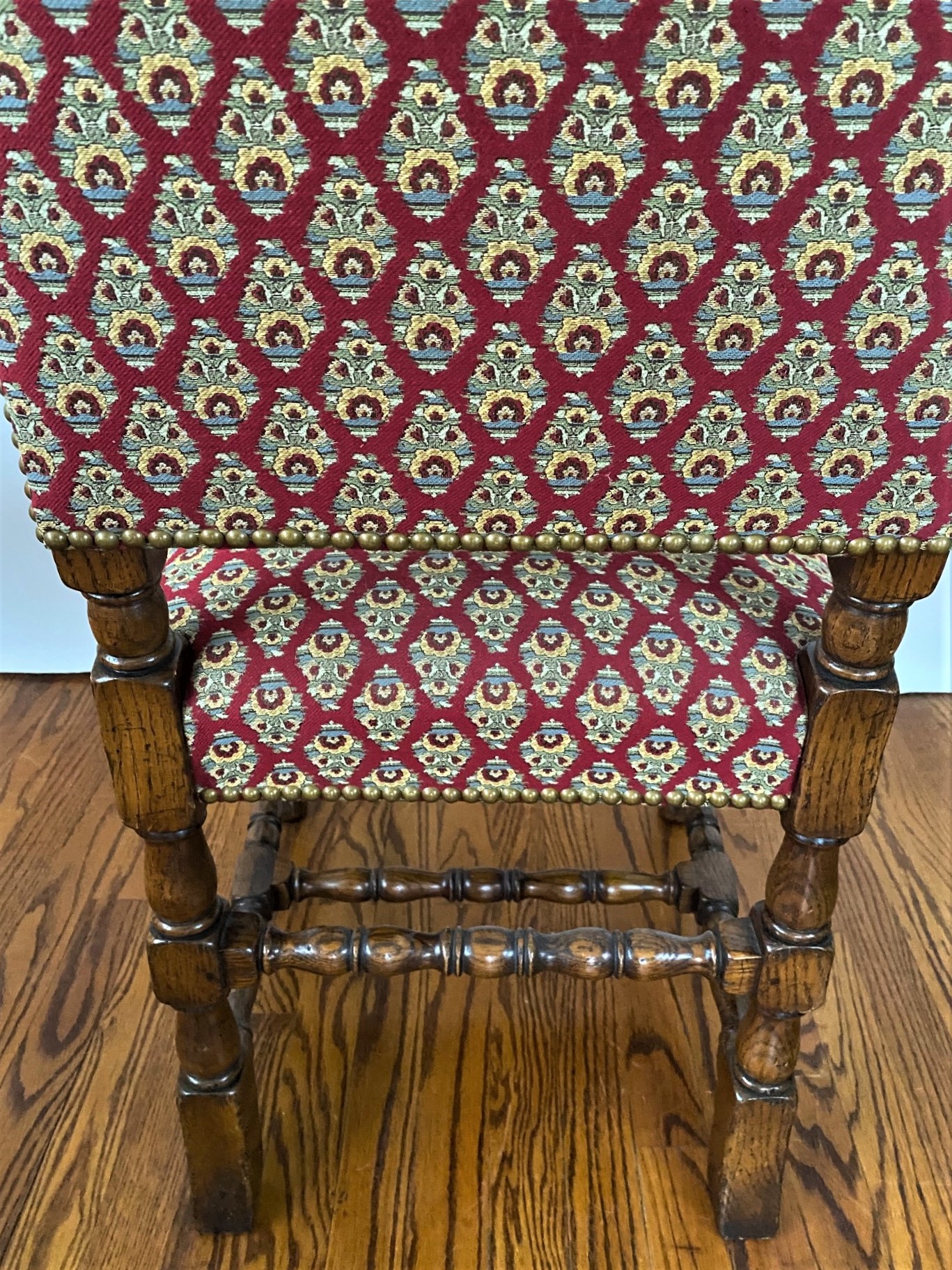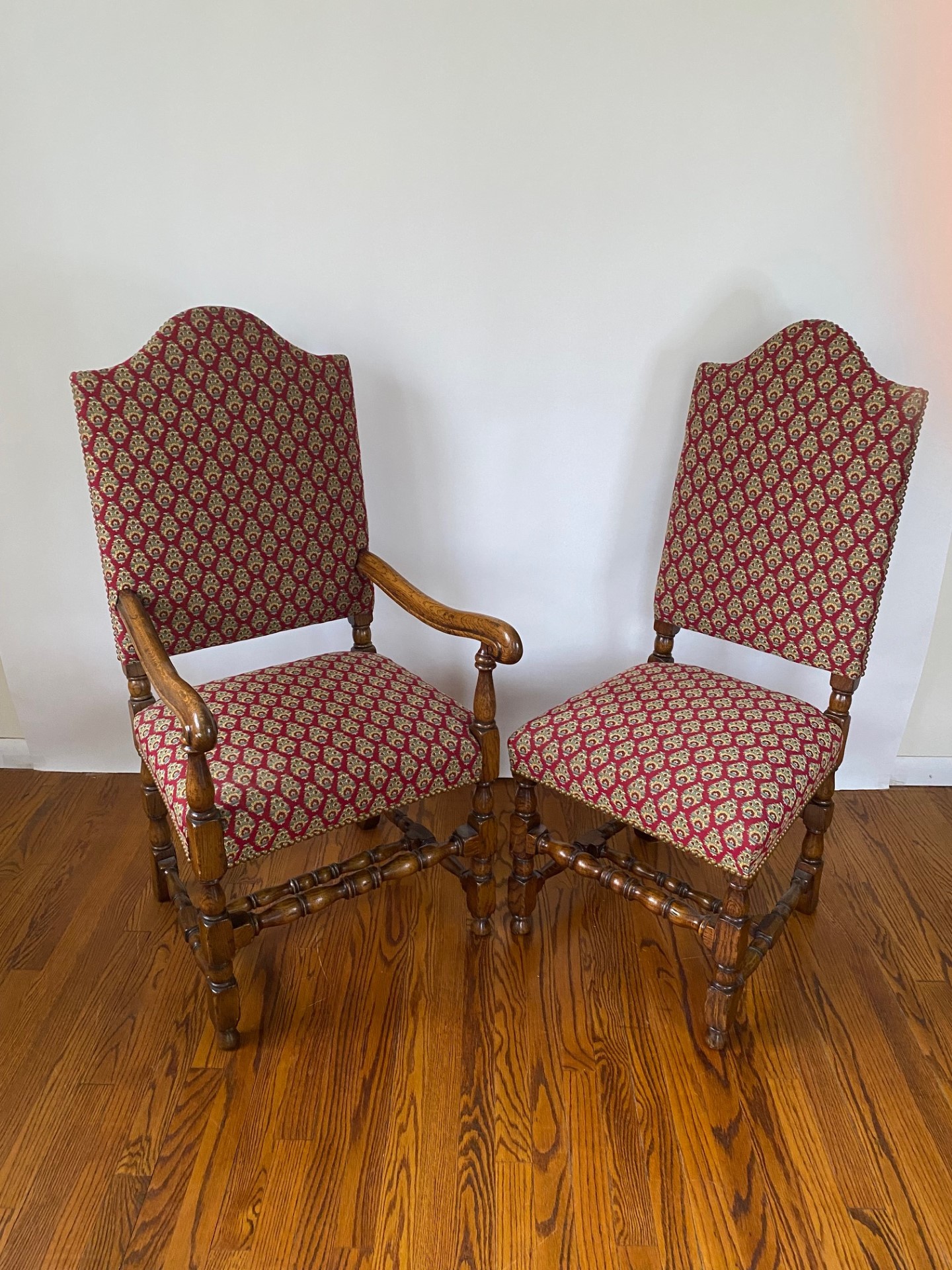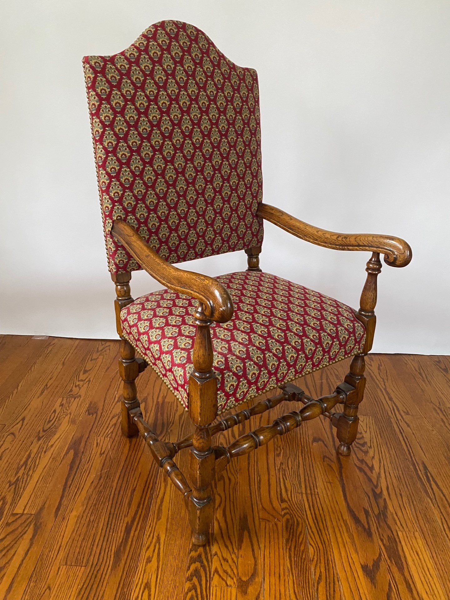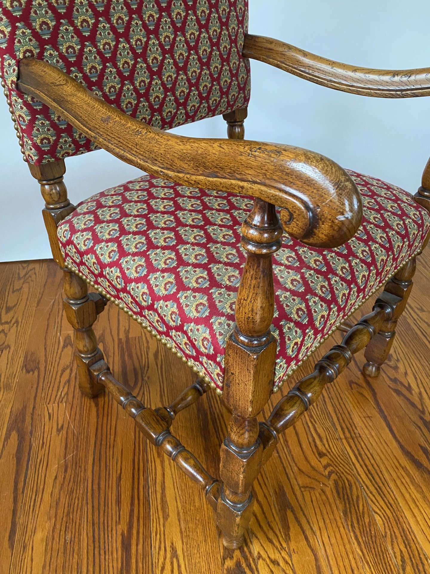 https://www.woodandhogan.com/inventory/6891/ 17th Century Style Oak High Back Side & Arm Chair Item #: O-1060 Dimensions: Arm -23"W 23"D 47"H / Side 20"W 20"D 46"H. Description: English made 17th Century style Oak high back upholstered side and arm dining chair with turned front rail. Status: Special Pricing for a limited time. Pricing: STANDARD - $5,800.00. SALE NET PRICE - $1,750.00. Image Gallery: For additional product information, contact Wood & Hogan: 200 Lexington Avenue, Rm. 812, New York, NY, USA 10016-6101 (212) 532-7440, (212) 532-4640 FAX, sales@woodandhogan.com. Back You also might like: Mahogany Gainsborough Open Armchair ST. MARTINS LANE SOFA Mahogany Sheraton Style Window Seat Chippendale Style Upholstered Armchair Elm Wood Ladderback Armchair Georgian Style Mahogany Open