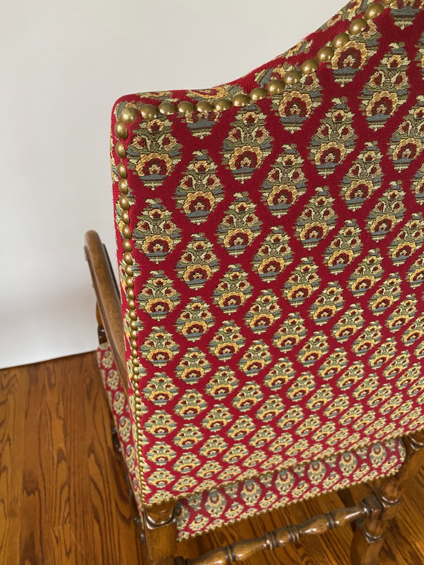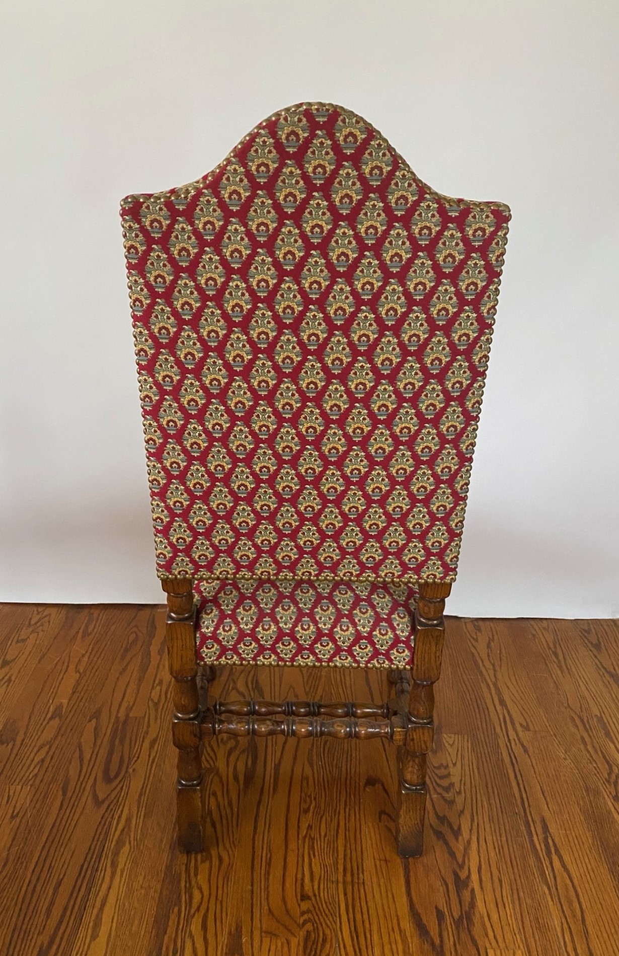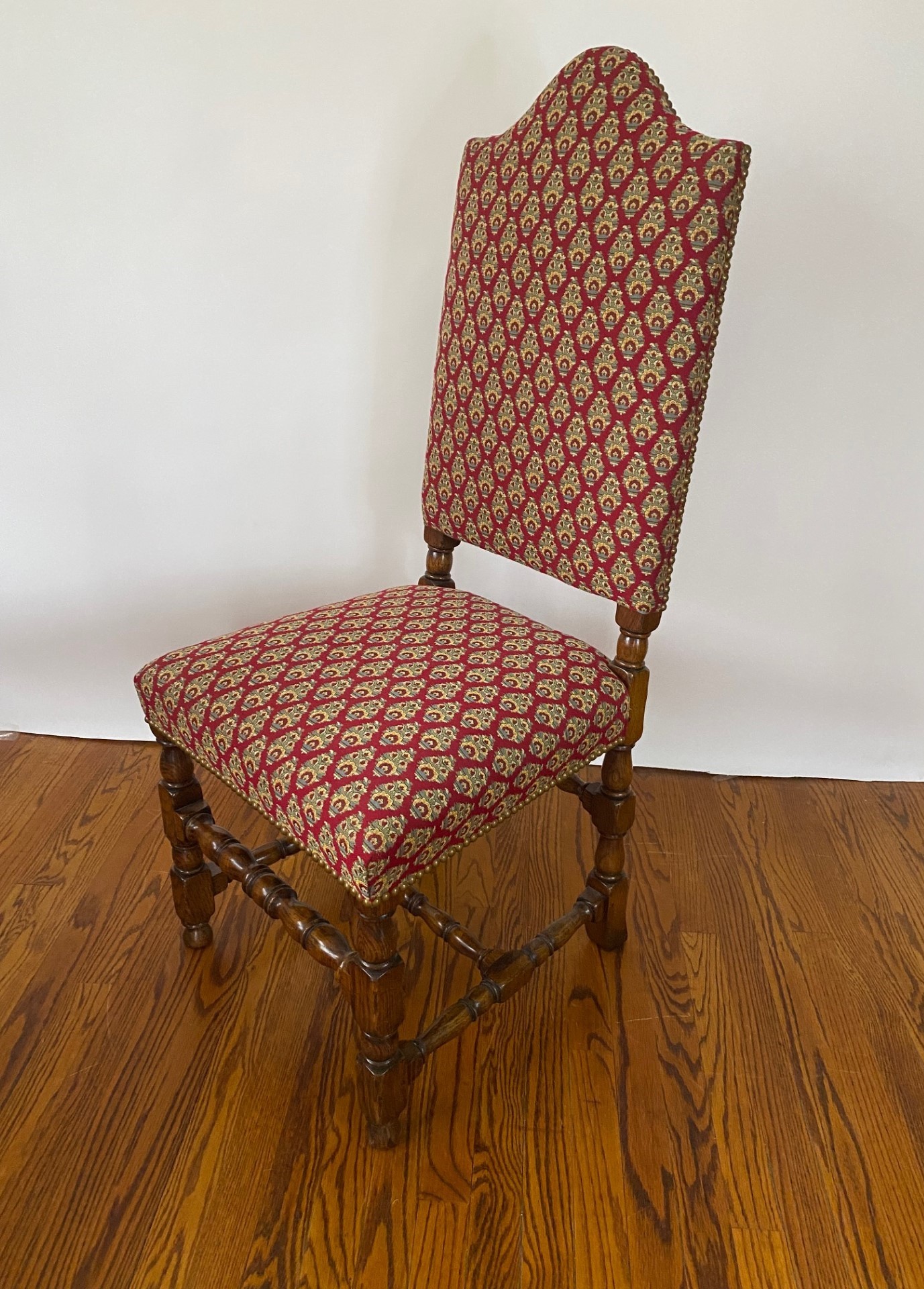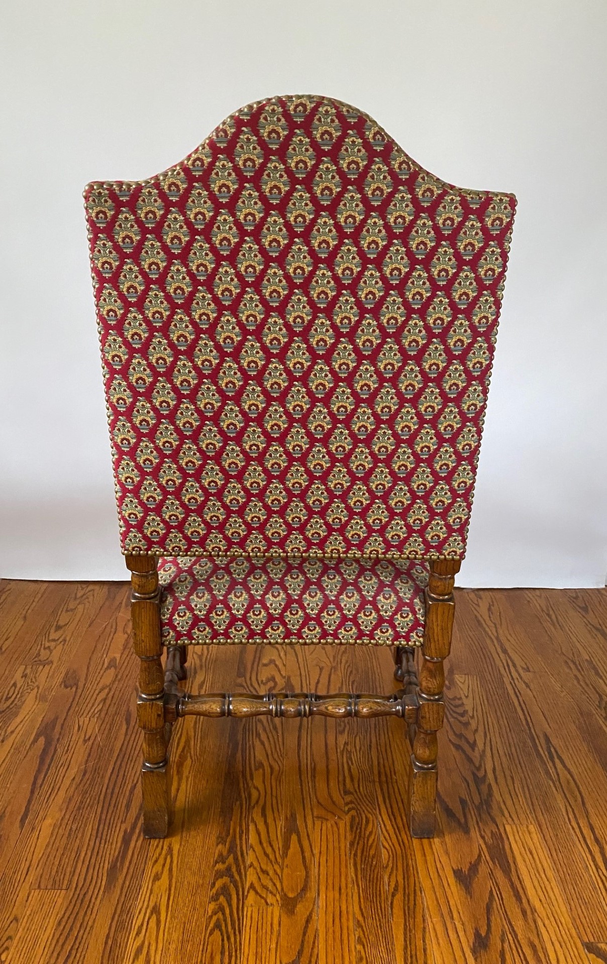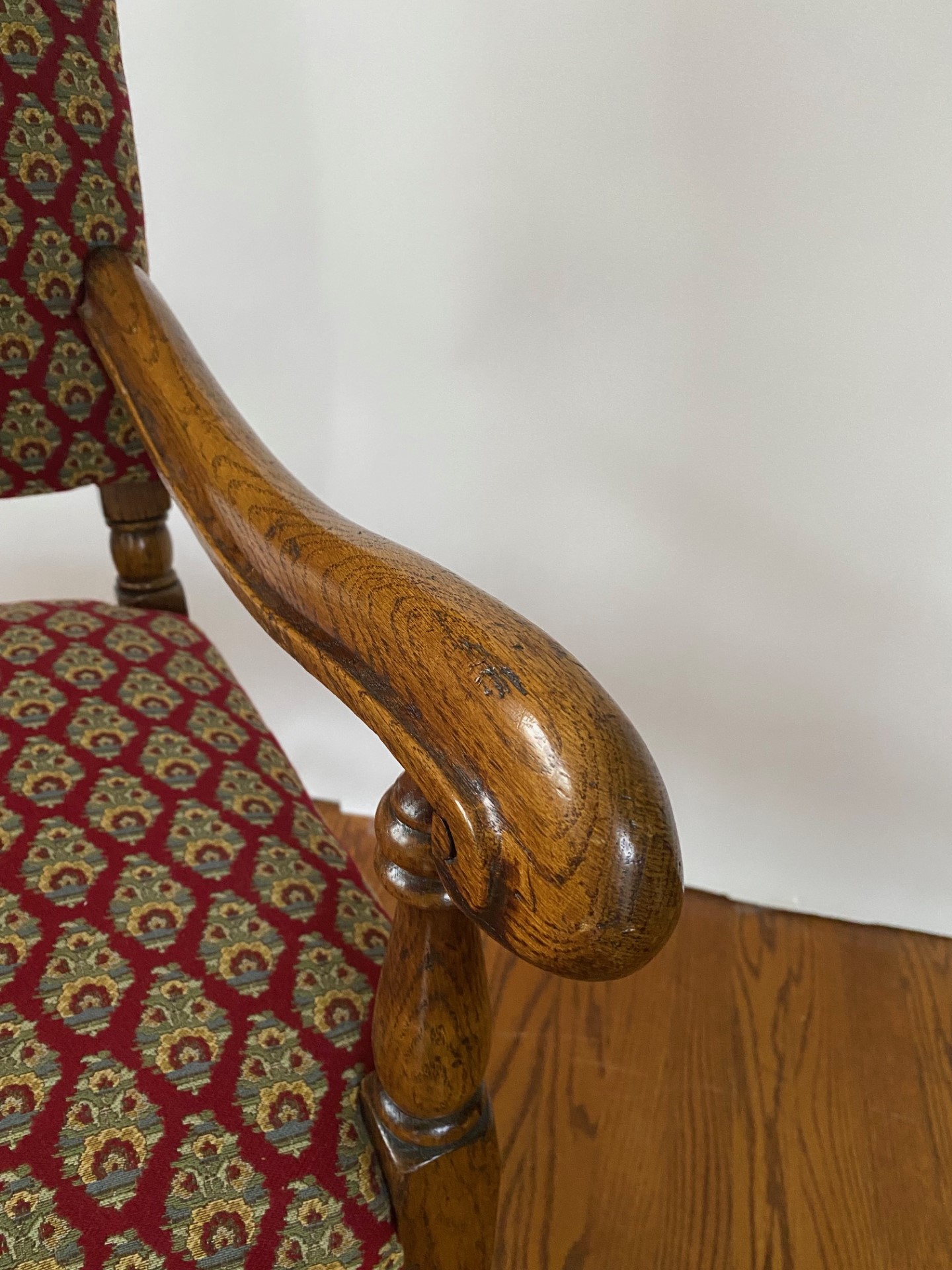https://www.woodandhogan.com/inventory/6891/ 17th Century Style Oak High Back Side & Arm Chair Item #: O-1060 Dimensions: Arm -23"W 23"D 47"H / Side 20"W 20"D 46"H. Description: English made 17th Century style Oak high back upholstered side and arm dining chair with turned front rail. Status: Special Pricing for a limited time. Pricing: STANDARD - $5,800.00. SALE NET PRICE - $1,750.00. Image Gallery: For additional product information, contact Wood & Hogan: 200 Lexington Avenue, Rm. 812, New York, NY, USA 10016-6101 (212) 532-7440, (212) 532-4640 FAX, sales@woodandhogan.com. Back You also might like: Mahogany Gainsborough Open Armchair ST. MARTINS LANE SOFA Mahogany Sheraton Style Window Seat Chippendale Style Upholstered Armchair Elm Wood Ladderback Armchair Georgian Style Mahogany Open