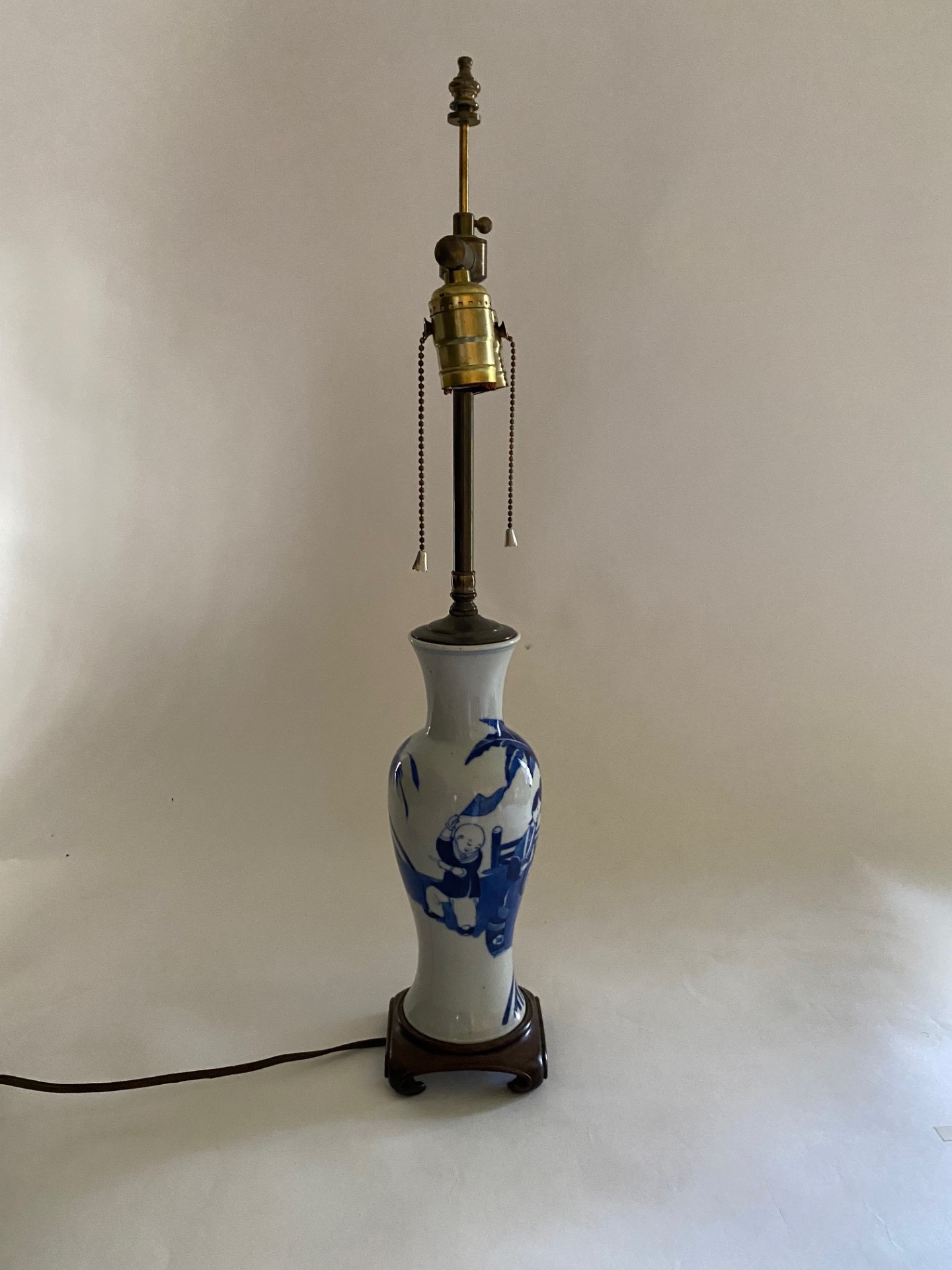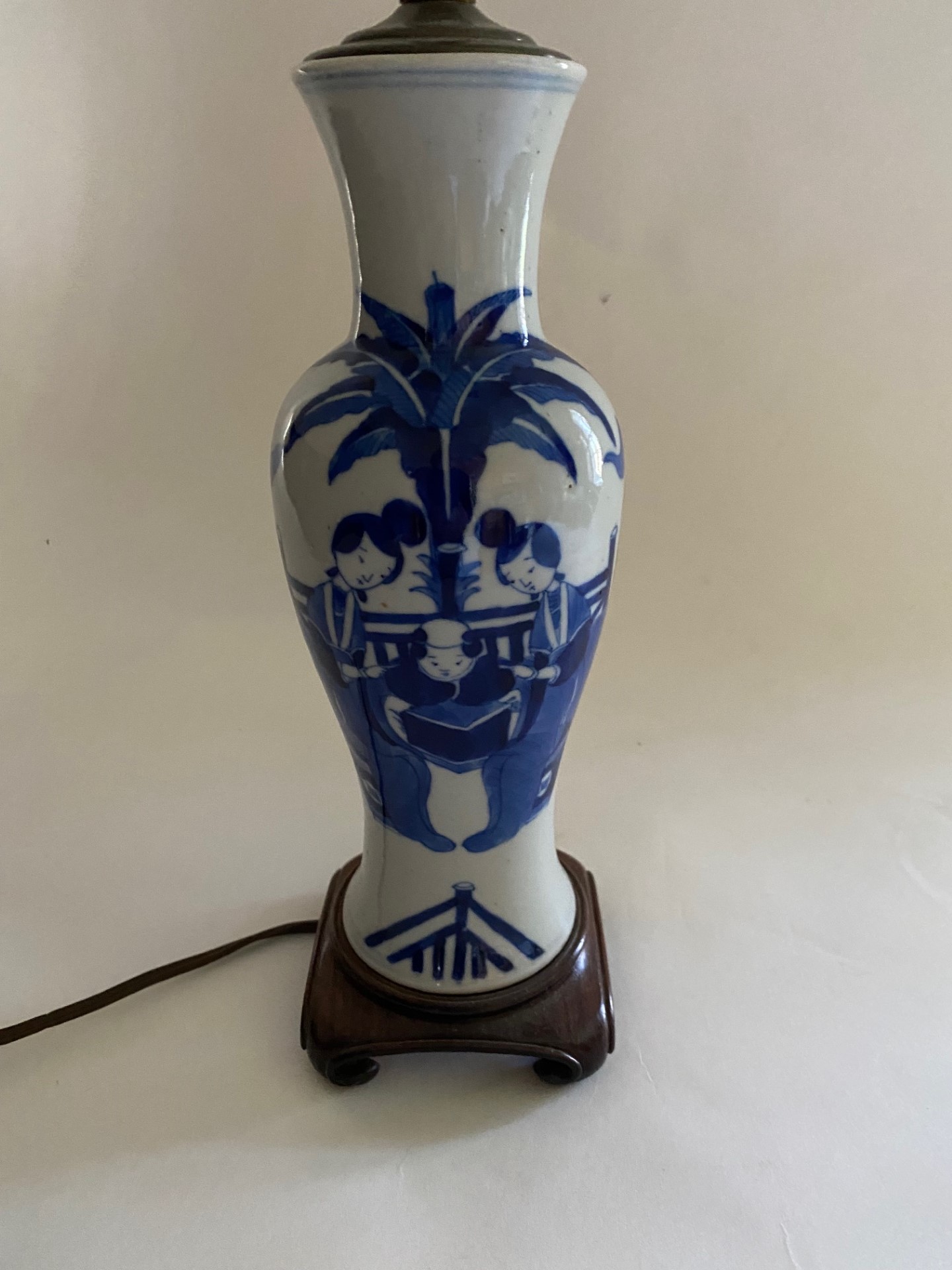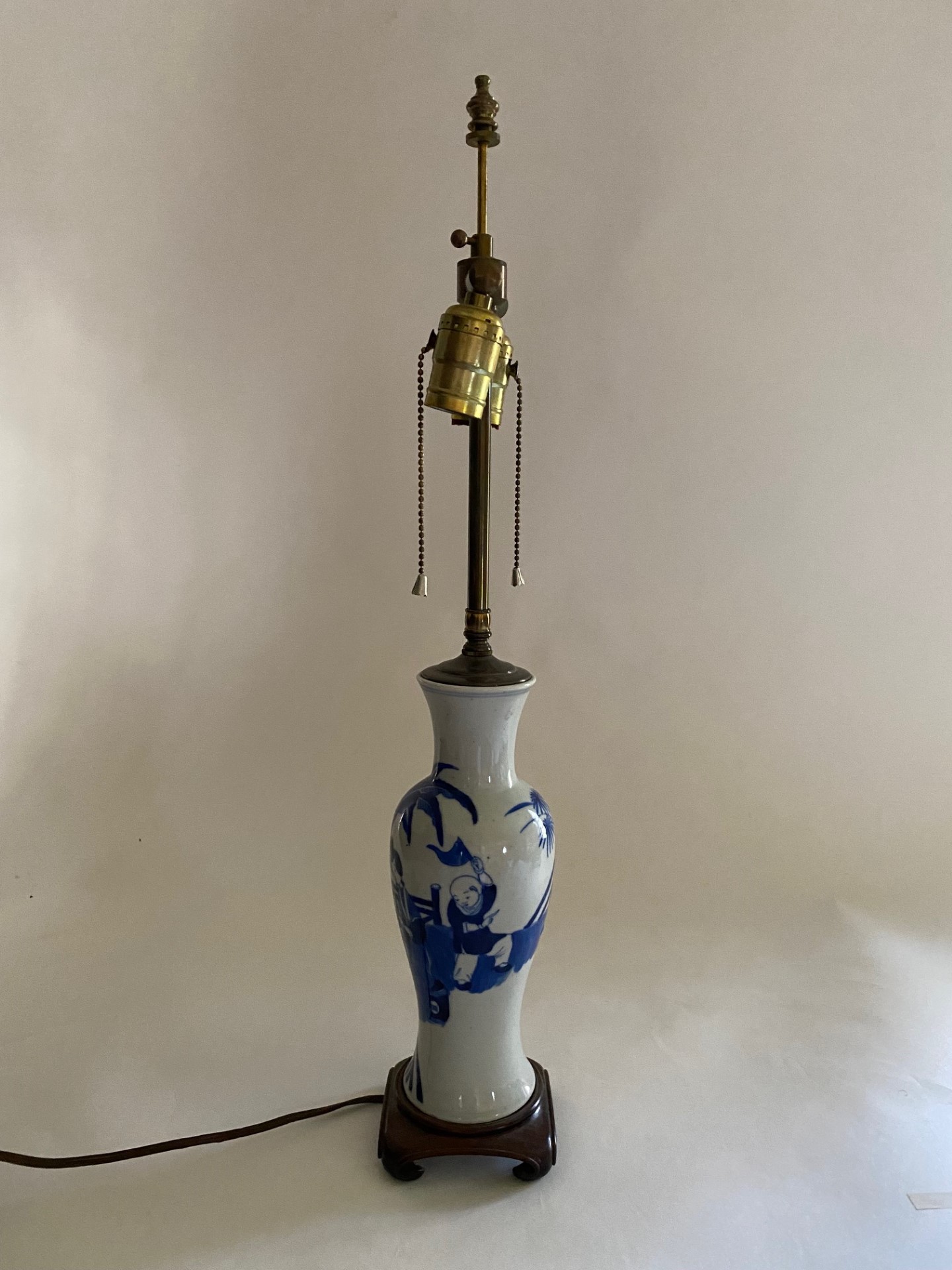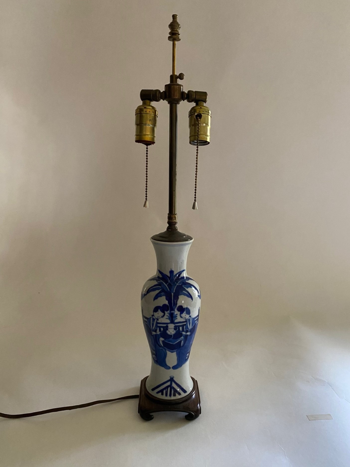 https://www.woodandhogan.com/inventory/7147/ Item #: WH2604 Dimensions: 19th Century Blue & White Chinese Vase Lamp Description: 19th Century Chinese Blue & White Porcelain Double Hung Vase Lamp with Hand Painted Decoration on Shaped Wood Base. Status: Antique Image Gallery: For additional product information, contact Wood & Hogan: 200 Lexington Avenue, Rm. 812, New York, NY, USA 10016-6101 (212) 532-7440, (212) 532-4640 FAX, sales@woodandhogan.com. Back You also might like: Antique Black Chinese Vase Lamp with Hand Painted Decoration Pair of Vintage Floral Decorated Glazed Vase Table Lamps Antique Chinese Hand Painted Porcelain Vase Lamp Vintage English Baroque Style Antique Bronze Eight Light Chandelier “Mellon” Table Lamp with Antique White Finish and Shade with Gilt Trim
