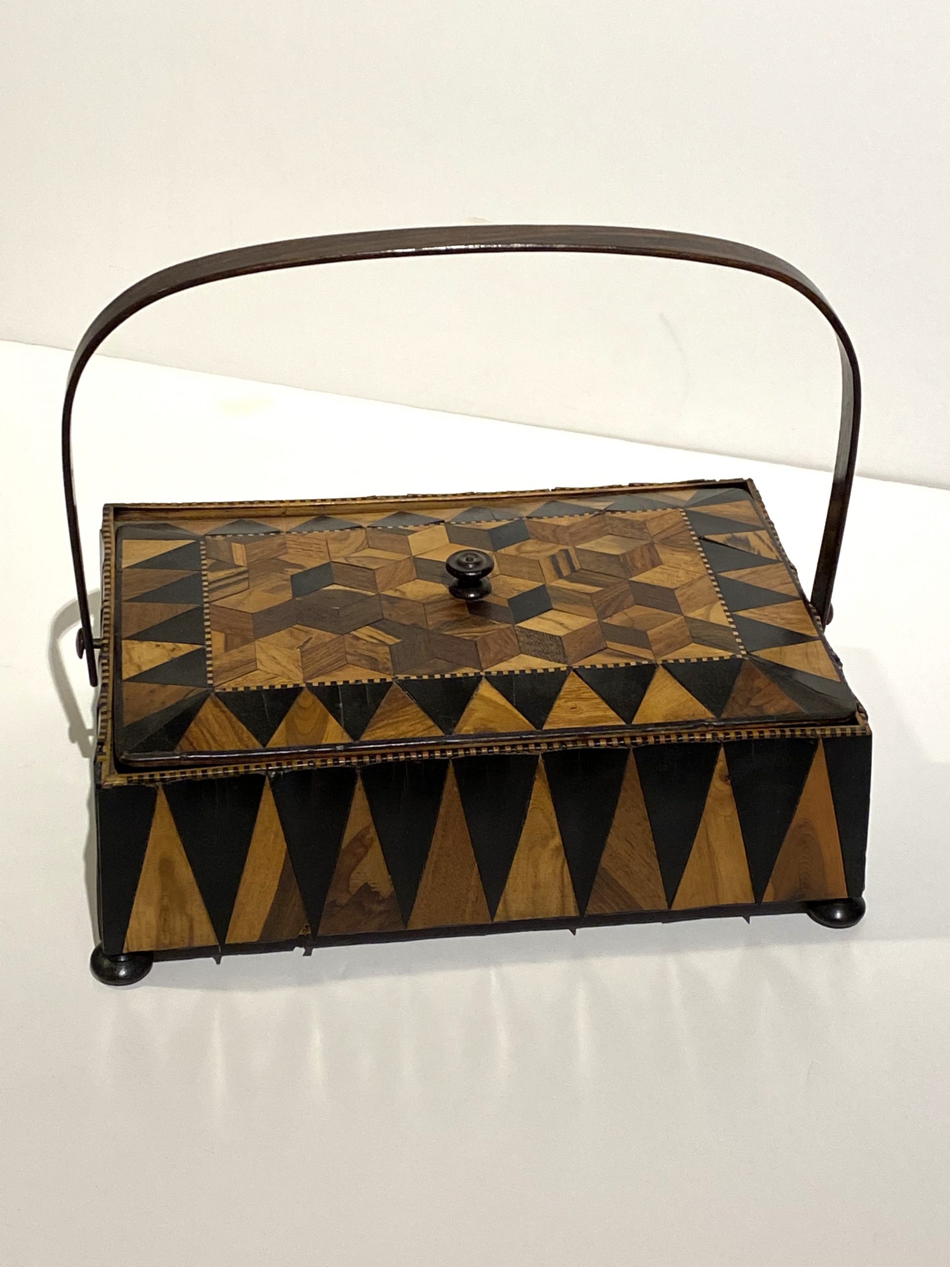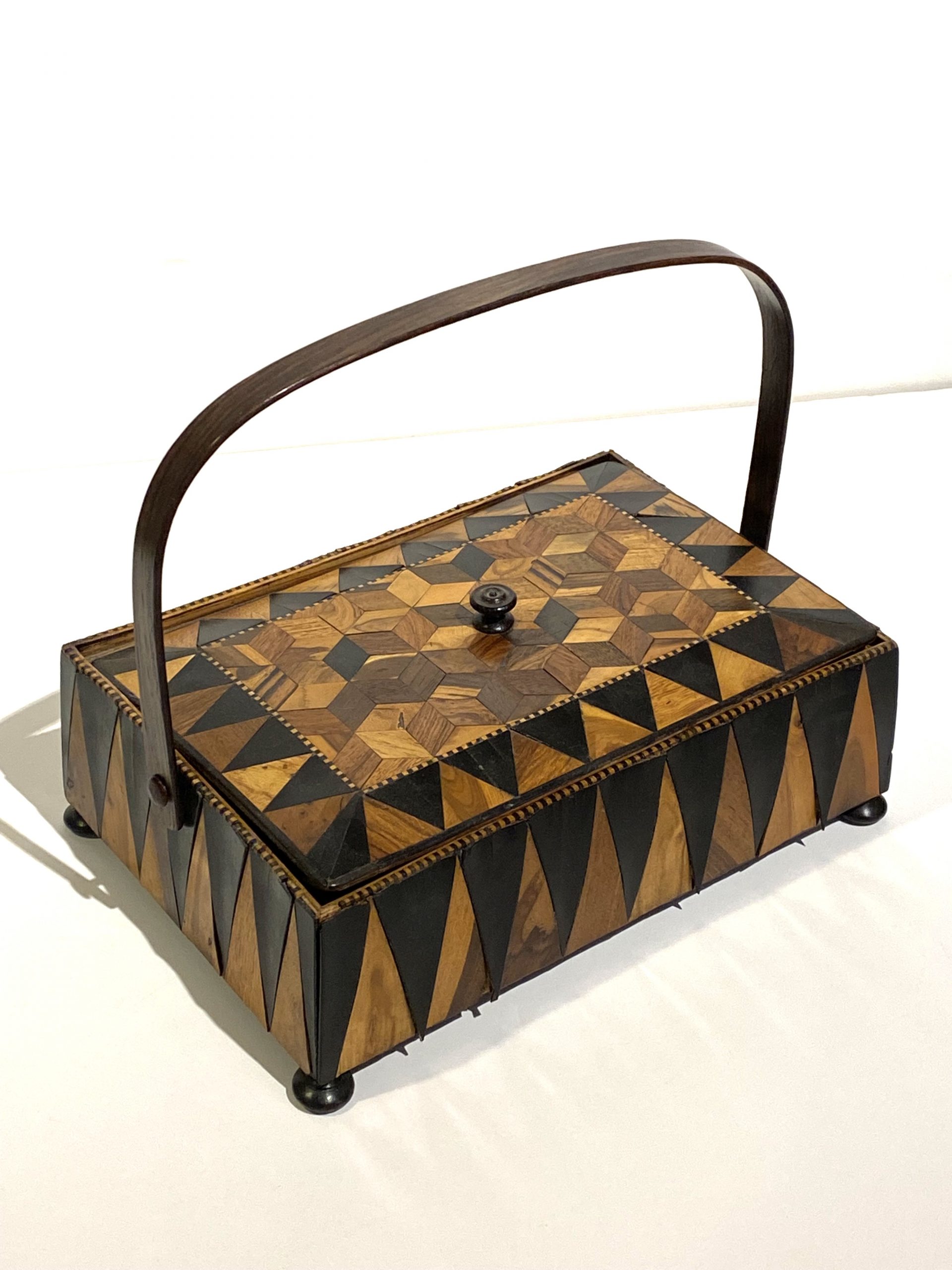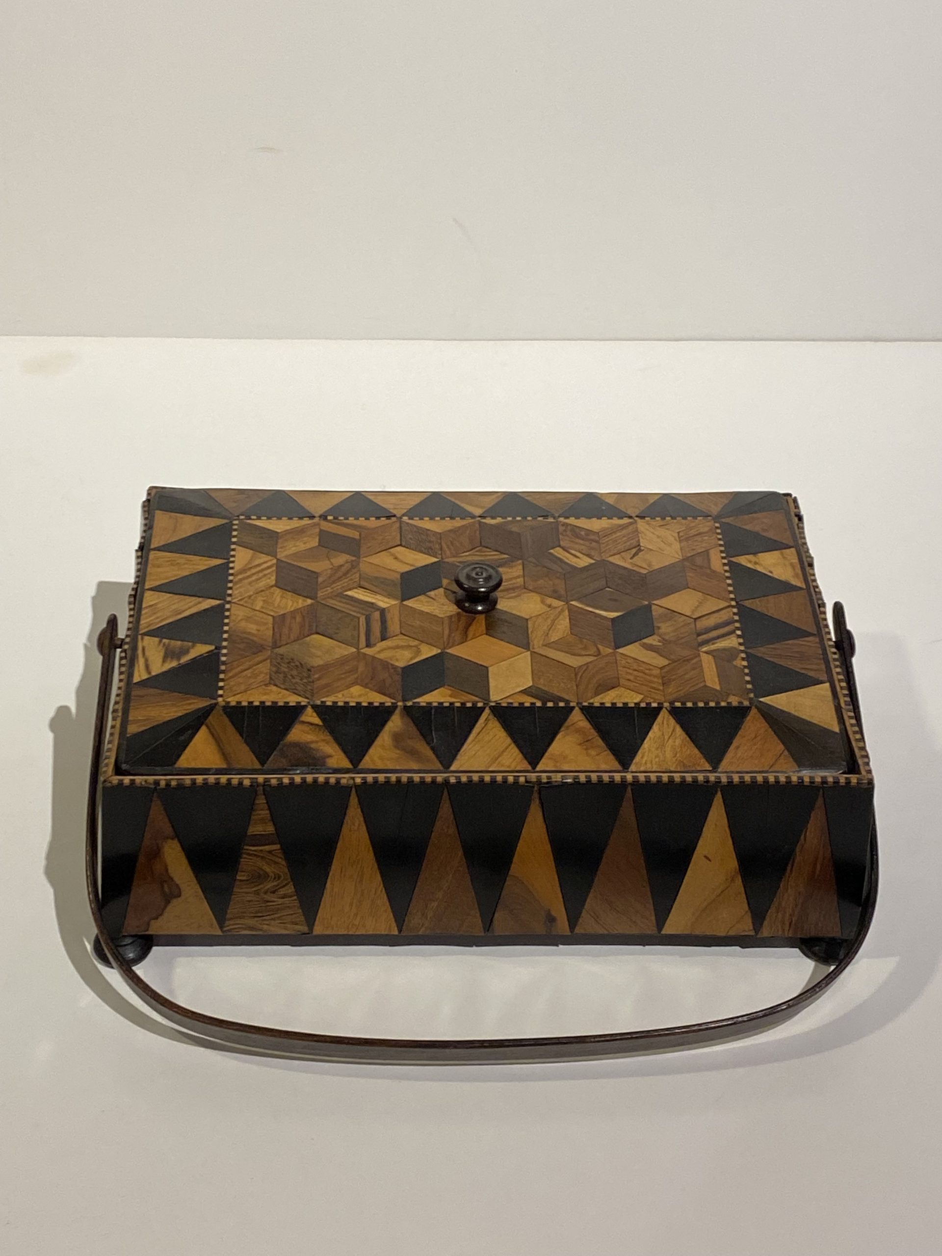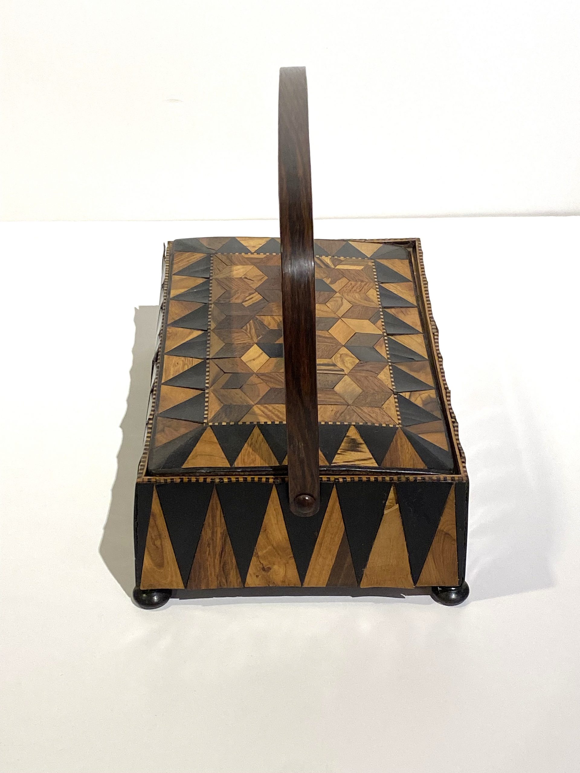 This striking 19th-century English Trunbridge parquetry box showcases exceptional craftsmanship and refined decorative detail. The rectangular form is constructed from rich walnut, its surface adorned with intricate parquetry in geometric patterns that display both precision and artistry. The warm tones and natural grain of the walnut complement the meticulous inlay work, giving the box a distinguished presence.