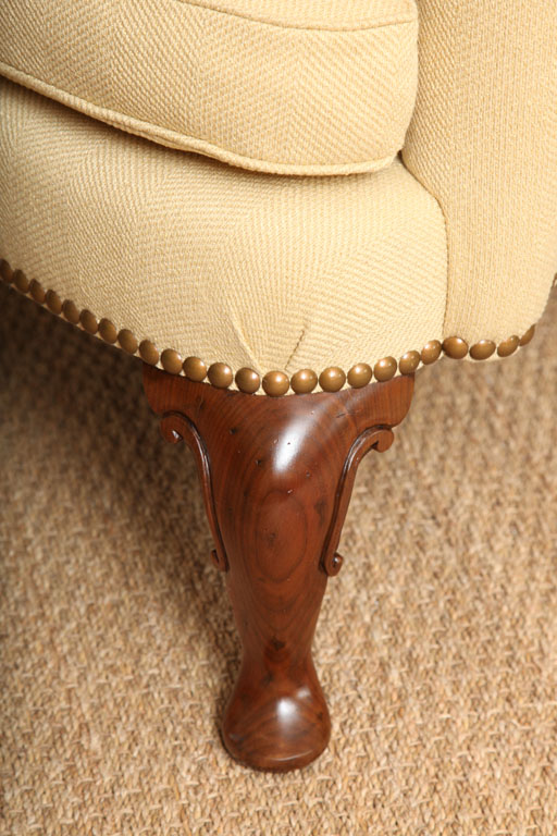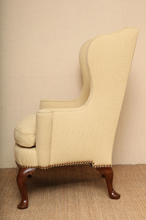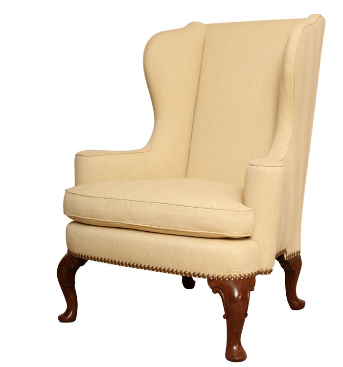 https://www.woodandhogan.com/inventory/blenheim-wing-chair/ Blenheim Wing Chair Item #: WU-301 Dimensions: 34"W 32 1/2"D 43"H. Description: Walnut Queen Anne Wing Chair on Scroll Carved Cabriole Legs. 80% Goose Down 20% Cusion. COM: 7 Yards 50″ Plain. Image Gallery: For additional product information, contact Wood & Hogan: 200 Lexington Avenue, Rm. 812, New York, NY, USA 10016-6101 (212) 532-7440, (212) 532-4640 FAX, sales@woodandhogan.com. Back You also might like: Cranworth Wing Chair OLDFIELD WING CHIAR Essex Wing Chair Blenheim Wing Chair PORTER’S WING CHAIR Ball & Claw Wing Chair