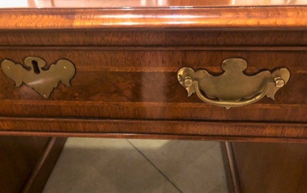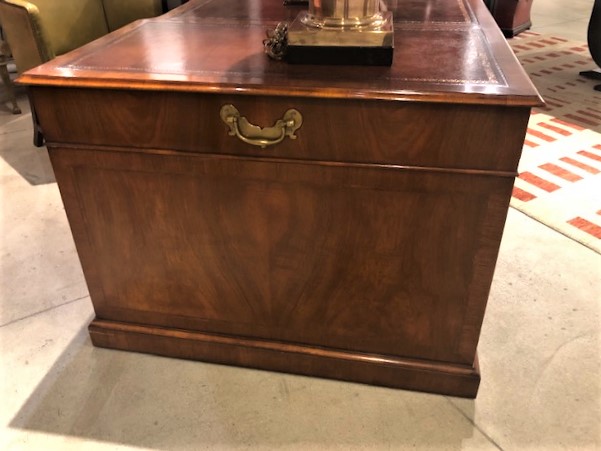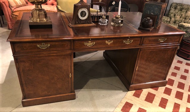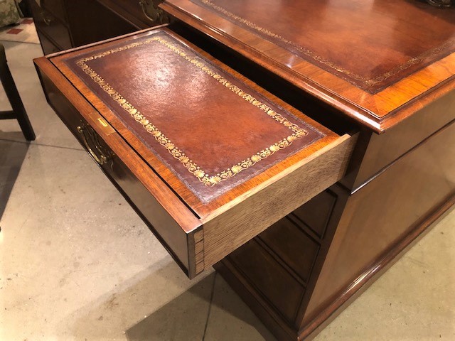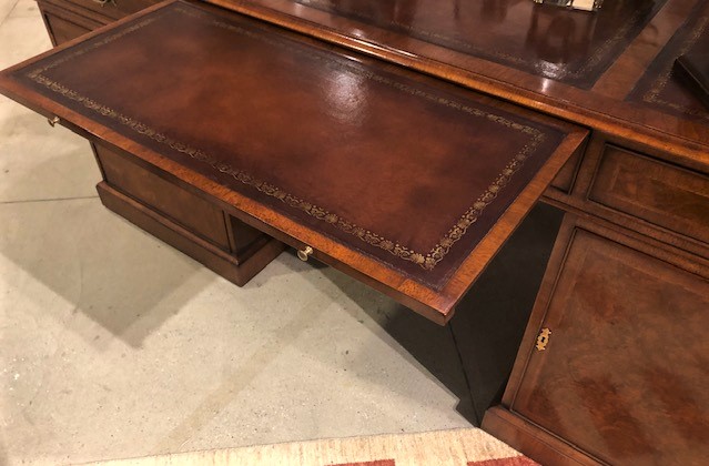 Burr Walnut early 18th century style “Partner’s” Desk featuring a three panel gilt tooled leather shaped top, dictation slide and writing tablets with Walnut crossbanding, Burr Walnut drawer fronts with Herringbone inlay and Walnut crossbanding on a plinth base. Chestnut lined & fitted drawers, except for the file drawer (lower right pedestal) on metal support slides, w/ brass ‘back-plate’ handles. Reverse side w/ three drawers over two cupboards.