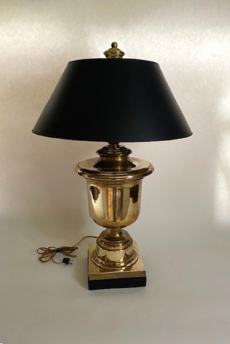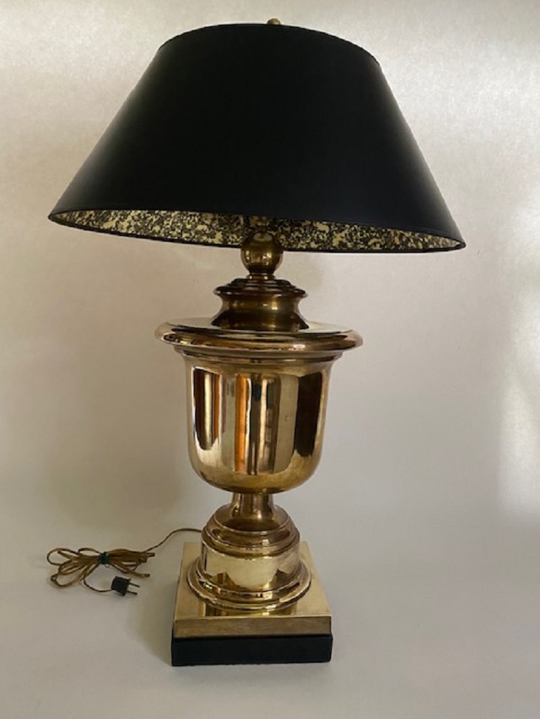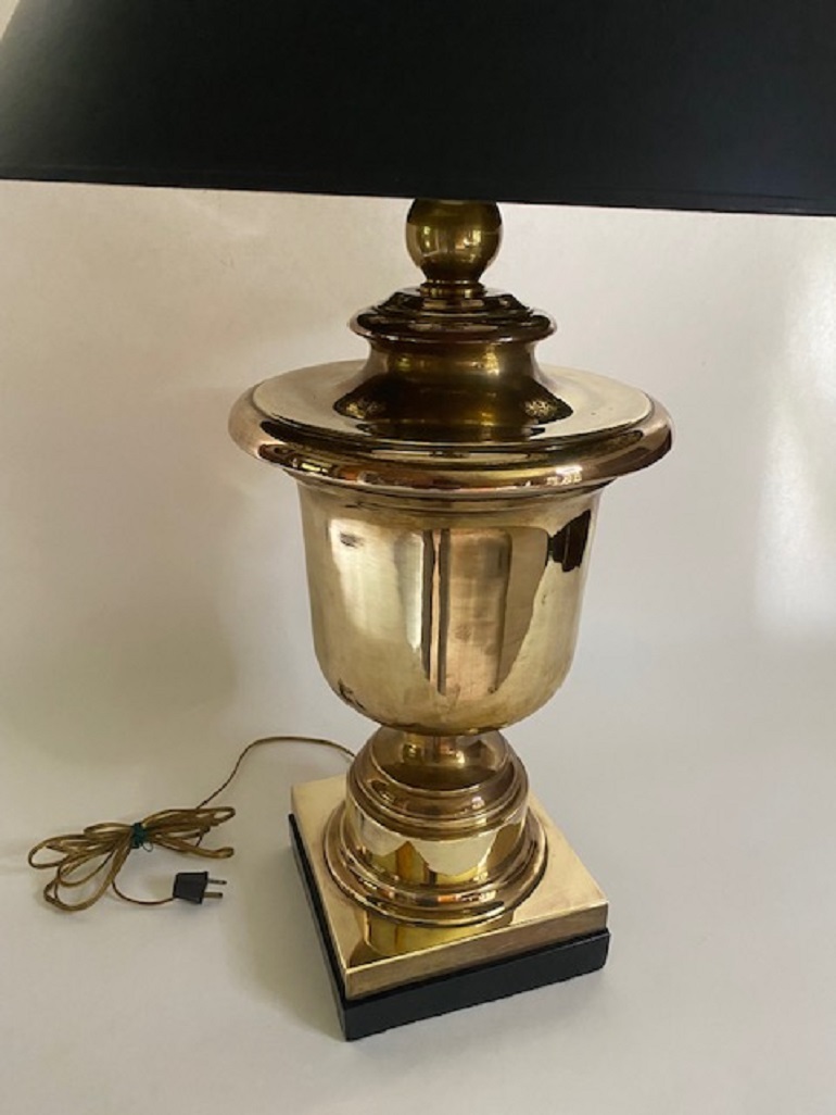 A beautiful large-scale brass table lamp by Chapman. The solid brass urn form is embellished with a black square pedestal base and a black parchment shade and topped with an oversized brass finial.