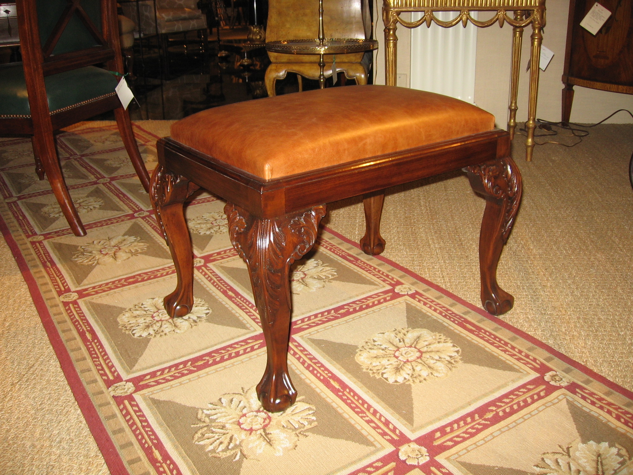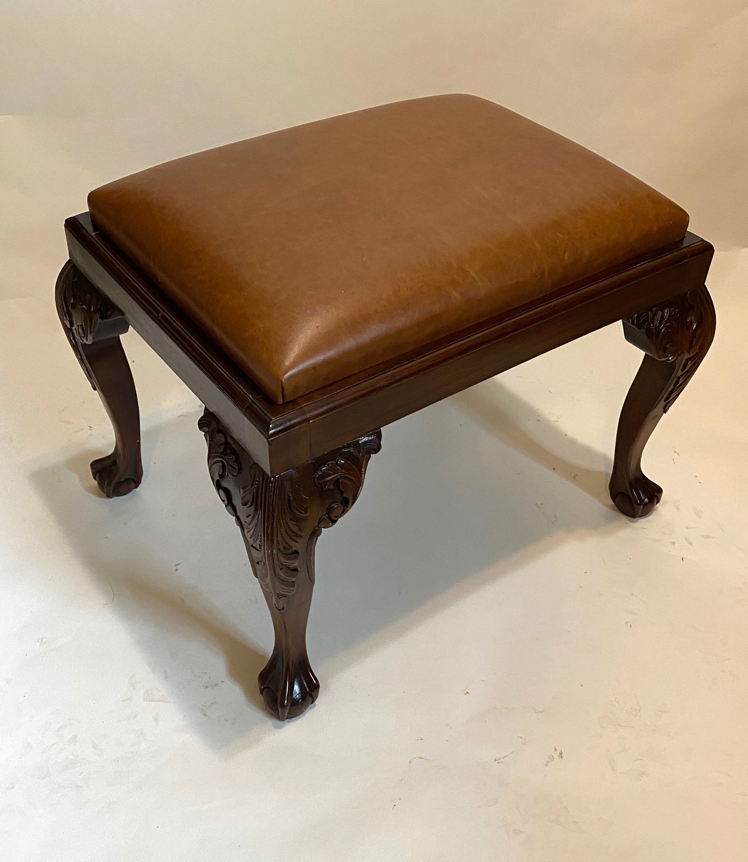 https://www.woodandhogan.com/inventory/chippendale-style-mahogany-stool-2/ Ball & Claw Chippendale Style Mahogany Stool Item #: WU-603 Dimensions: 25 1/2"W 19"D 19 1/2"H. Description: Mahogany Chippendale style stool with hand carved Ball & Claw legs and slip seat. Image Gallery: For additional product information, contact Wood & Hogan: 200 Lexington Avenue, Rm. 812, New York, NY, USA 10016-6101 (212) 532-7440, (212) 532-4640 FAX, sales@woodandhogan.com. Back You also might like: Regency Style Mahogany Bench. Mahogany Sheraton Style Window Seat Chippendale Style Mahogany Bench. Queen Anne Style Stool. Chippendale Style Mahogany Bench. Chippendale Style Mahogany Stool.