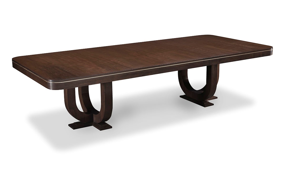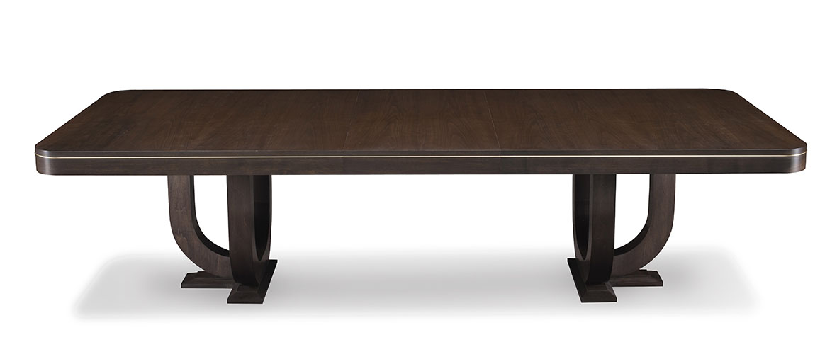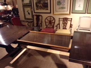 Stately Two Pedestal Extending Table with a Figured Walnut Top and a Generous Apron with Solid Brass Detail. The table expands to 118″L when the one leaf is in place. Leaf is stored in the table.