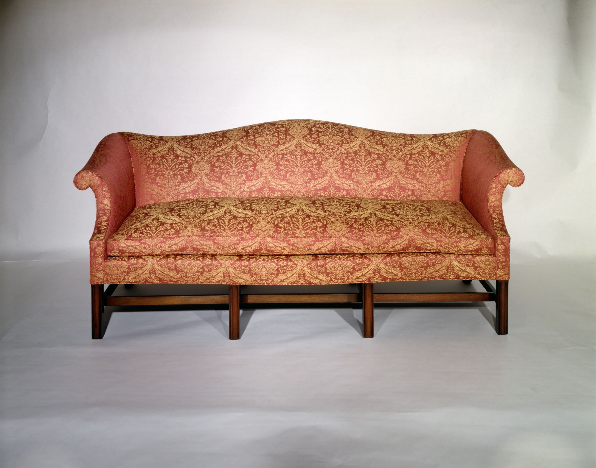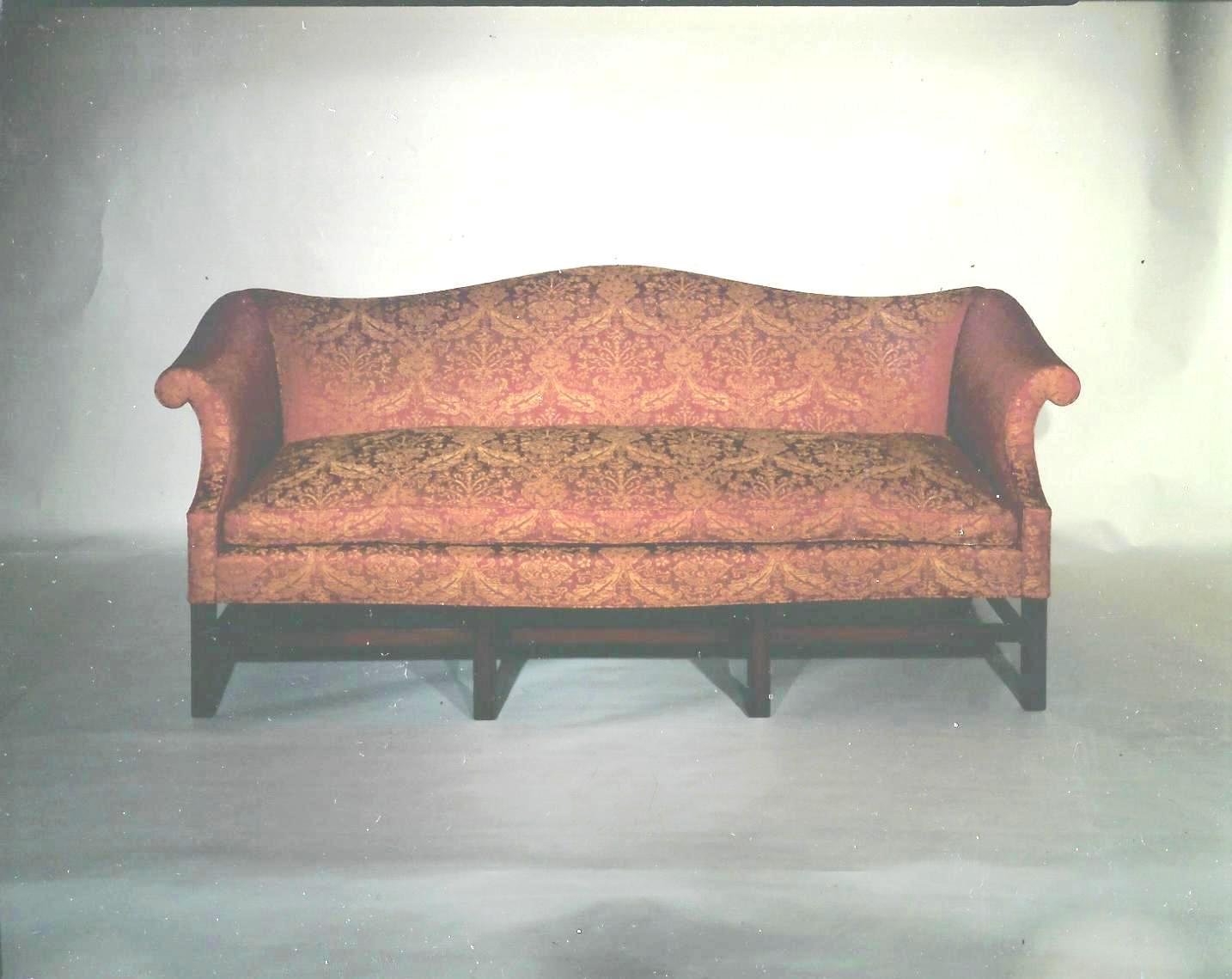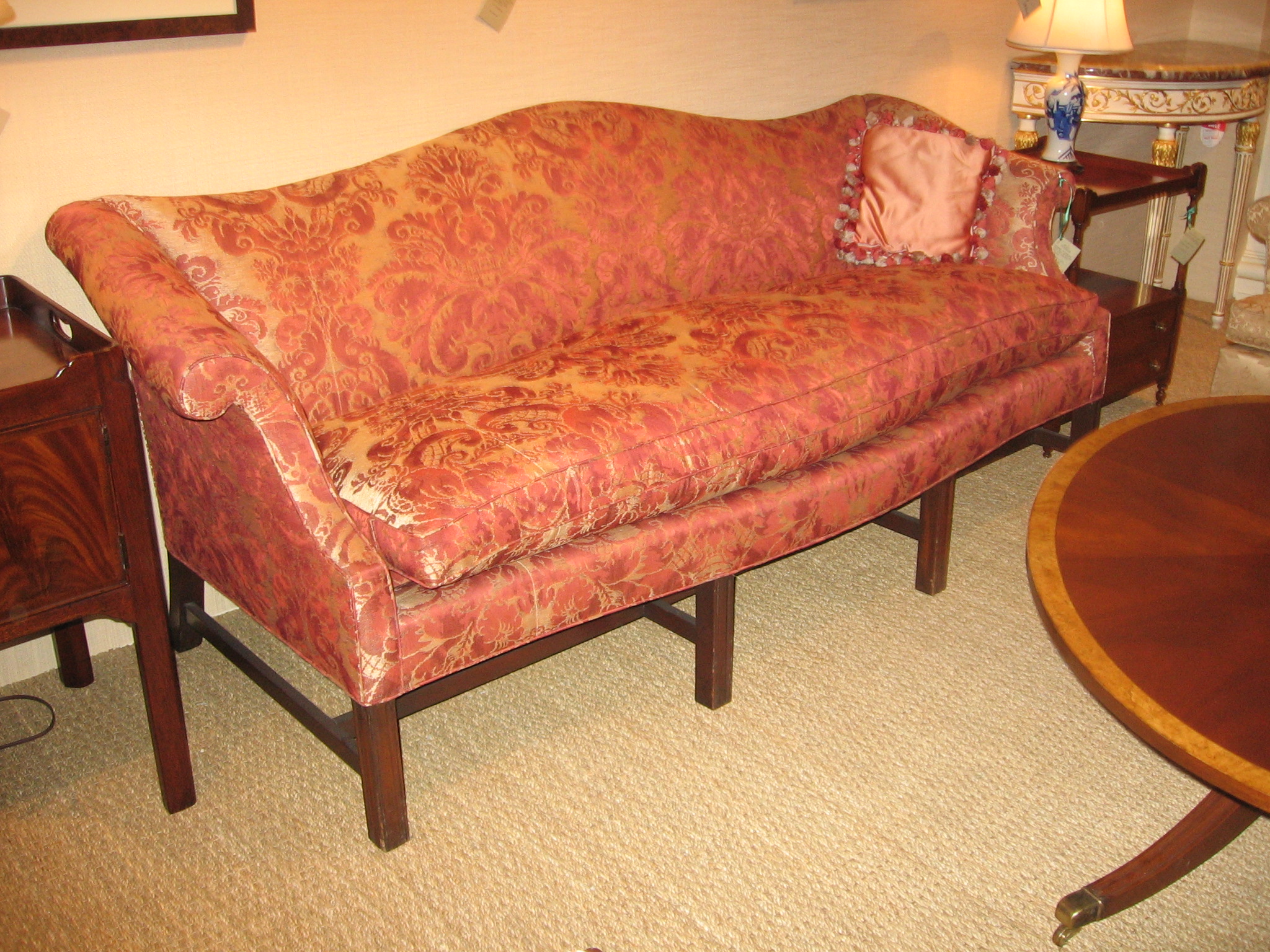 A classic settee with the strength and grace that characterizes the best of Chippendale’s work. This Mahogany sofa with a low undulating back on moulded legs with recessed stretcher. Cushion filled with 80% Goose Down – 20% Feather.