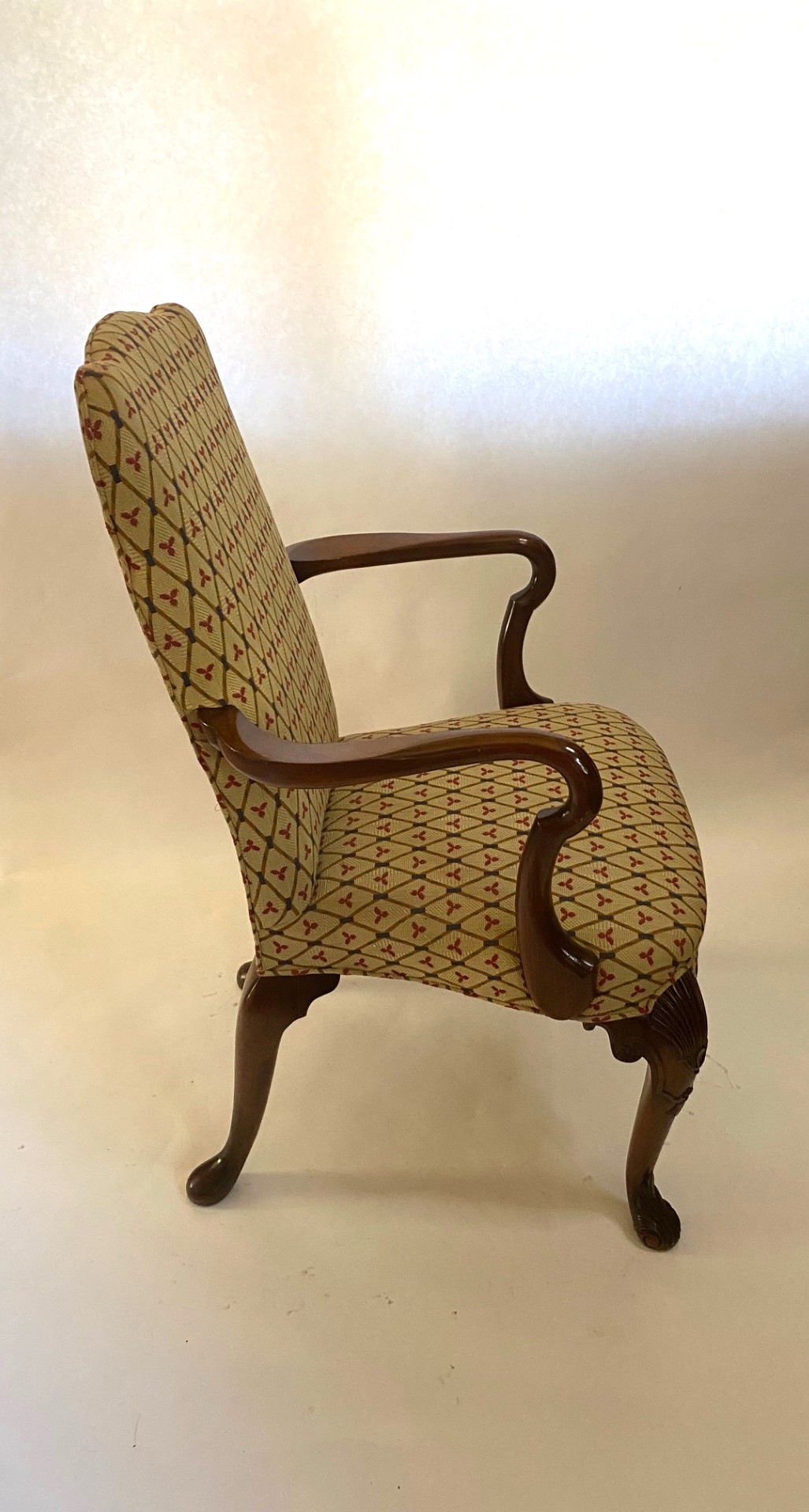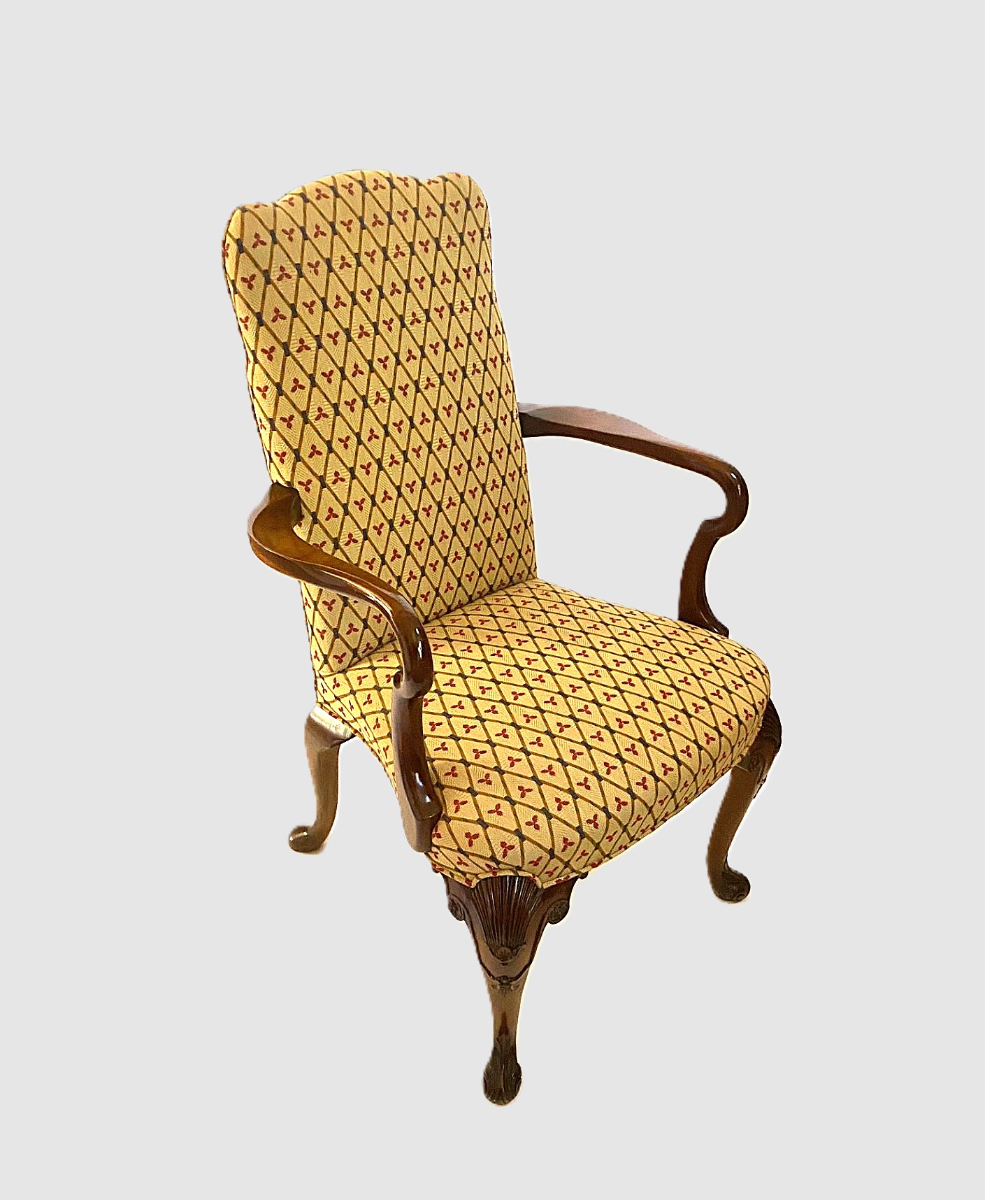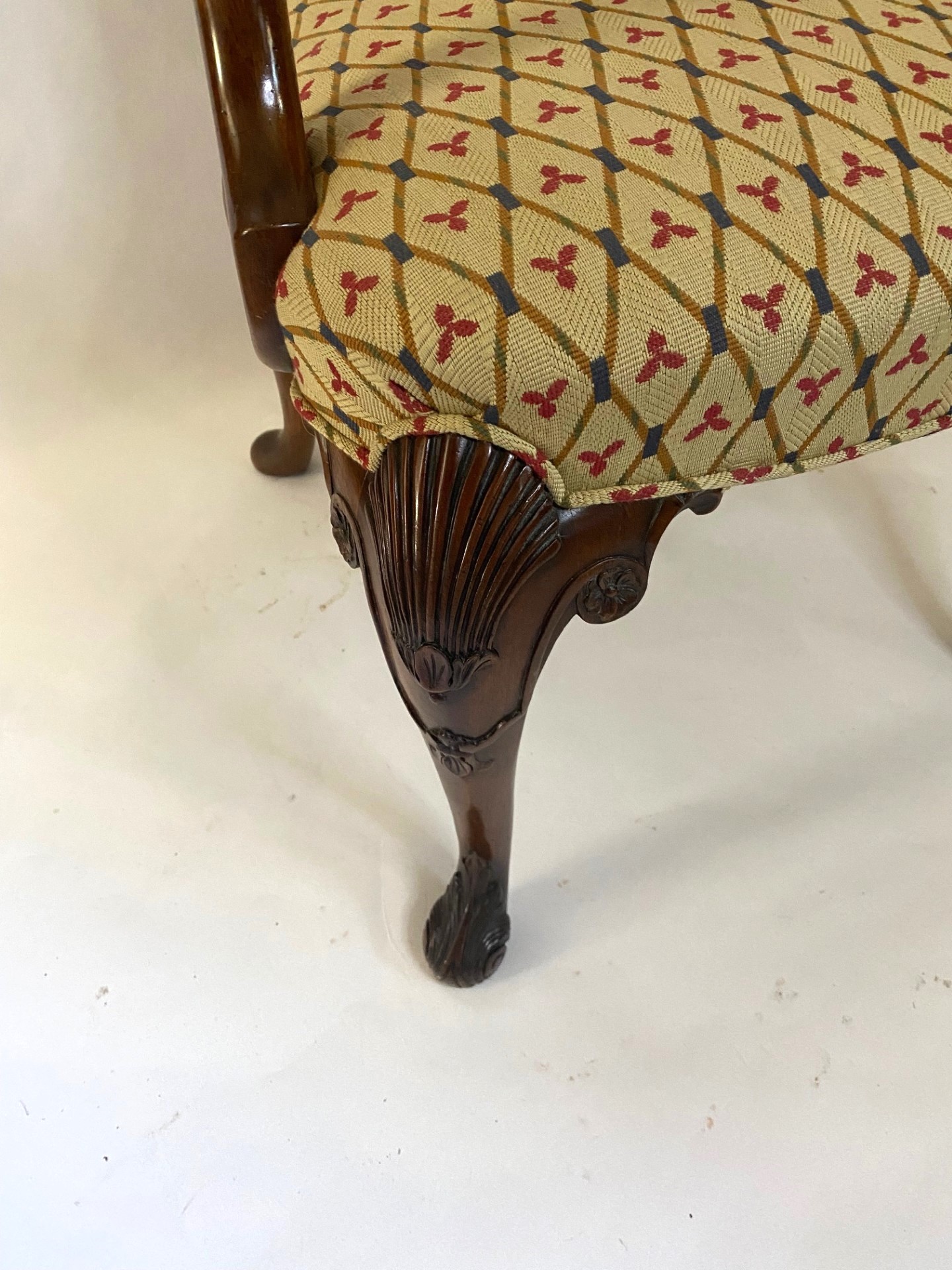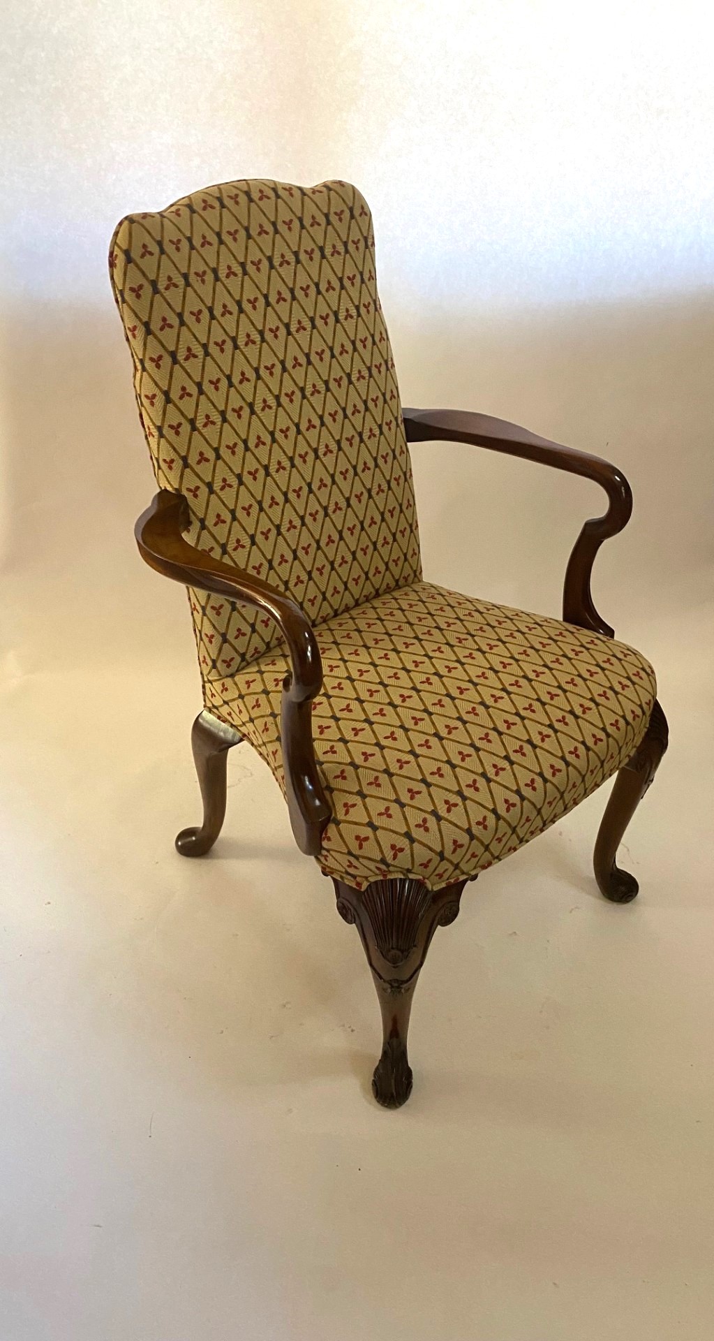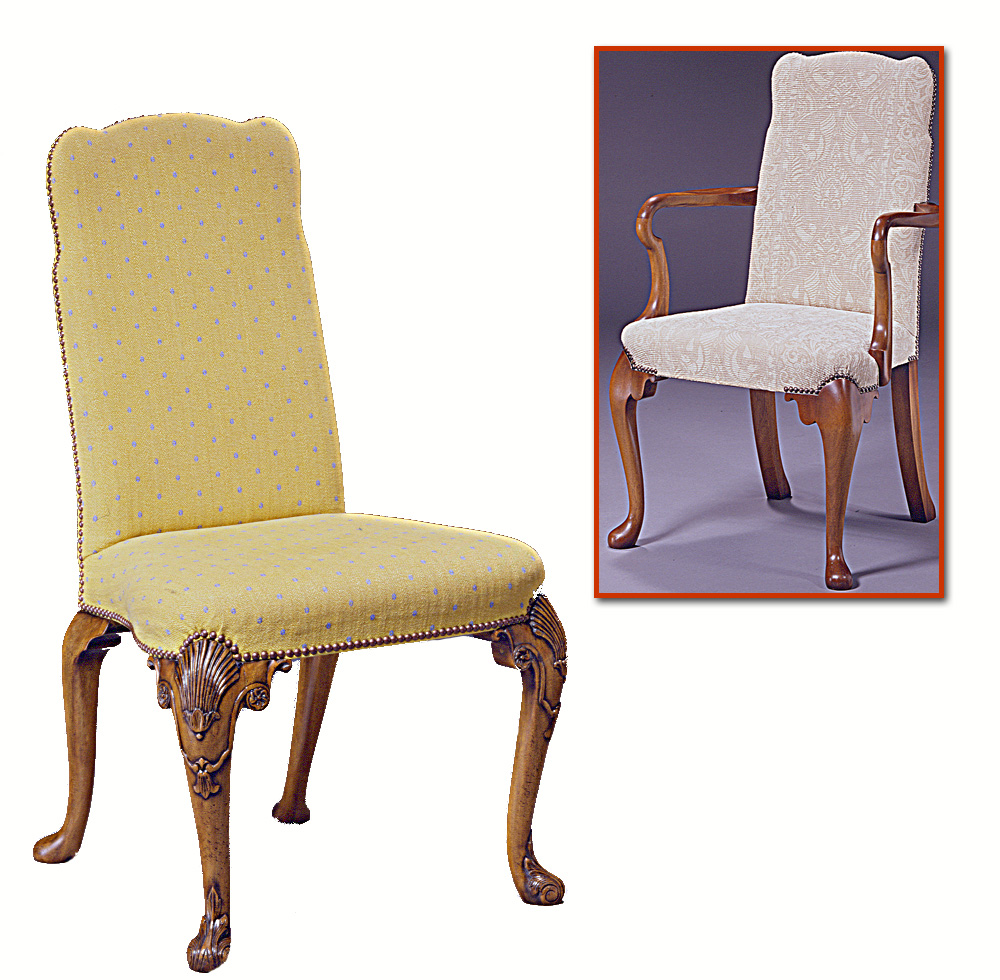 Walnut George I style Walnut chair featuring upholstered shaped seat and back on a acanthus hand carved cabriole front legs. Arm chair with carved ’Shepherd’s Crook’ arms. Also, avialable with plain front legs, Model B-2015P.