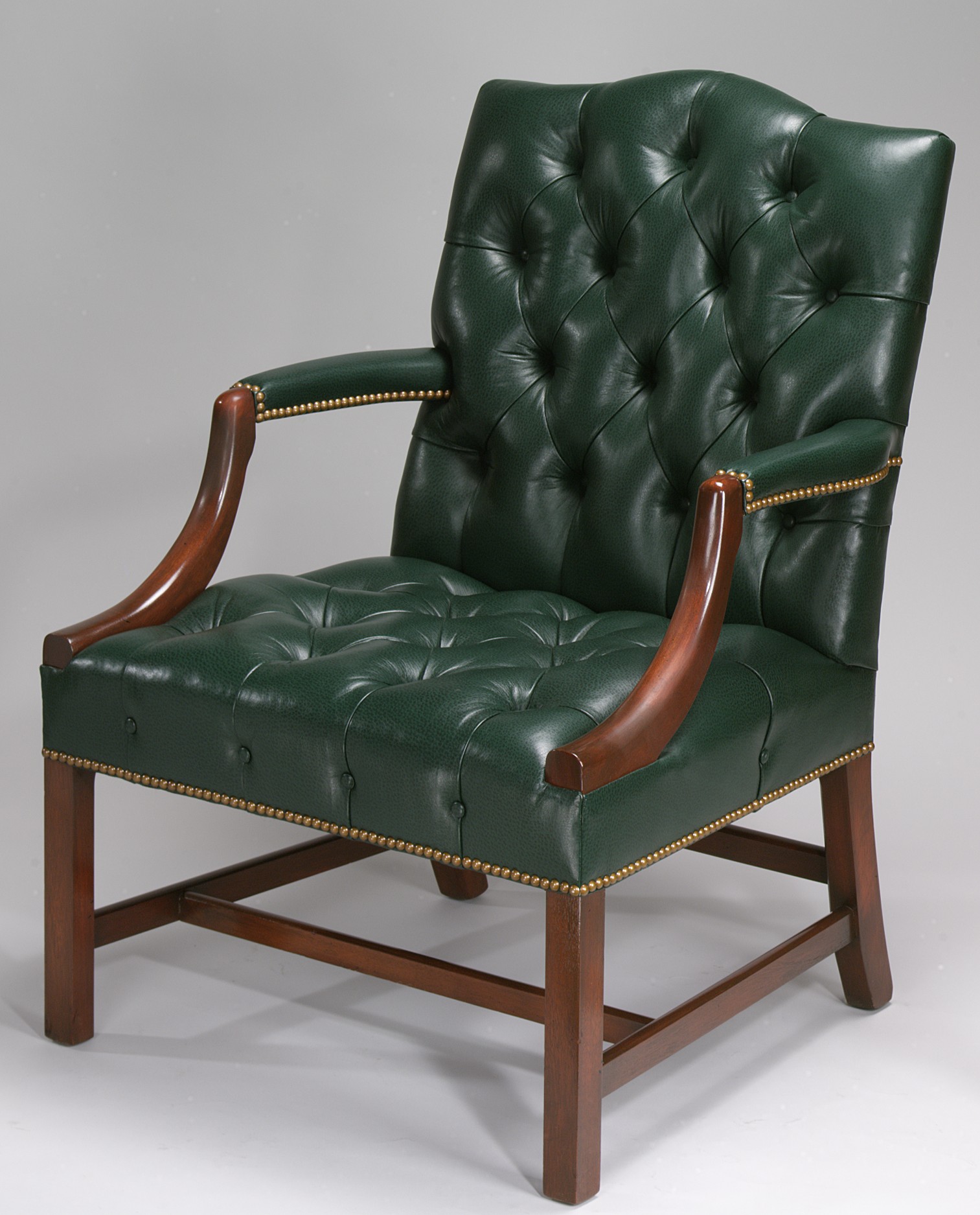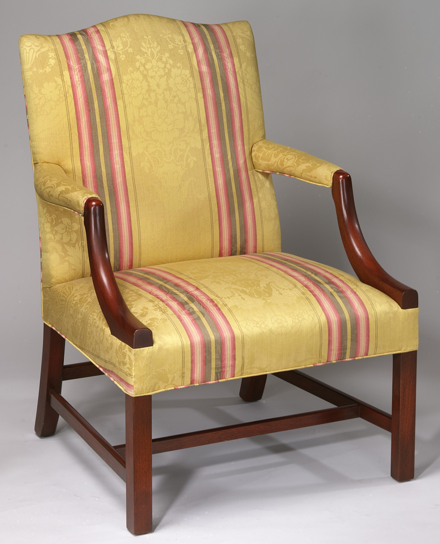 Mahogany “Gainborough” Style Open Arm Chair with serpentine shaped back on square legs with stretcher. Offered with and without diamond tufted seat and back. COM – 3 yards; 50″ plain. Tufted – 3 1/2 yards or 66 Sq. Ft.
