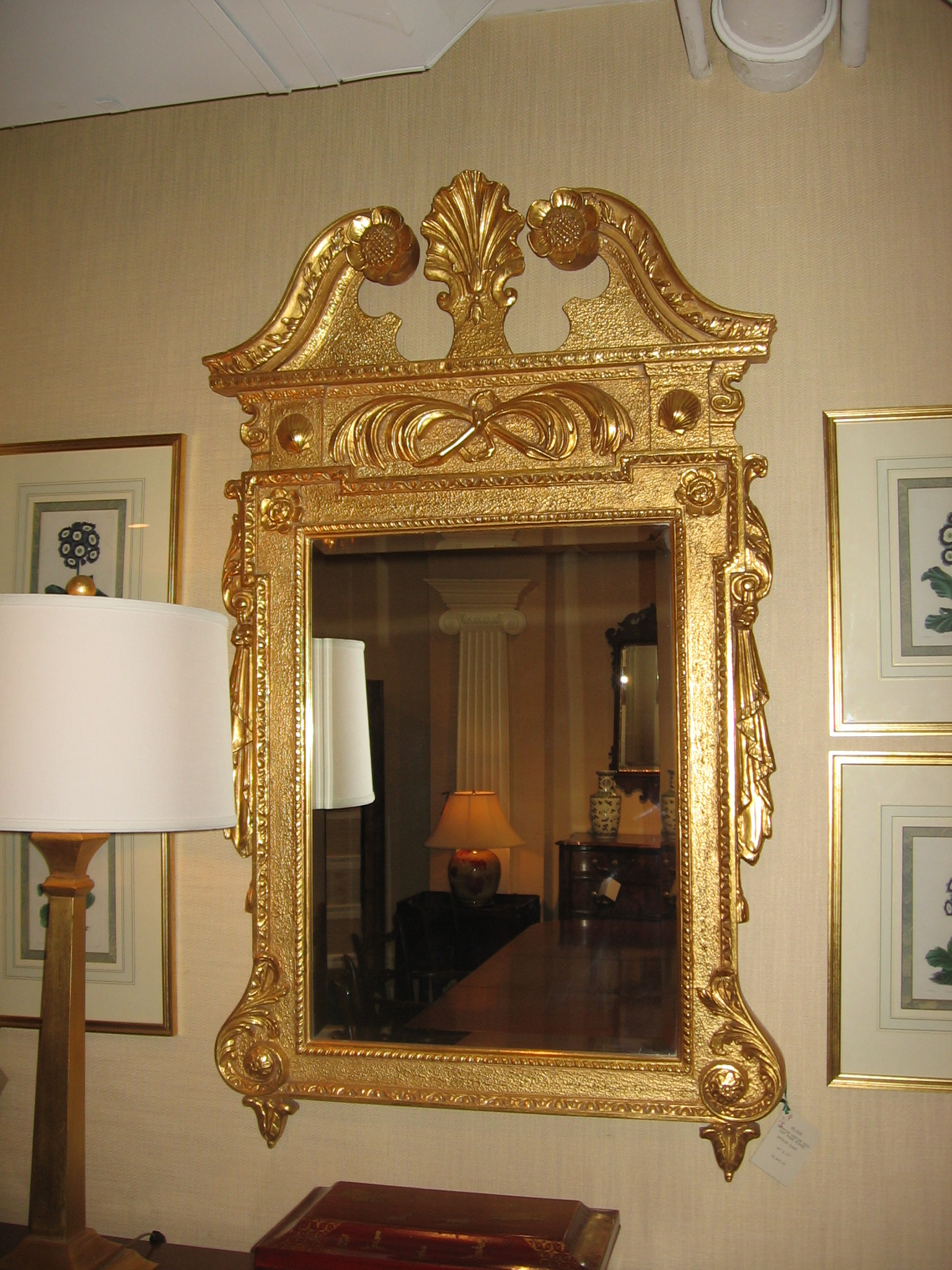 https://www.woodandhogan.com/inventory/georgian-style-gold-frame-mirror/ Georgian Style Gold Frame Mirror Item #: WH-2808 Dimensions: 34"W 57"H Description: Regal Georgian Style Gold Frame Mirror with Ornate Carved Detail and Bevel Glass. Image Gallery: For additional product information, contact Wood & Hogan: 200 Lexington Avenue, Rm. 812, New York, NY, USA 10016-6101 (212) 532-7440, (212) 532-4640 FAX, sales@woodandhogan.com. Back You also might like: Gilt Chinese Chippendale Mirror Antique Walnut & Brass Brazier Hand Carved English Pine Fire Surround Queen Anne Style Gold Leaf Mirror Carved Double Frame Mirror 19th Century Chintz Bath Suite