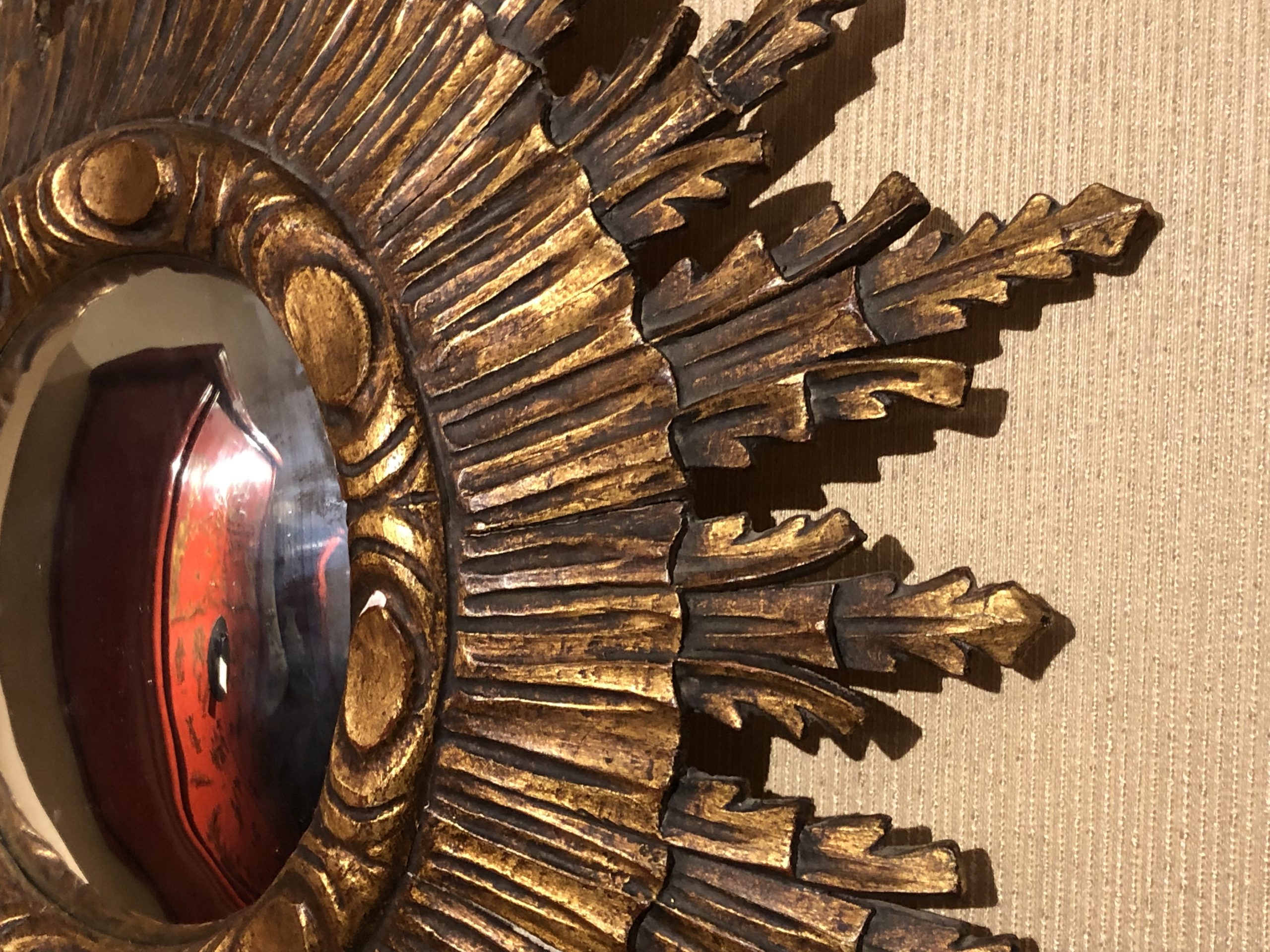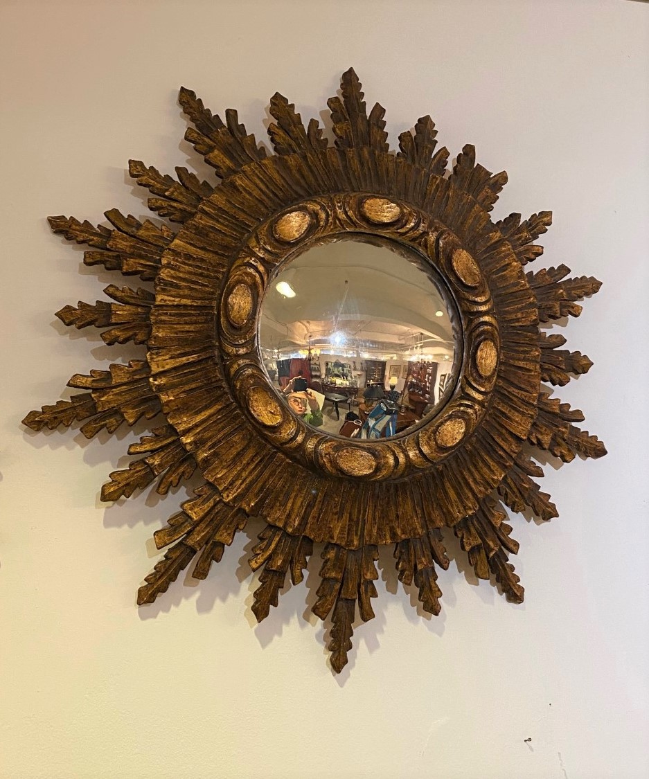 Large Old Carved and Tiered Giltwood Sunburst Convex Mirror