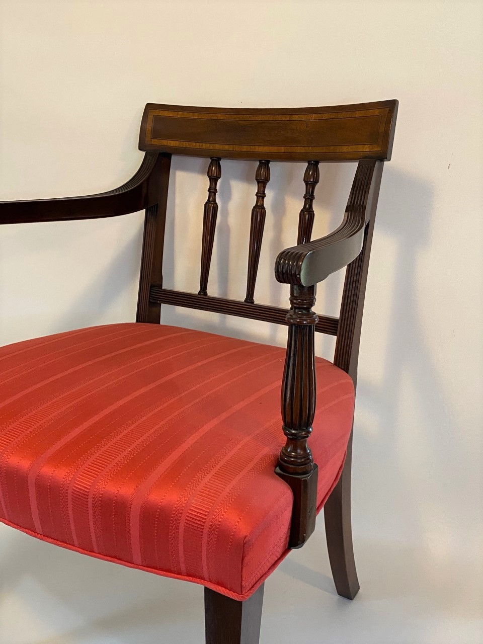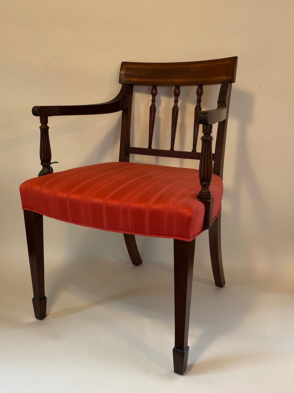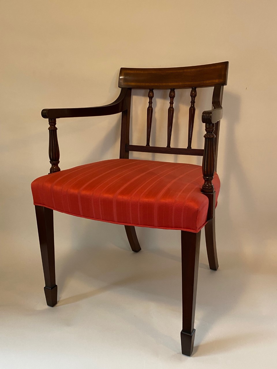 Mahogany dining chair in the Sheraton manner with Satinwood inlay to curved top rail, turned spindles and fully upholstered seat on tapered front legs with spade feet.