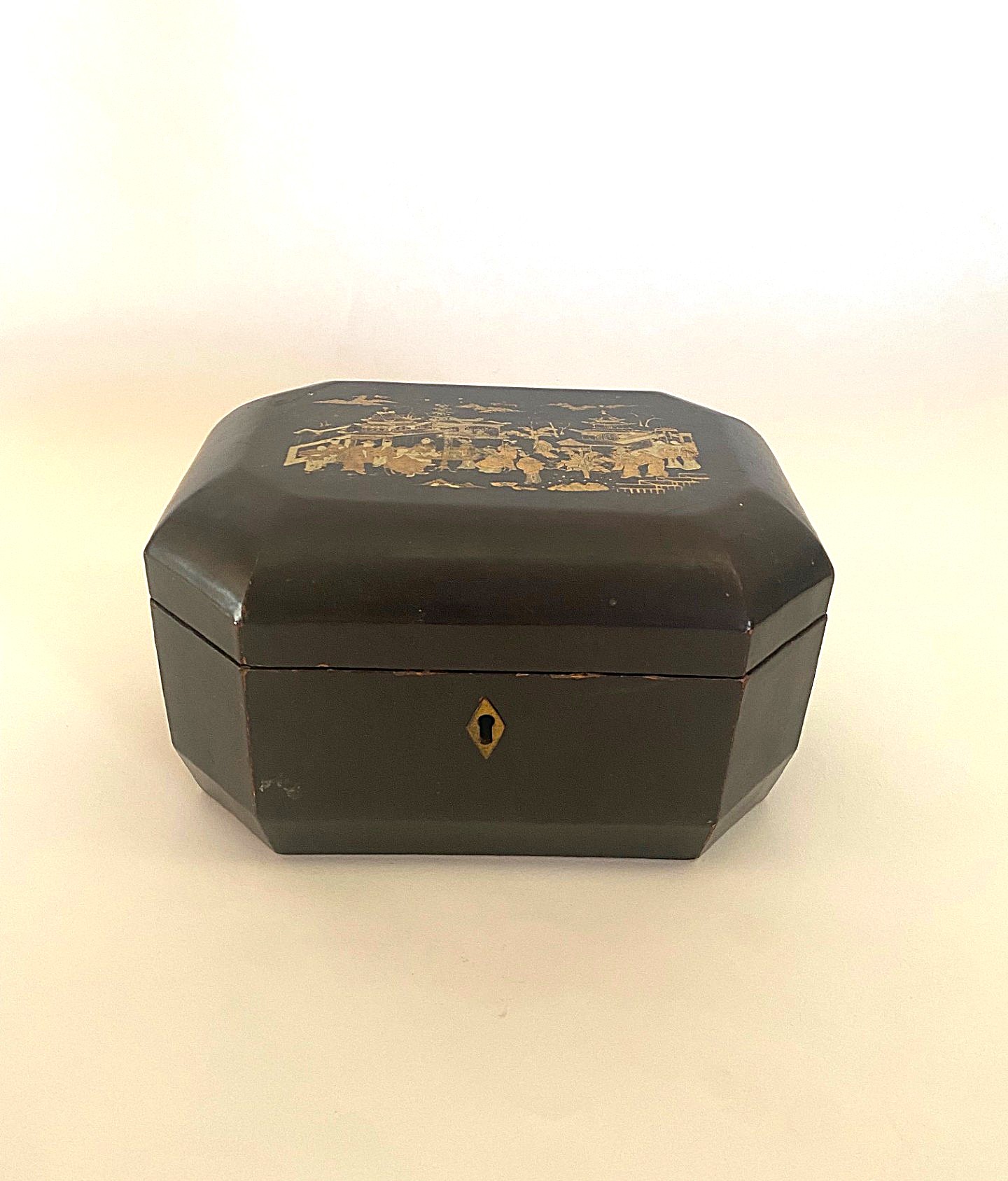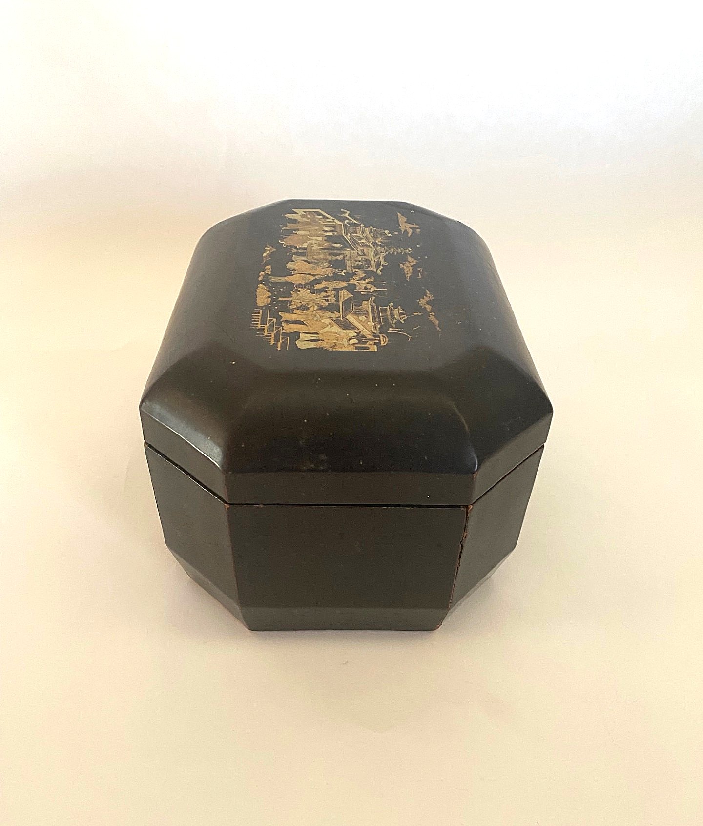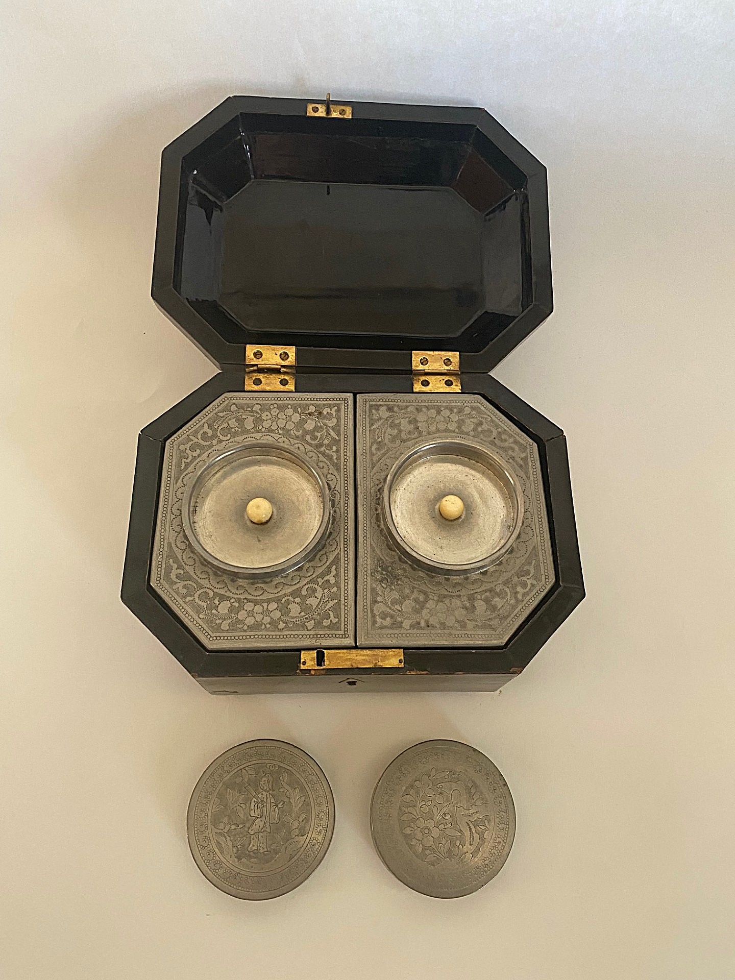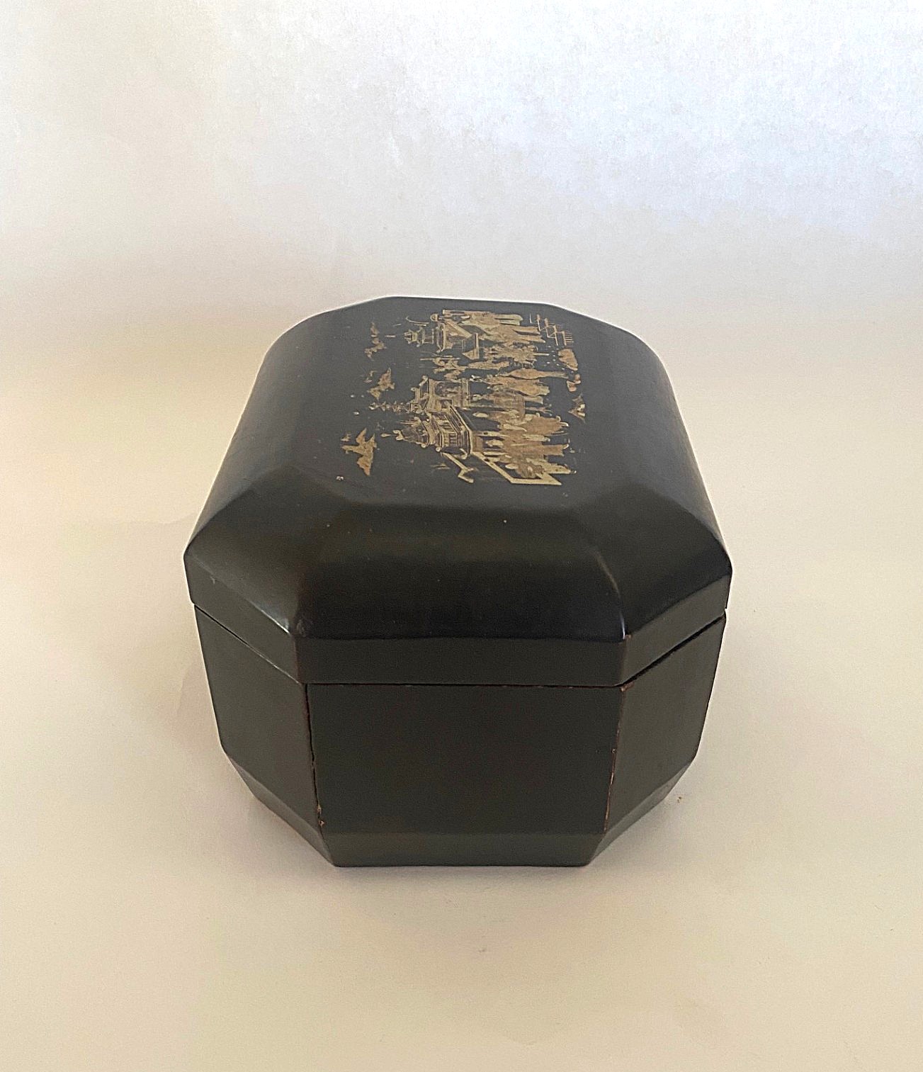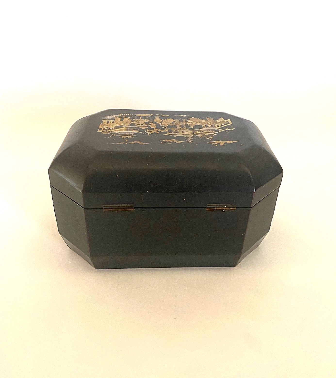https://www.woodandhogan.com/inventory/old-black-lacquered-decorated-tea-caddy/ Old Black Lacquered Decorated Tea Caddy Item #: WH-3422 Dimensions: 9 1/2"W 7"D 5"H Description: Old Black Lacquered Hand-Painted Decorated Tea Caddy with Etched Decorated Interior Liners Status: Antique Image Gallery: For additional product information, contact Wood & Hogan: 200 Lexington Avenue, Rm. 812, New York, NY, USA 10016-6101 (212) 532-7440, (212) 532-4640 FAX, sales@woodandhogan.com. Back You also might like: Mid Century Tiered and Gilt Sunburst Mirror from France Queen Anne Style Gold Leaf Mirror 19th Century Cast Iron Umbrella Stand Georgian Style Gold Frame Mirror Old Black Lacquered Decorated Tea Caddy Old Carved Oak Convex Mirror