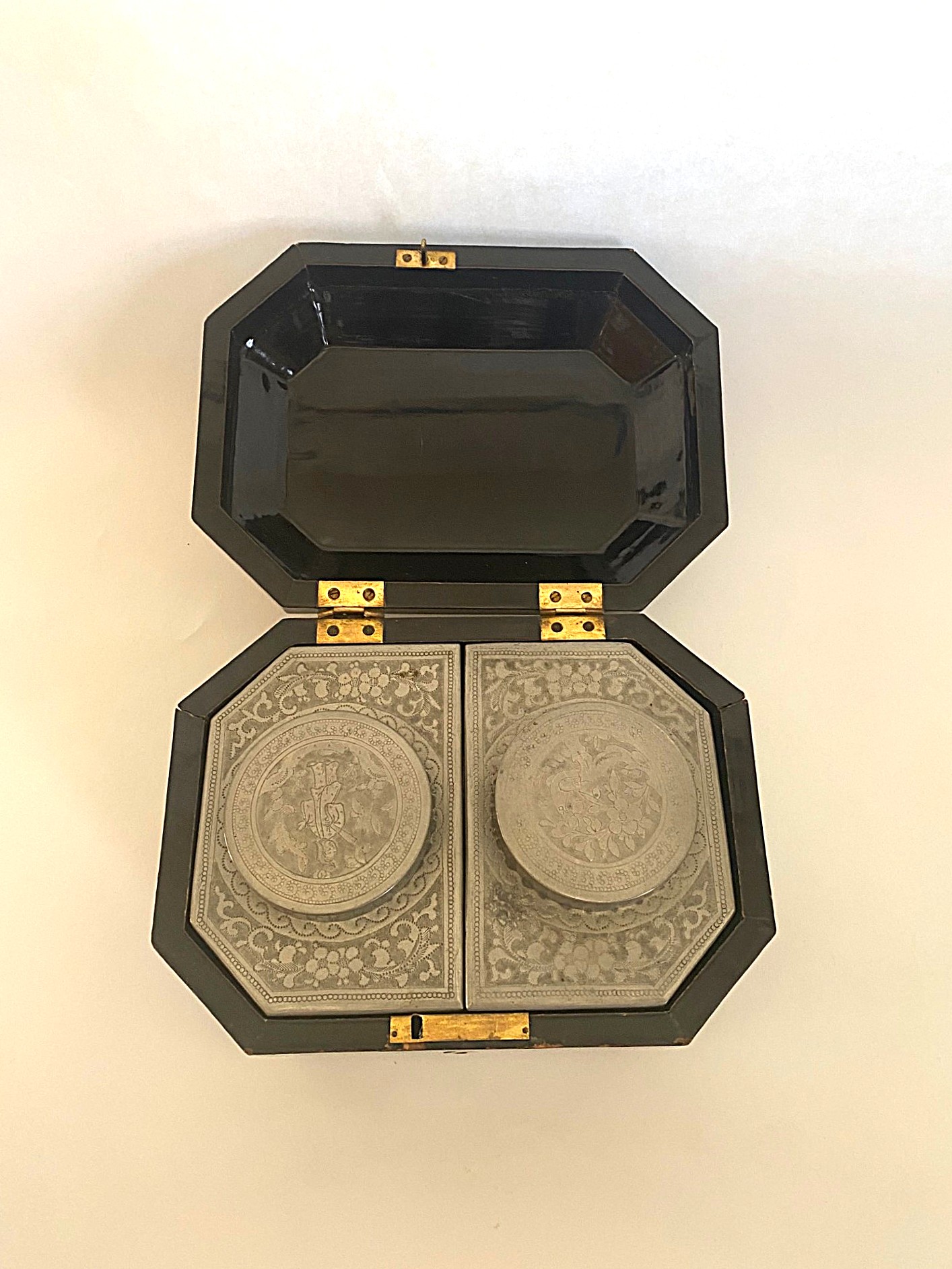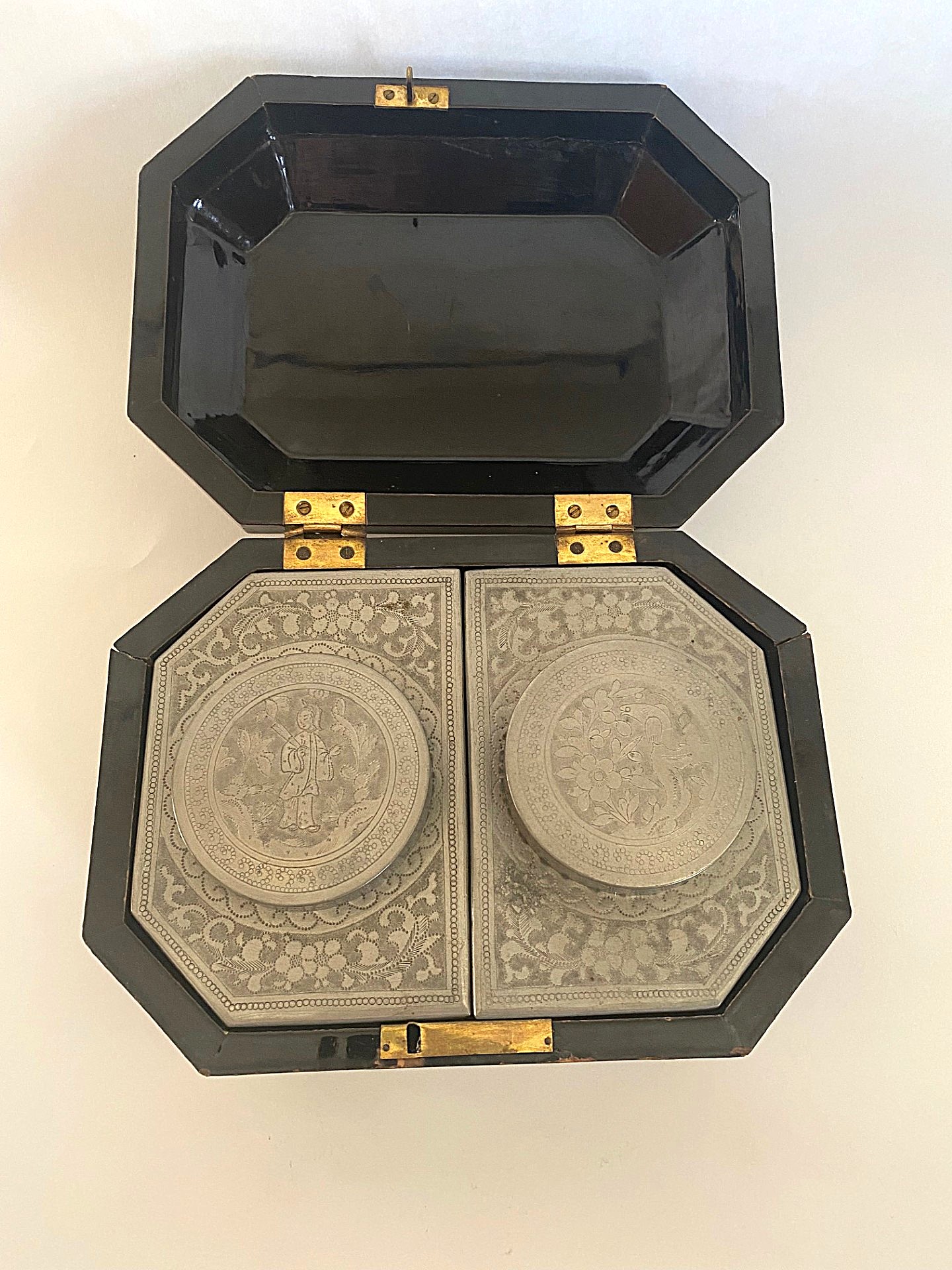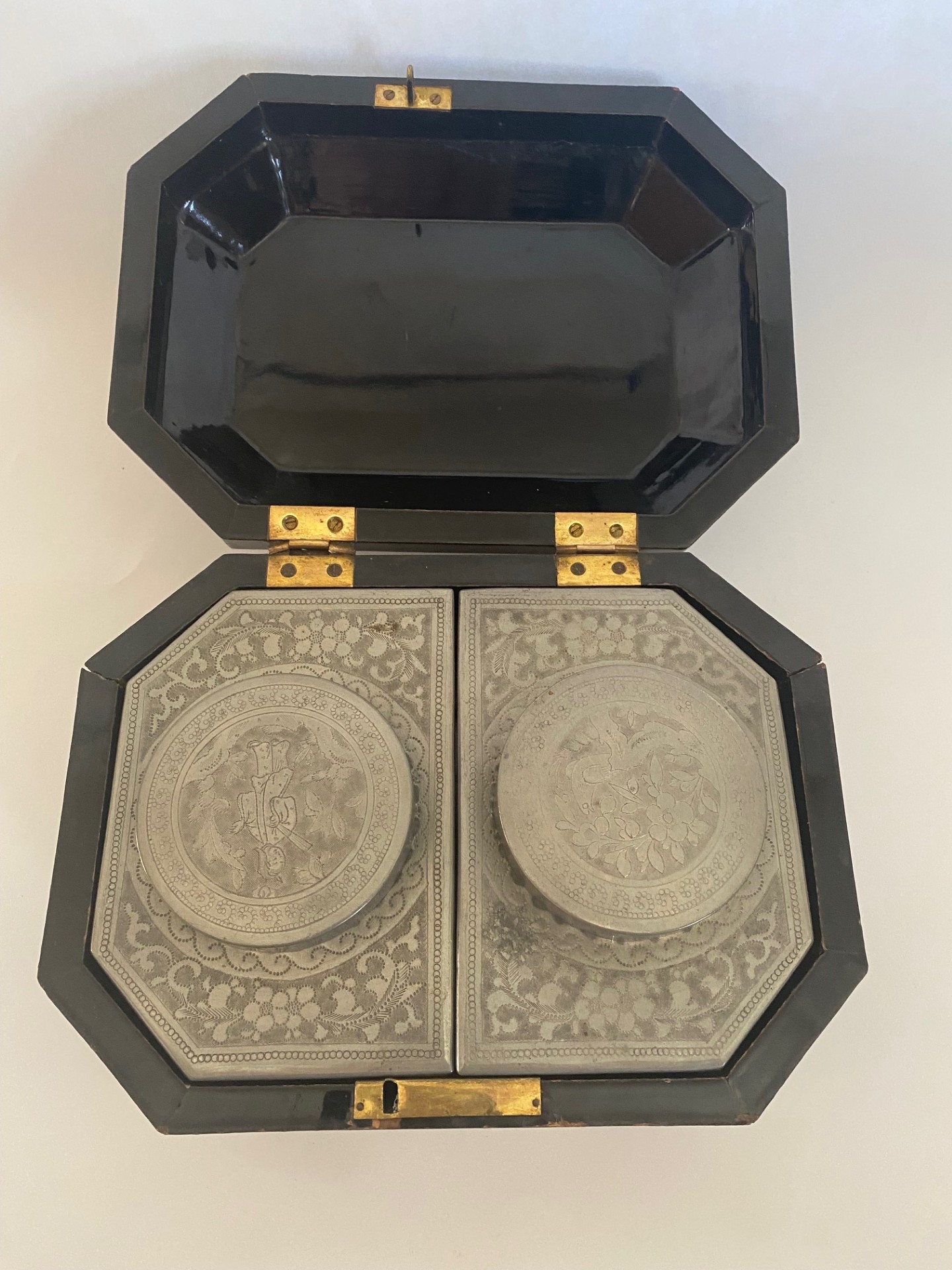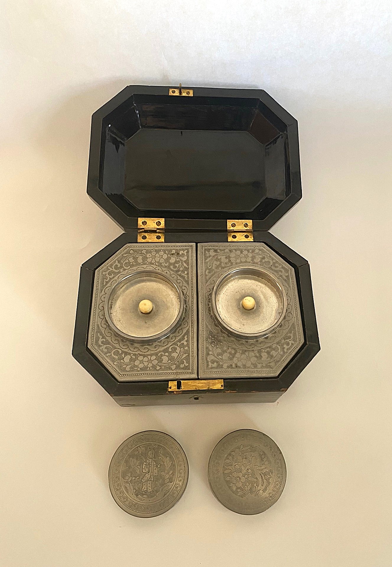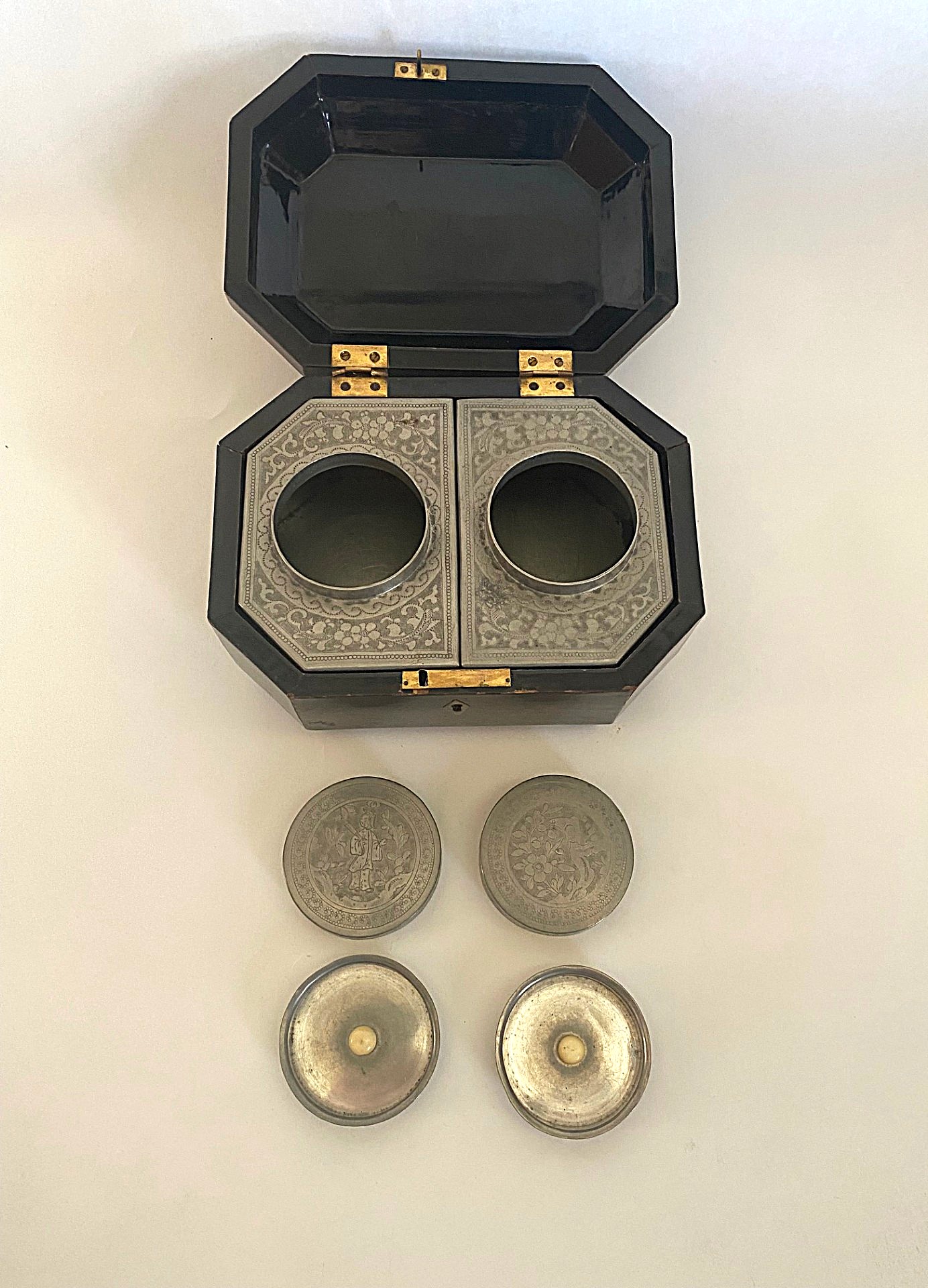 https://www.woodandhogan.com/inventory/old-black-lacquered-decorated-tea-caddy/ Old Black Lacquered Decorated Tea Caddy Item #: WH-3422 Dimensions: 9 1/2"W 7"D 5"H Description: Old Black Lacquered Hand-Painted Decorated Tea Caddy with Etched Decorated Interior Liners Status: Antique Image Gallery: For additional product information, contact Wood & Hogan: 200 Lexington Avenue, Rm. 812, New York, NY, USA 10016-6101 (212) 532-7440, (212) 532-4640 FAX, sales@woodandhogan.com. Back You also might like: Mid Century Tiered and Gilt Sunburst Mirror from France Queen Anne Style Gold Leaf Mirror 19th Century Cast Iron Umbrella Stand Georgian Style Gold Frame Mirror Old Black Lacquered Decorated Tea Caddy Old Carved Oak Convex Mirror