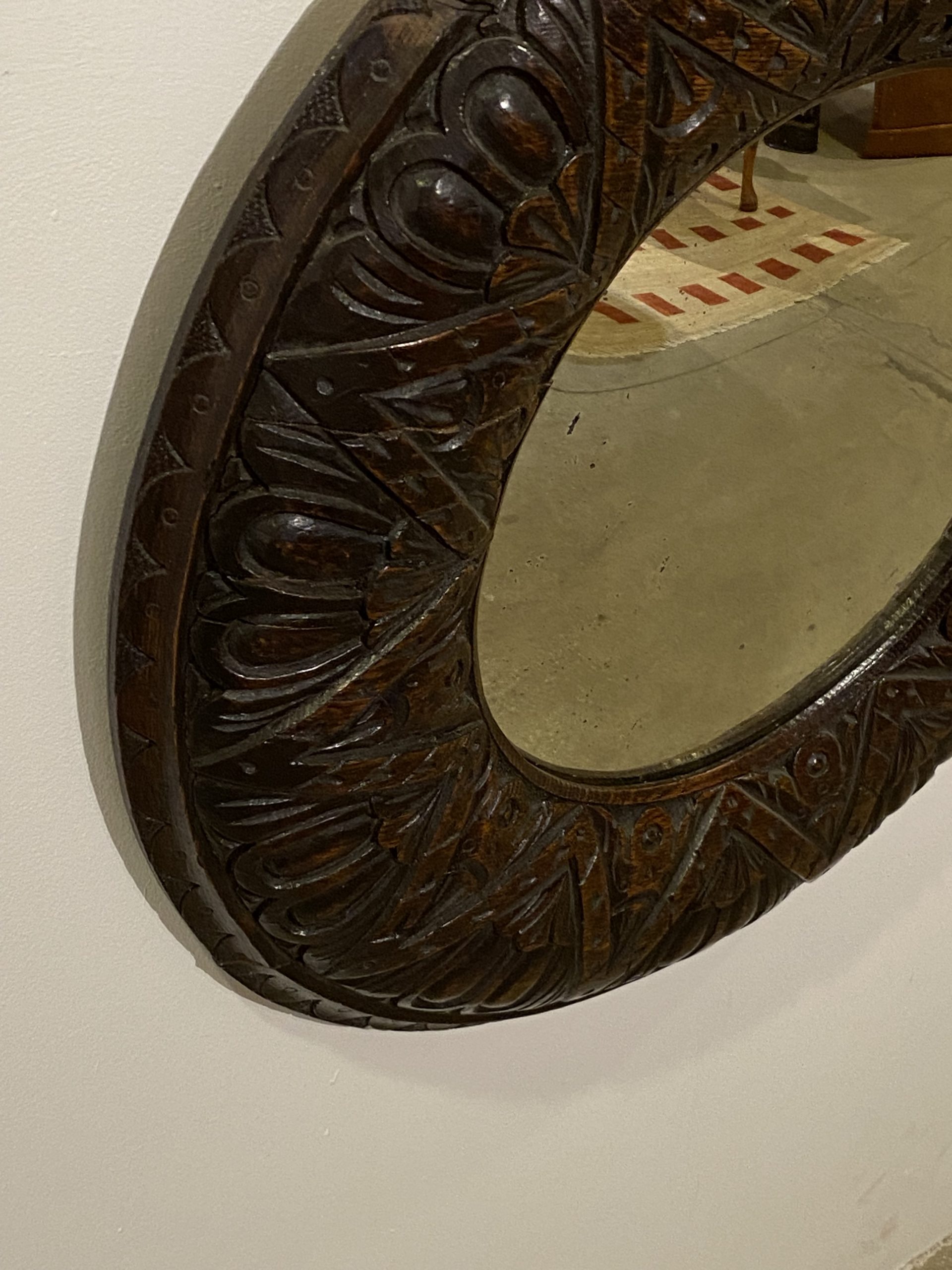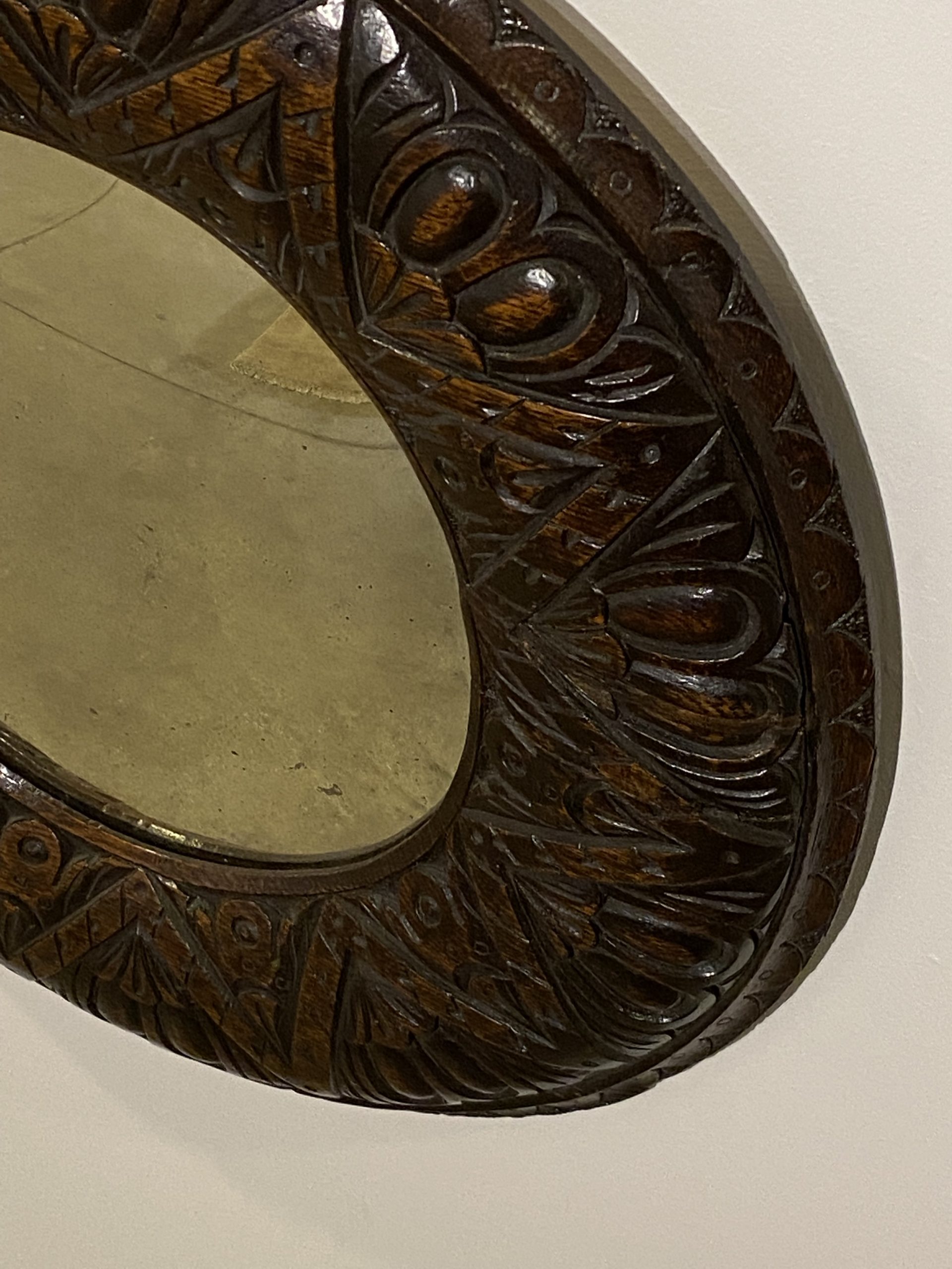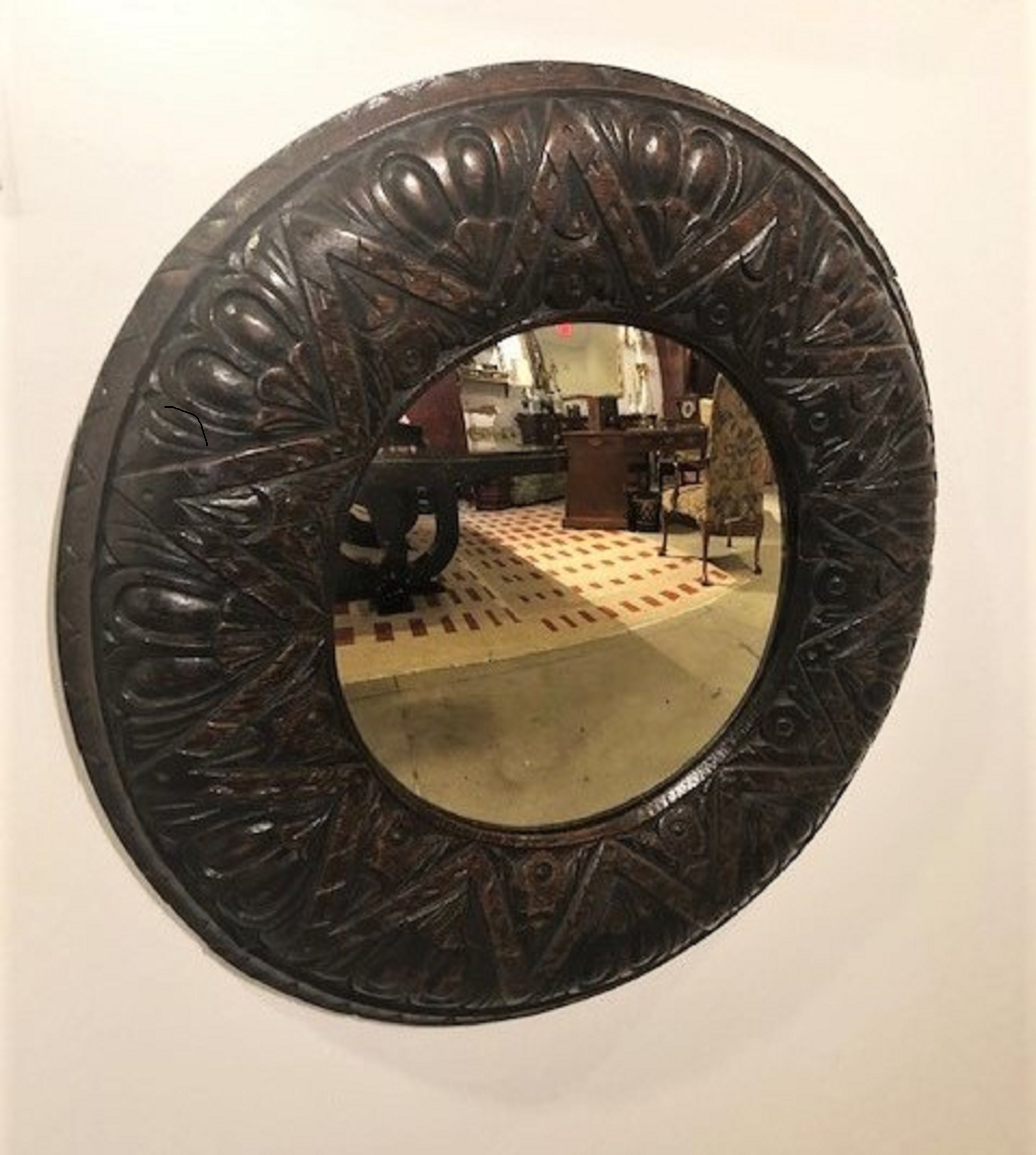 https://www.woodandhogan.com/inventory/old-carved-oak-convex-mirror/ Old Carved Oak Convex Mirror Item #: WH-4664 Dimensions: 26" Diameter Description: Old Carved Oak Convex Mirror from England. Overall-26″ Diameter; Mirror-13″ Diameter. Status: Antique Image Gallery: For additional product information, contact Wood & Hogan: 200 Lexington Avenue, Rm. 812, New York, NY, USA 10016-6101 (212) 532-7440, (212) 532-4640 FAX, sales@woodandhogan.com. Back You also might like: Large Old Carved and Tiered Giltwood Sunburst Convex Mirror Antique Walnut Trunbridge Parquetry Box 19th Century English Brass and Iron Decorative Fire Grate Basket Old Majolica Asparagus Dish & Stand Hand Carved English Pine Fire Surround Mahogany & Gilt Mirror