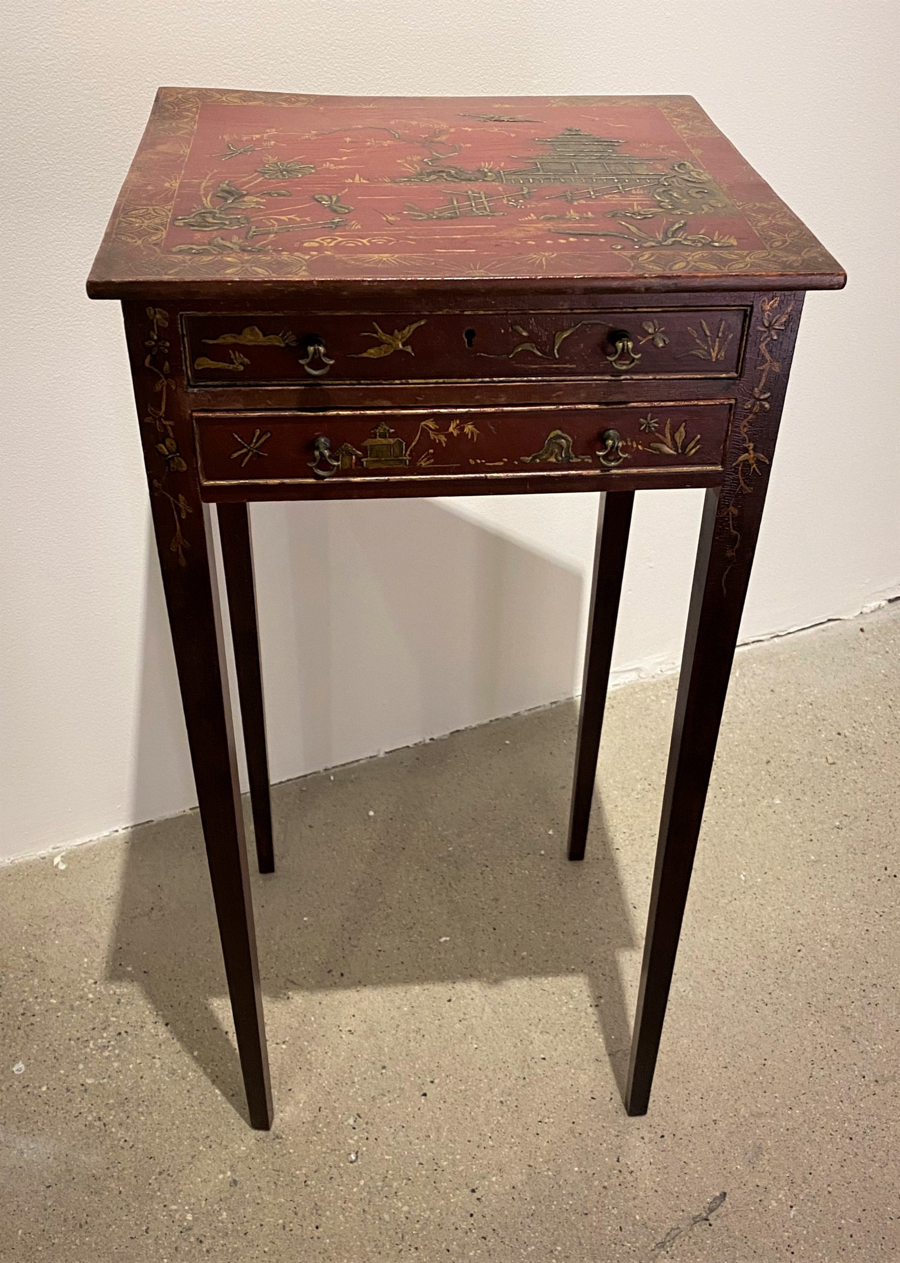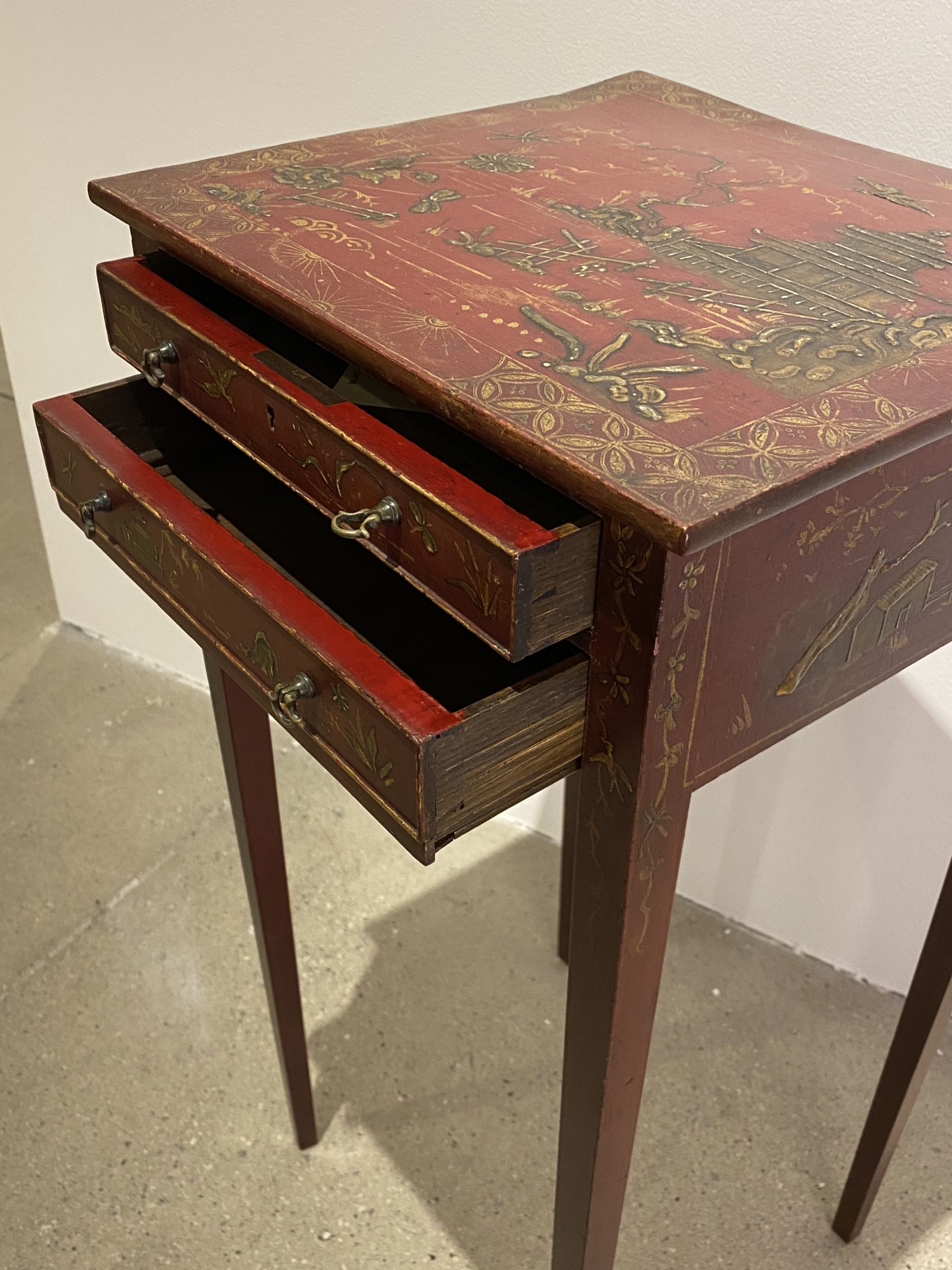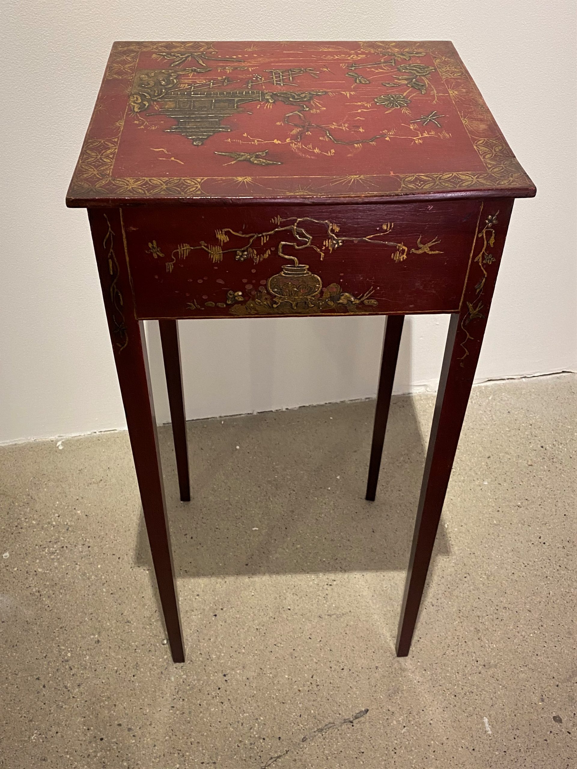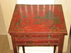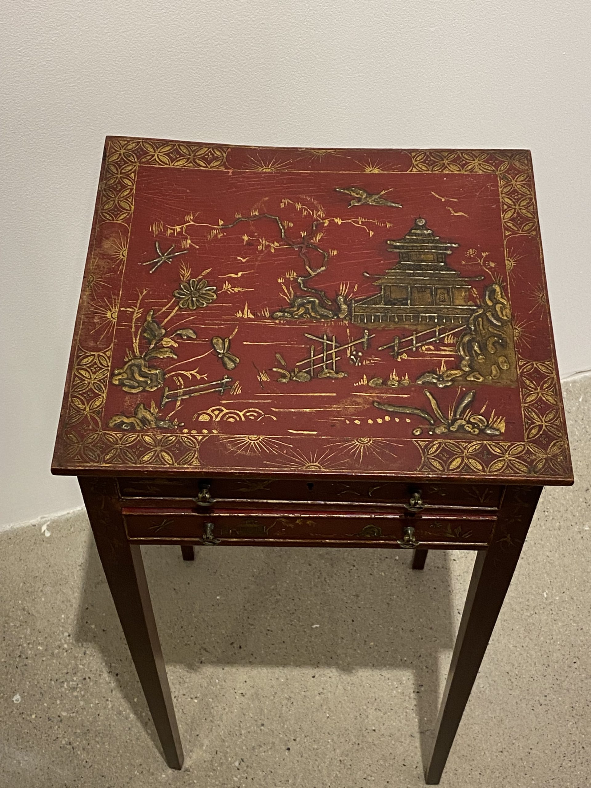 https://www.woodandhogan.com/inventory/old-red-lacquered-decorated-table/ Old Red Lacquered Decorated Table Item #: WH-4080 Dimensions: 14W 13"D 28"H Description: Old Red Lacquered Table With Chinoiserie Decoration and Two Drawers. Status: Antique Image Gallery: For additional product information, contact Wood & Hogan: 200 Lexington Avenue, Rm. 812, New York, NY, USA 10016-6101 (212) 532-7440, (212) 532-4640 FAX, sales@woodandhogan.com. Back You also might like: Mahogany Coffee Table in the Chippendale Manner. Mahogany George III Style Bow End Credenza. Mahogany Georgian Style Breakfront Bookcase Walnut George I Style Side Table Mahogany Chippendale Style Console Table. Chippendale Style Mahogany End Table.