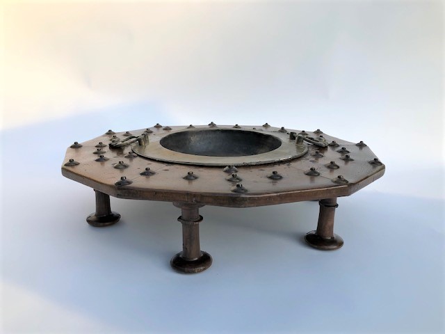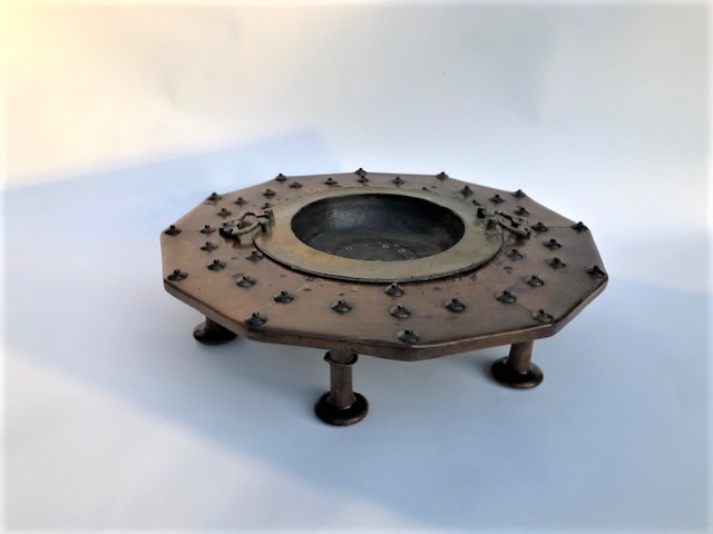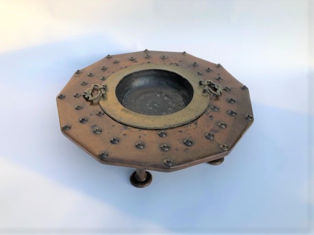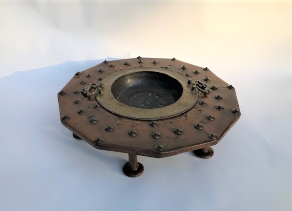 https://www.woodandhogan.com/inventory/old-walnut-brass-brazier/ Antique Walnut & Brass Brazier Item #: WH-2382 Dimensions: 24" Diameter 8"H Description: Antique Walnut & Brass Brazier of Mid-Eastern Origins. Removable Brass Tray with Shaped Brass Handles. Status: Antique Image Gallery: For additional product information, contact Wood & Hogan: 200 Lexington Avenue, Rm. 812, New York, NY, USA 10016-6101 (212) 532-7440, (212) 532-4640 FAX, sales@woodandhogan.com. Back You also might like: Set of 3 Framed 18th Century Copper Engravings 19th C. Teak Campaign Box Adam Style Gilt Frame Mirror Large Old Carved and Tiered Giltwood Sunburst Convex Mirror Country Pine Mirror Antique Walnut & Brass Brazier