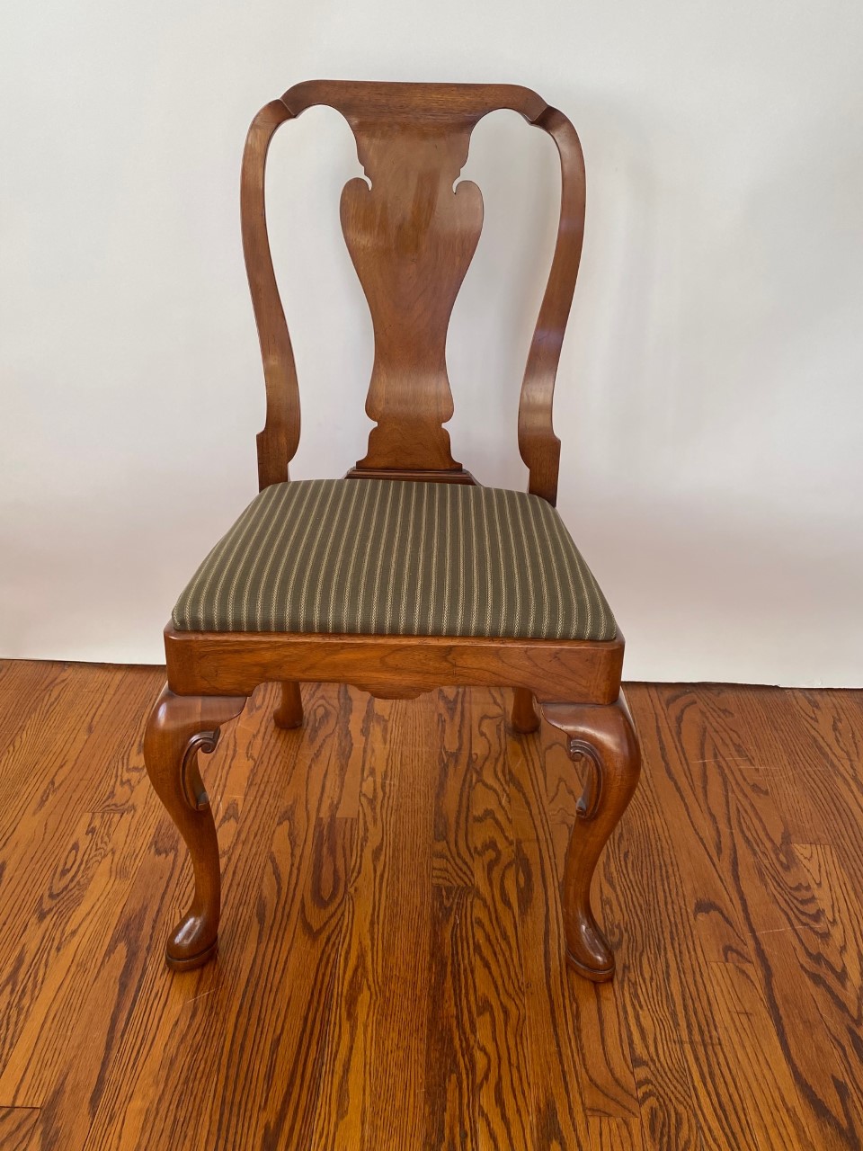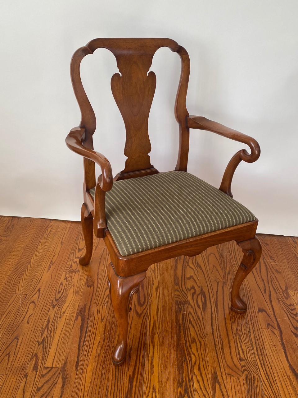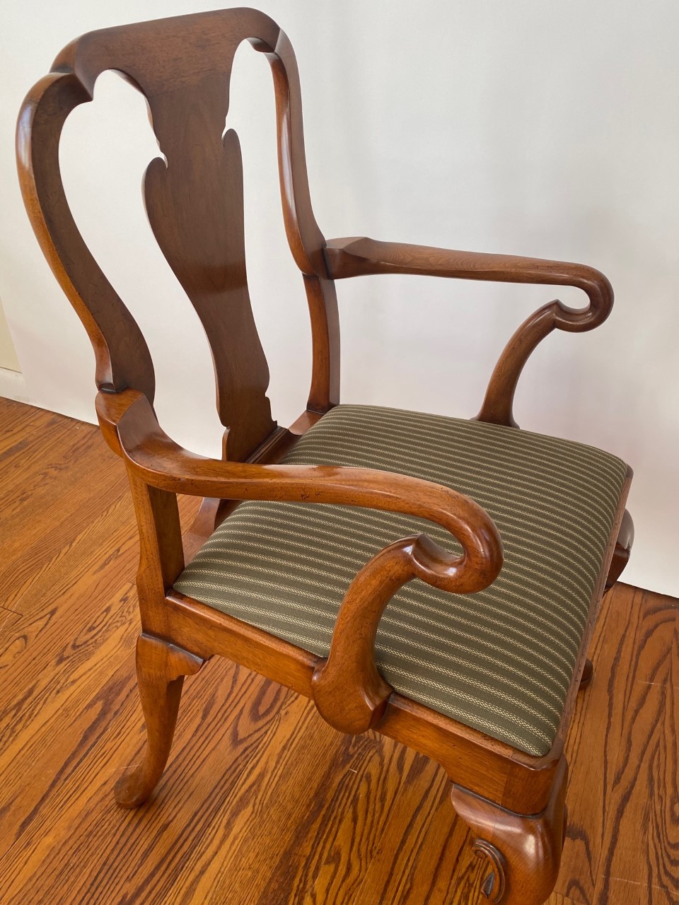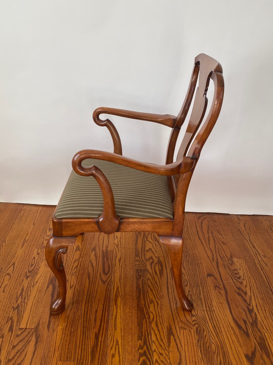 https://www.woodandhogan.com/inventory/queen-anne-style-dining-chair/ Queen Anne Style Dining Chair Item #: B-1328W Dimensions: Side - 22"W 38 1/2"H. Arm - 23 1/2"W 39"H. Description: Queen Anne style dining chair with figured shaped back splat and slip seat on hand carved cabriole legs. COM: 2/3 Yard/Chair. Image Gallery: For additional product information, contact Wood & Hogan: 200 Lexington Avenue, Rm. 812, New York, NY, USA 10016-6101 (212) 532-7440, (212) 532-4640 FAX, sales@woodandhogan.com. Back You also might like: Mahogany Chippendale Arm Chair Queen Anne Style Dining Chair Mahogany George III Style ’Sun Burst’ Chairs. Mahogany Chippendale Style Chairs Upholstered Queen Anne Style Chair. 17th Century Style Oak High Back Side & Arm Chair
