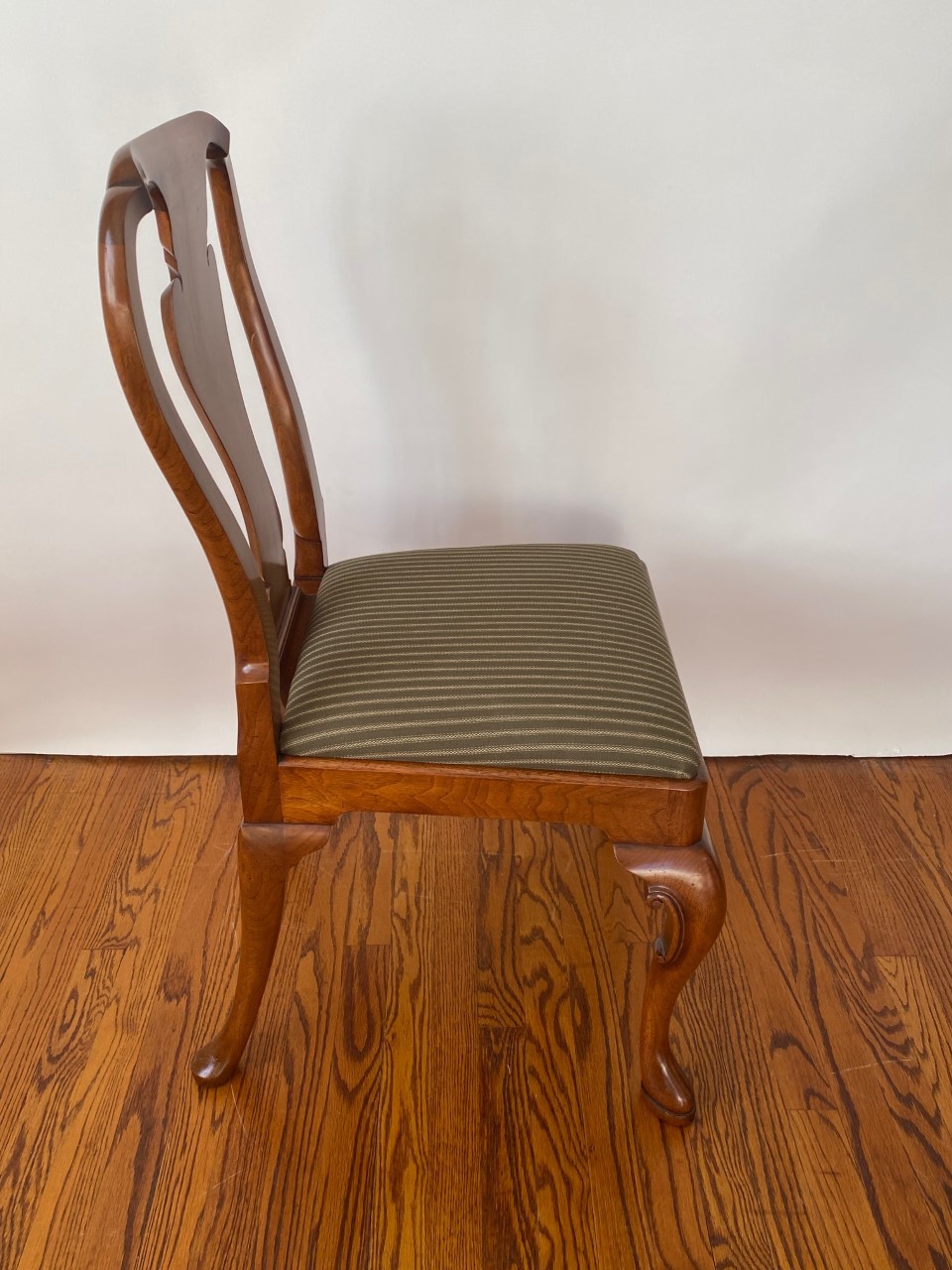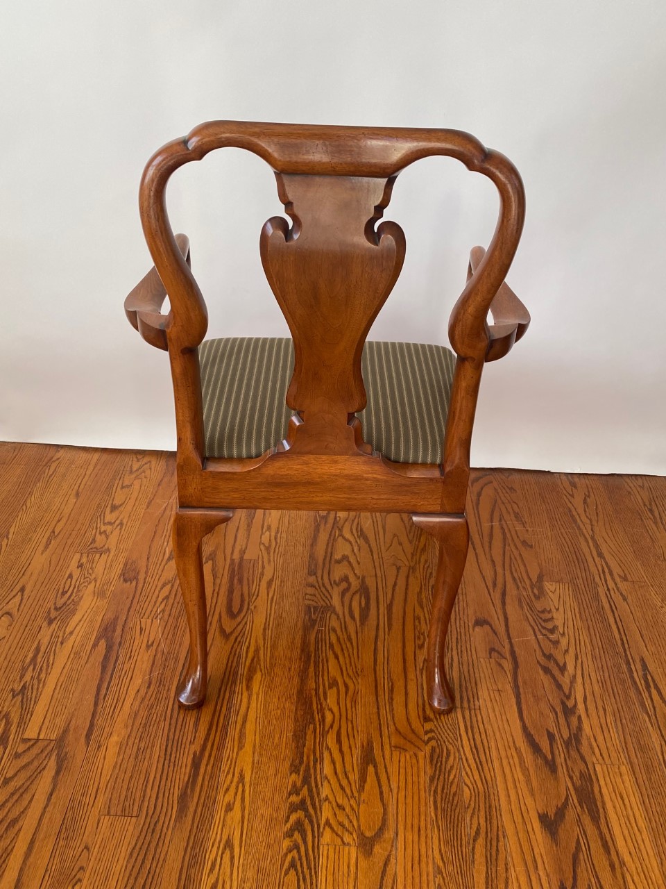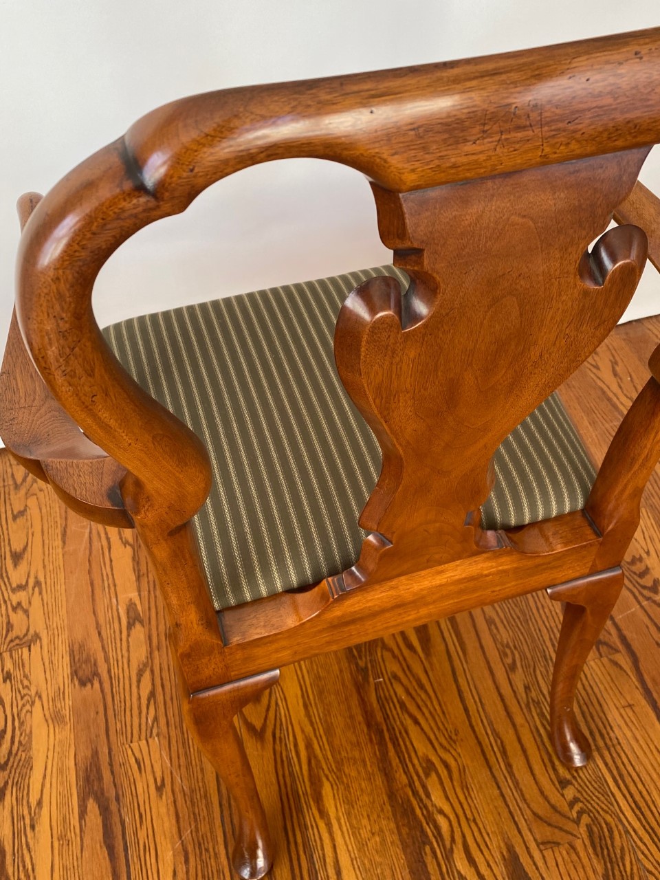 https://www.woodandhogan.com/inventory/queen-anne-style-dining-chair/ Queen Anne Style Dining Chair Item #: B-1328W Dimensions: Side - 22"W 38 1/2"H. Arm - 23 1/2"W 39"H. Description: Queen Anne style dining chair with figured shaped back splat and slip seat on hand carved cabriole legs. COM: 2/3 Yard/Chair. Image Gallery: For additional product information, contact Wood & Hogan: 200 Lexington Avenue, Rm. 812, New York, NY, USA 10016-6101 (212) 532-7440, (212) 532-4640 FAX, sales@woodandhogan.com. Back You also might like: Mahogany Chippendale Arm Chair Queen Anne Style Dining Chair Mahogany George III Style ’Sun Burst’ Chairs. Mahogany Chippendale Style Chairs Upholstered Queen Anne Style Chair. 17th Century Style Oak High Back Side & Arm Chair