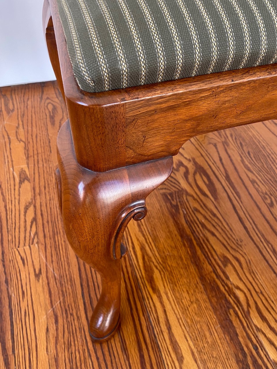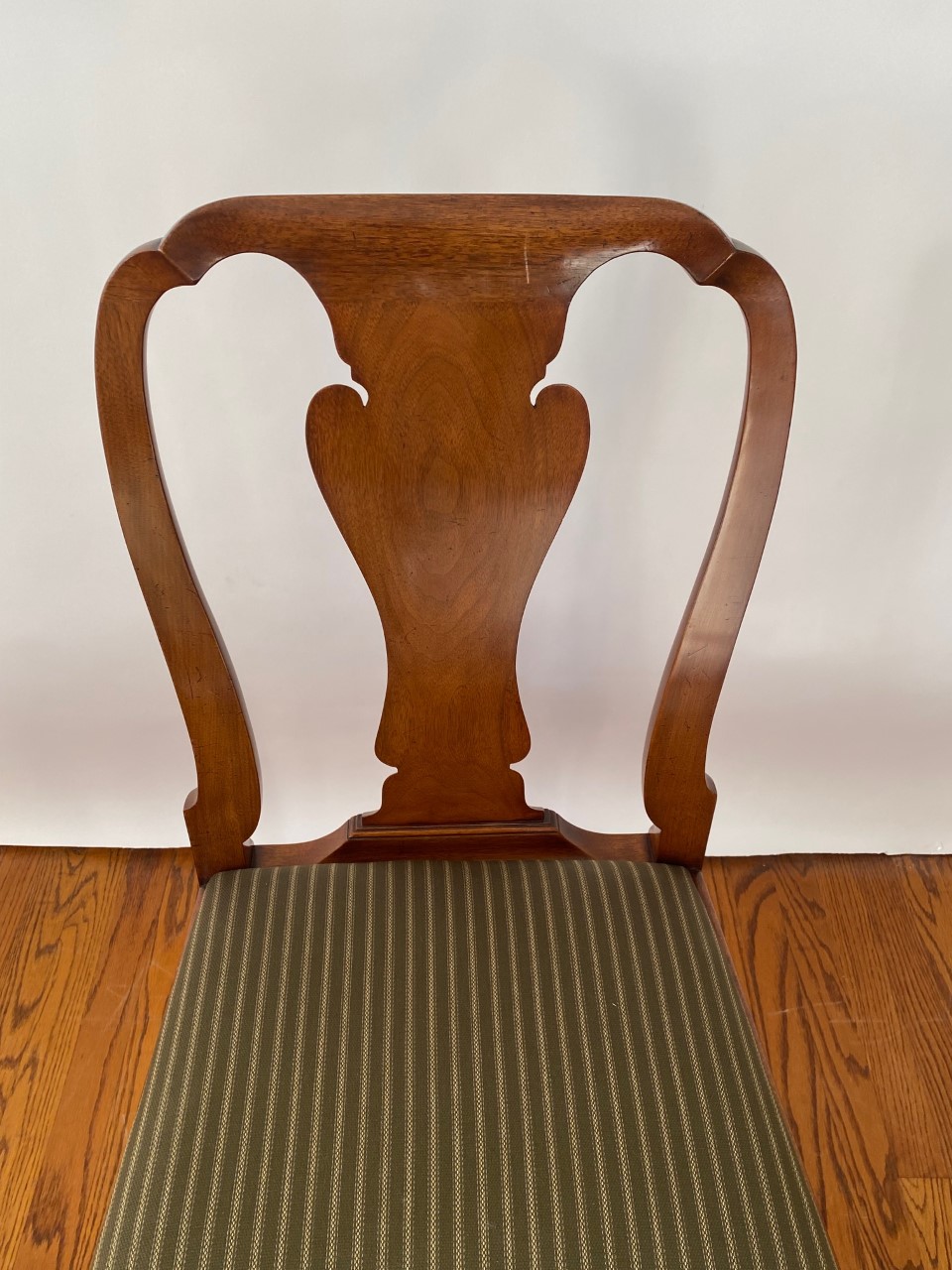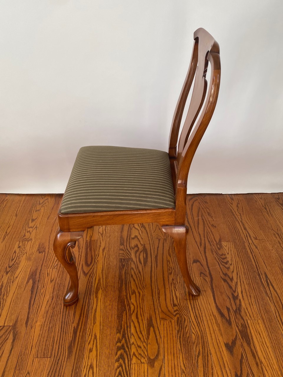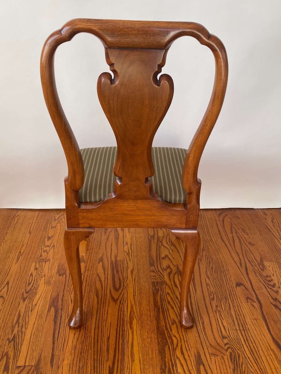 https://www.woodandhogan.com/inventory/queen-anne-style-dining-chair/ Queen Anne Style Dining Chair Item #: B-1328W Dimensions: Side - 22"W 38 1/2"H. Arm - 23 1/2"W 39"H. Description: Queen Anne style dining chair with figured shaped back splat and slip seat on hand carved cabriole legs. COM: 2/3 Yard/Chair. Image Gallery: For additional product information, contact Wood & Hogan: 200 Lexington Avenue, Rm. 812, New York, NY, USA 10016-6101 (212) 532-7440, (212) 532-4640 FAX, sales@woodandhogan.com. Back You also might like: Mahogany Chippendale Arm Chair Queen Anne Style Dining Chair Mahogany George III Style ’Sun Burst’ Chairs. Mahogany Chippendale Style Chairs Upholstered Queen Anne Style Chair. 17th Century Style Oak High Back Side & Arm Chair