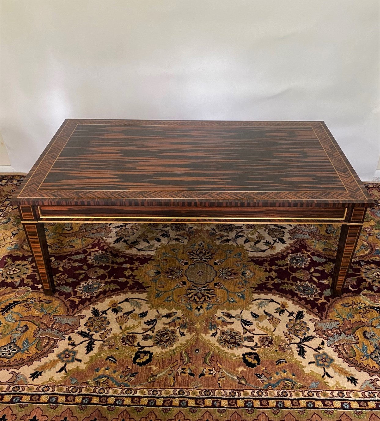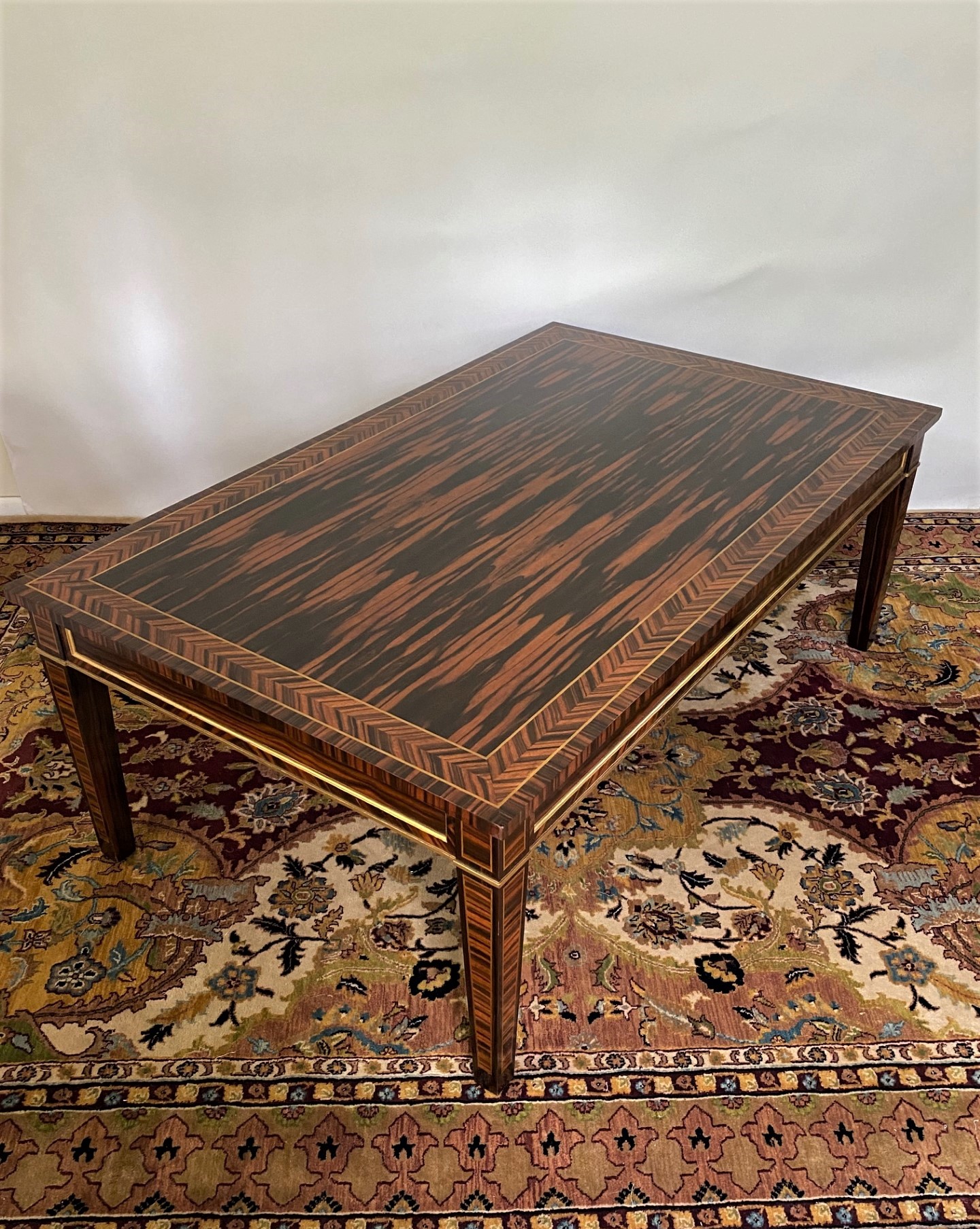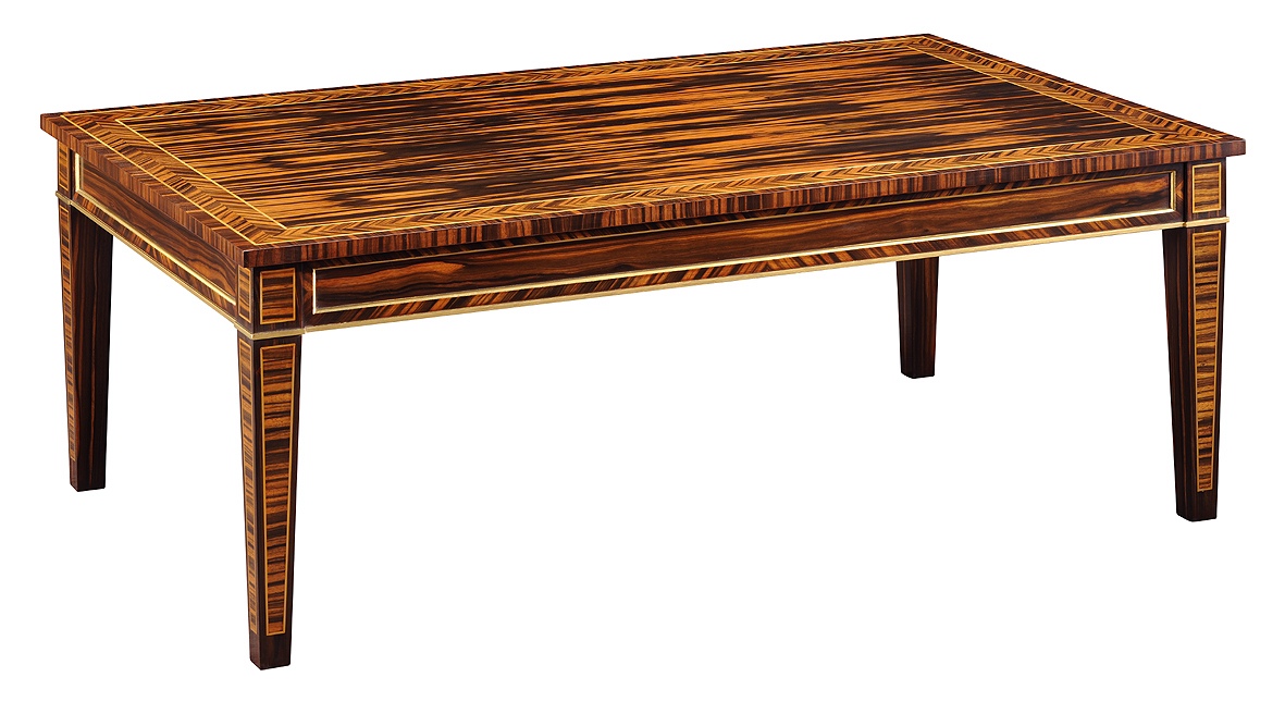 Stunning Regency style Coromandel coffee table with the top having a crossband of Herringbone bordered by Brass line inlay. Each rail with Coromandel inset panel with gilded molding detail. Square tapered legs