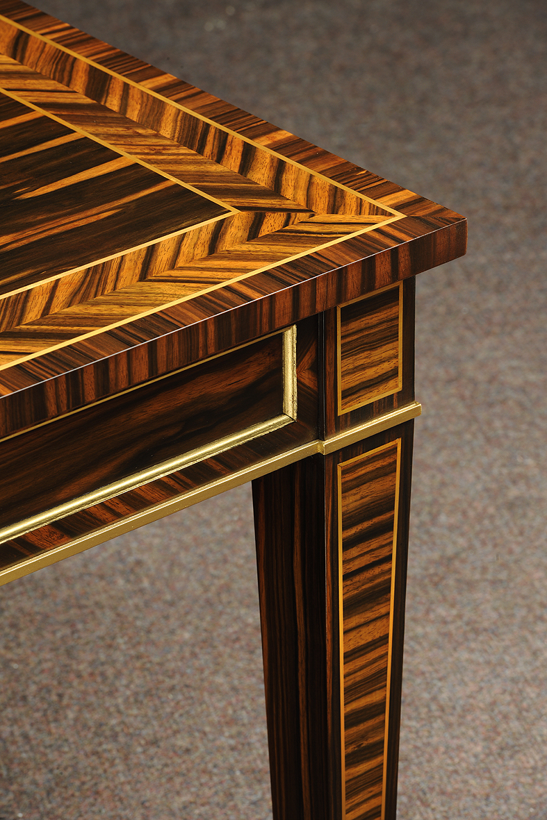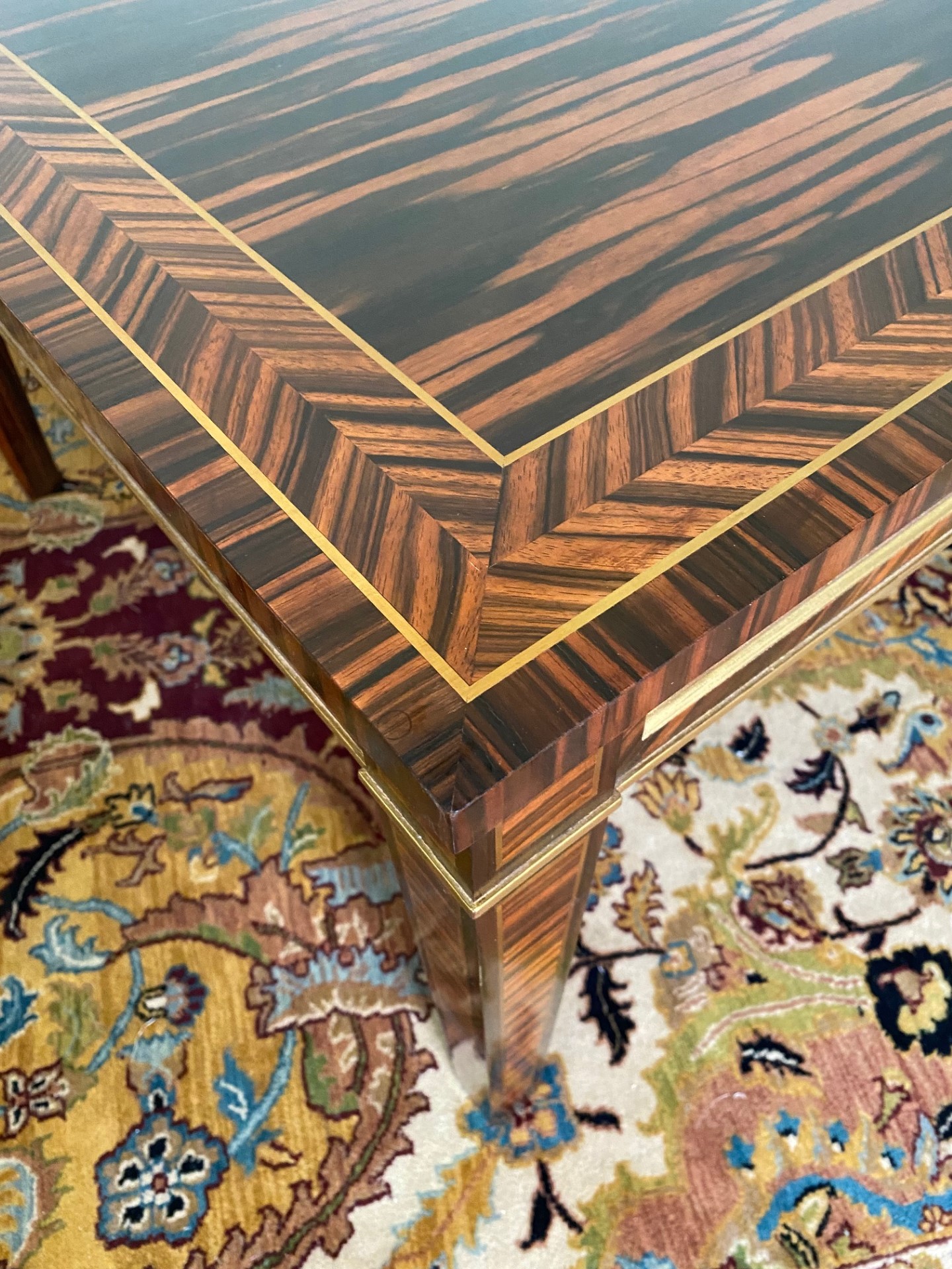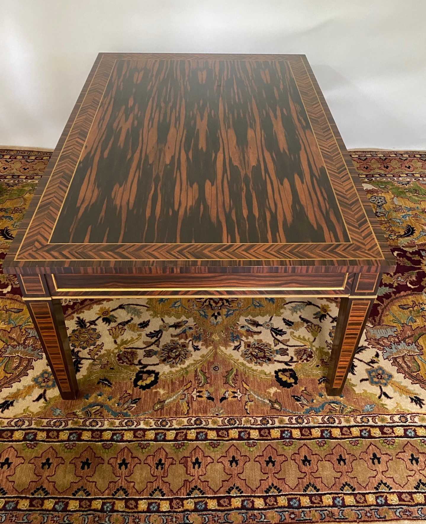 Stunning Regency style Coromandel coffee table with the top having a crossband of Herringbone bordered by Brass line inlay. Each rail with Coromandel inset panel with gilded molding detail. Square tapered legs