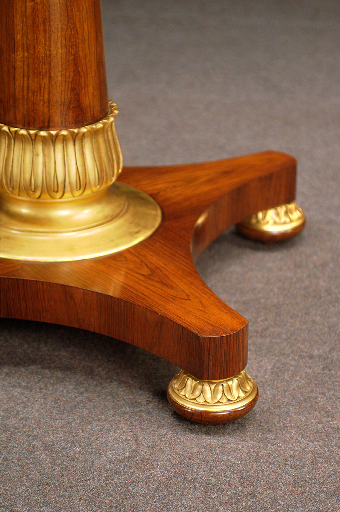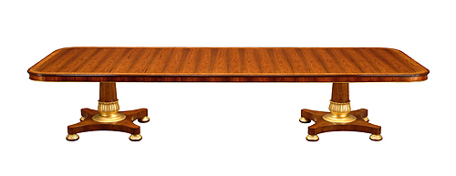 Magnificent Regency style Rosewood two pedestal, two leaf extending table. Highly figured matched Rosewood top with a crossbanding of Satinwood and Burr Yewwood on the edge. Each Rosewood four sided base has ornate hand carved and 23k oil gilt leaf decoration to the base of the pillar, as well as, the bun feet. When fully extended this tale will seat 14-16 people.