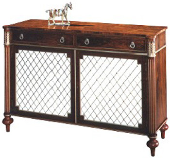 Rosewood Regency style commode with carved and fluted pilasters with gold leaf and gilt detail. Two fitted drawers above cupboard doors with pleated fabric (COM 3.5 yards) behind solid brass diamond shaped grille.