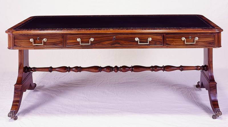 https://www.woodandhogan.com/inventory/regency-style-rosewood-writing-table/ Regency Style Rosewood Writing Table Item #: BC-8332 Dimensions: 72"W 32"D 31"H Description: Regency Style Rosewood Three Drawer Writing Tale with Tooled Leather Top. For additional product information, contact Wood & Hogan: 200 Lexington Avenue, Rm. 812, New York, NY, USA 10016-6101 (212) 532-7440, (212) 532-4640 FAX, sales@woodandhogan.com. Back You also might like: Regency Style Writing Table. Georgian Style Mahogany Side Table Mahogany Chippendale Style Mahogany Kneehole Writing Table Regency Style Rosewood Drum Table Burr Maple Sheraton Style Extending Circular Table.