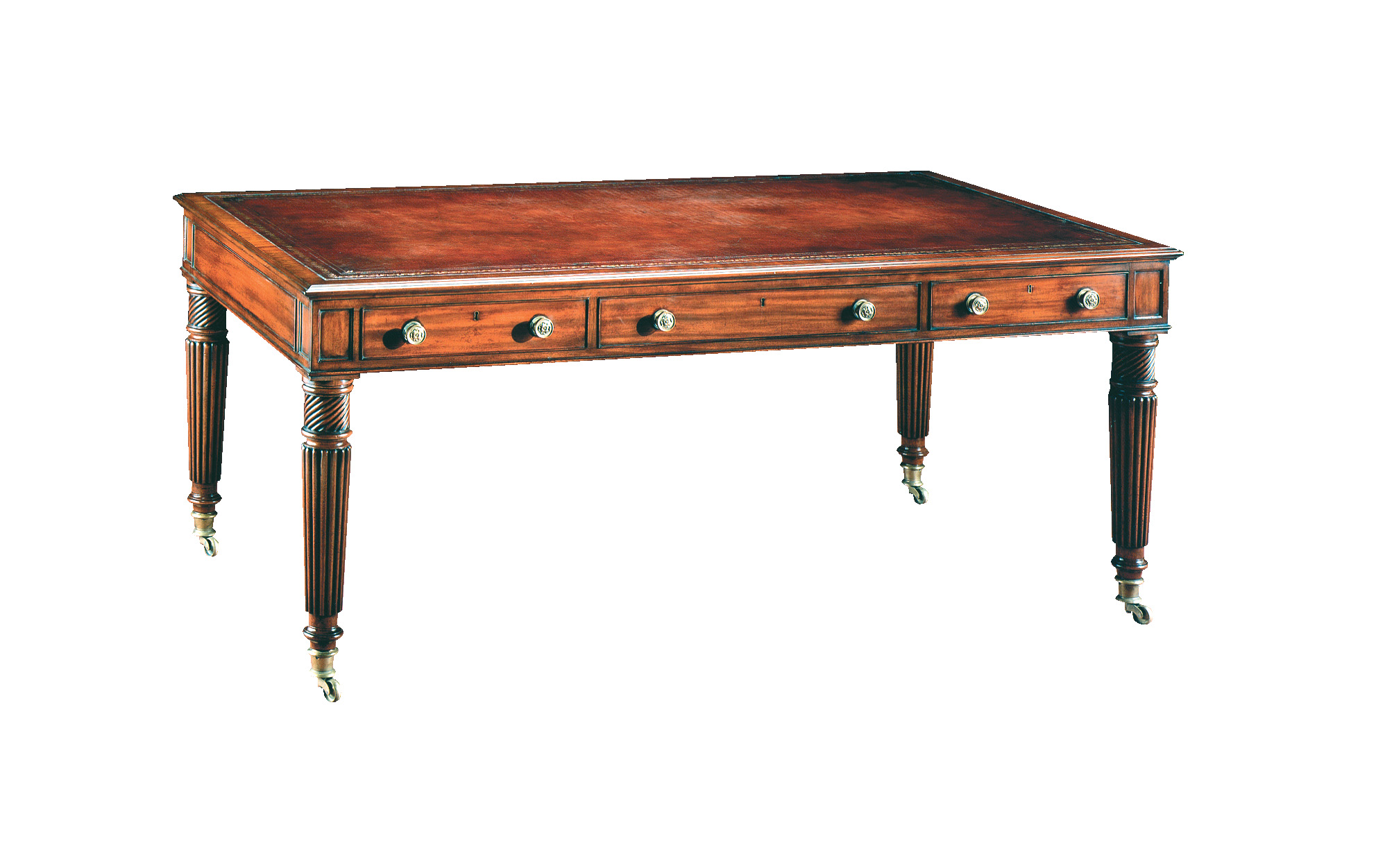 Fine Mahogany Regency style writing table featuring a gilt tooled leather top, three fitted drawers with solid brass knobs and hand carved scroll and reeded legs resting on solid brass large socket castors.