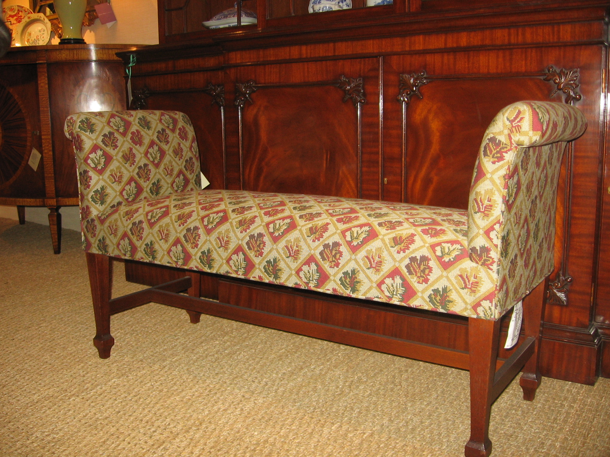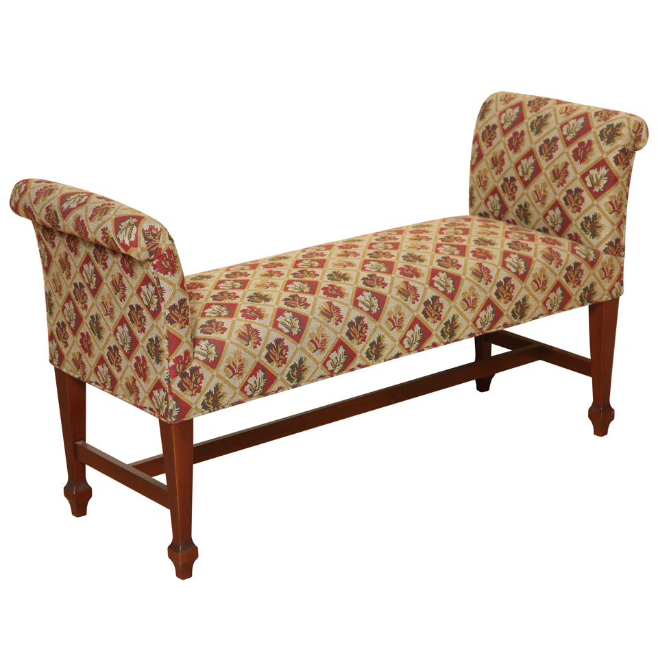 https://www.woodandhogan.com/inventory/sheraton-style-mahogany-bench/ Sheraton Style Mahogany Bench Item #: WU-600 Dimensions: 46"W 15"D 25"H. Description: Mahogany Shallow Bench with Scroll Arms on Square Tapered Legs with Stretcher. COM: 2 1/2 Yards. Image Gallery: For additional product information, contact Wood & Hogan: 200 Lexington Avenue, Rm. 812, New York, NY, USA 10016-6101 (212) 532-7440, (212) 532-4640 FAX, sales@woodandhogan.com. Back You also might like: Sheraton Style Mahogany Bench Lady Crawley Bench Chippendale Style Mahogany Stool. Chippendale Style Mahogany Bench. 19th Century Jumu Low Table Regency Style Mahogany Bench.