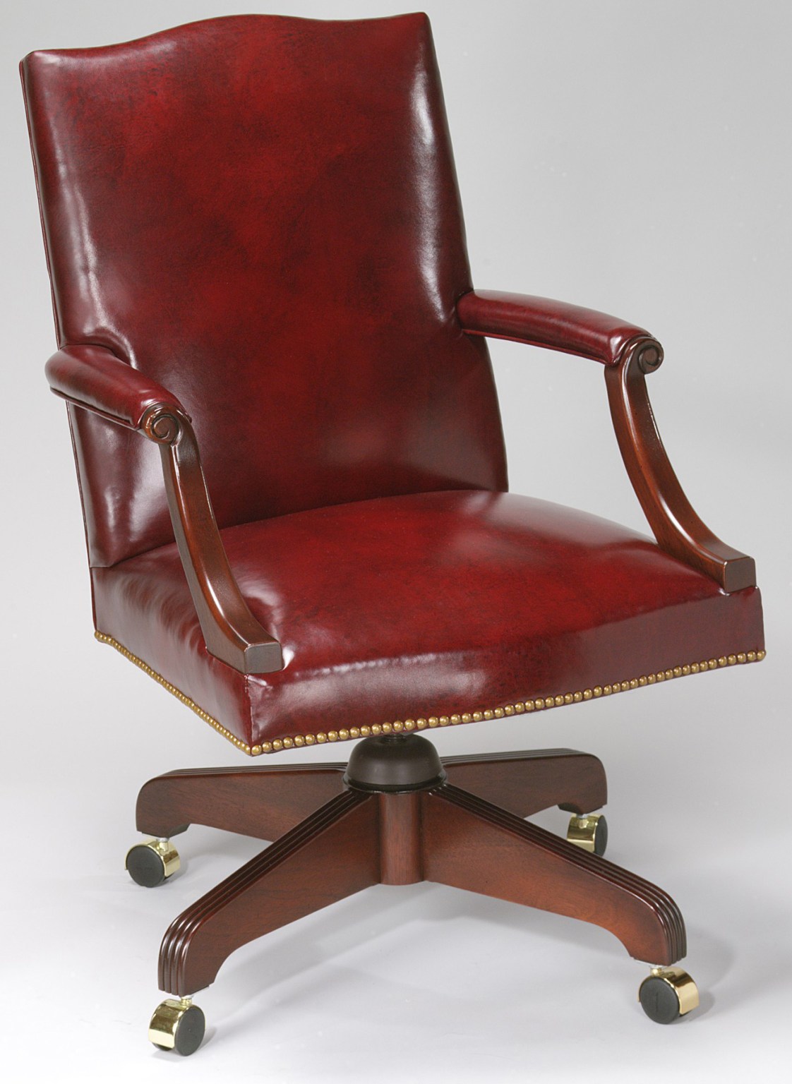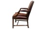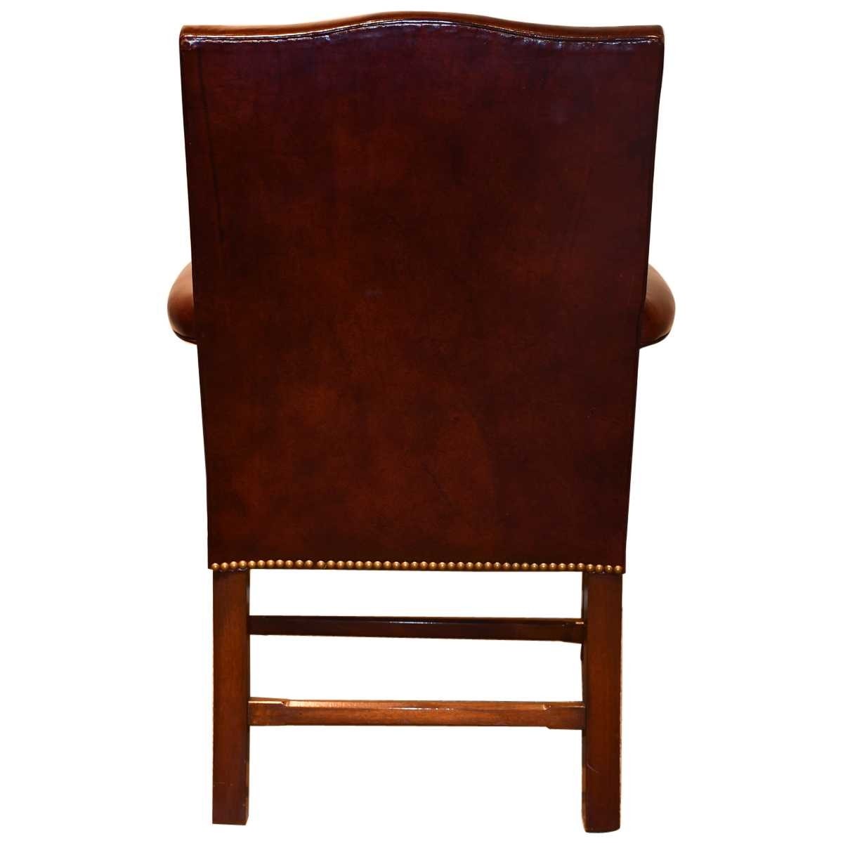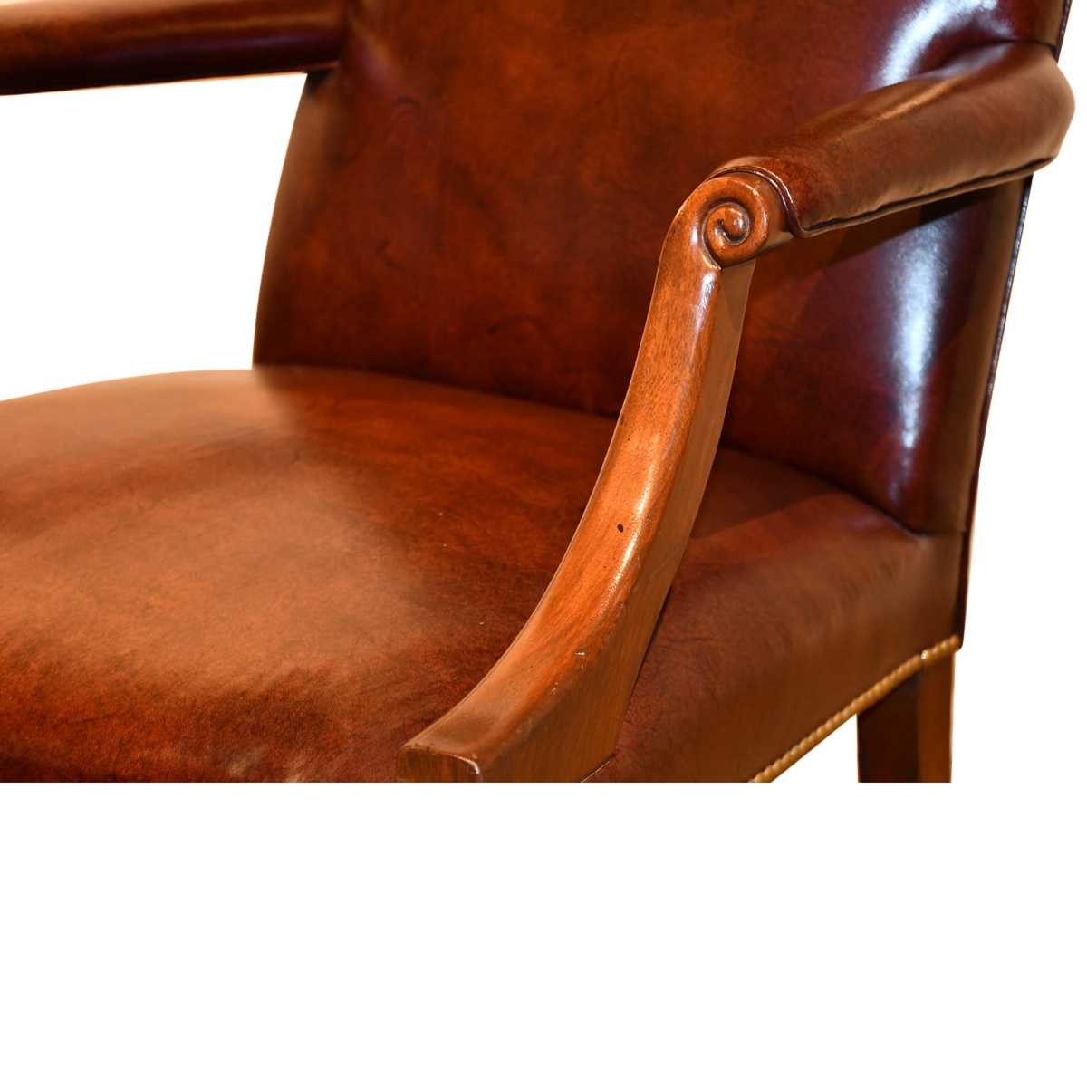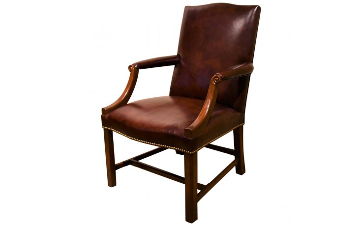 Perfectly situated at a conference table, library or desk…A classical Mahogany Gainsborough armchair of medium size with uncommon chamfered stretchers. Serpentine shaped top and seat front add to its distinction. COM – 2 1/2 yards 50″ Plain Fabric / COL – 50 Square Feet.