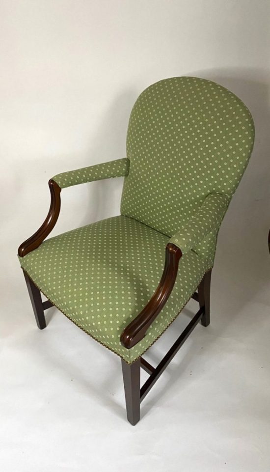 A graceful Sheraton style Mahogany armchair that is comfortable with distinctive style. Ideal for conference and/or visitor chair. COM – 2 1/2 yards; 50″ plain. COL – 45 Square Feet