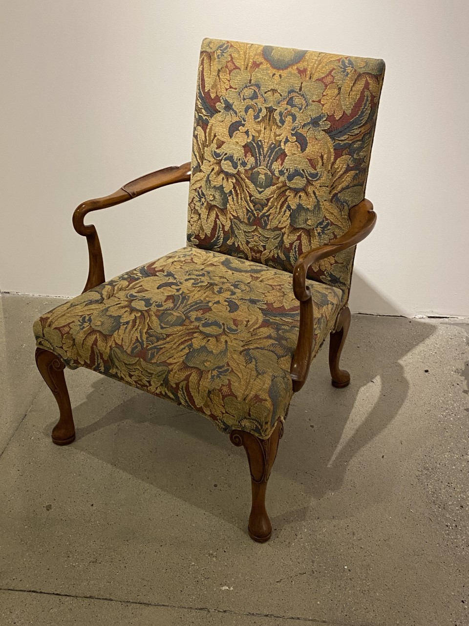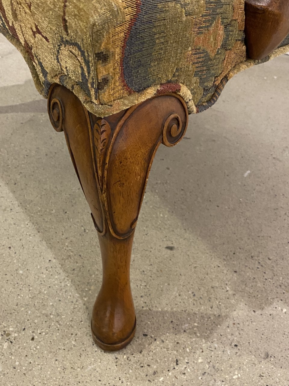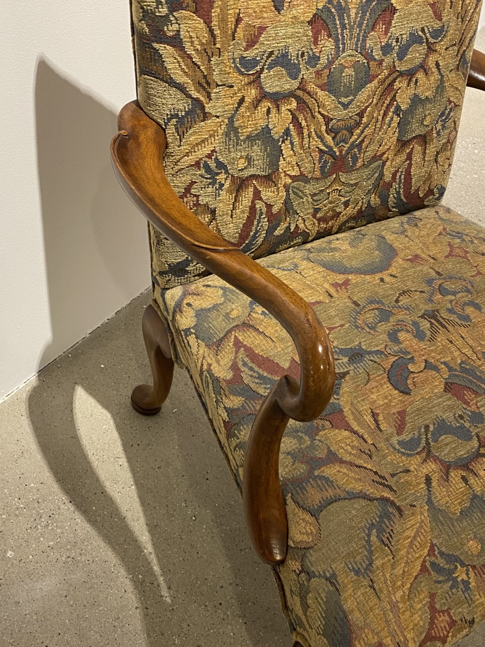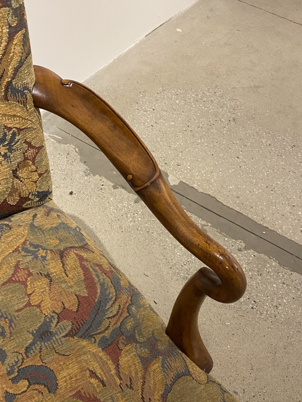 https://www.woodandhogan.com/inventory/walnut-george-i-style-open-armchair/ Walnut George I Style Open Armchair. Item #: B-1483 Dimensions: 27"W 27 1/2"D 38"H; 17"SH. Description: Superb George I style Walnut open armchair with deep scooped shepherd crook arms and hand carved detail to front legs. COM – 2 1/2 yards; 50″ plain. Image Gallery: For additional product information, contact Wood & Hogan: 200 Lexington Avenue, Rm. 812, New York, NY, USA 10016-6101 (212) 532-7440, (212) 532-4640 FAX, sales@woodandhogan.com. Back You also might like: OXFORD CLUB CHAIR W/ OPTIONAL OTTOMAN Mahogany Sheraton Style dining 17th Century Style Oak High Back Side & Arm Chair 18th Century Style Mahogany Bench. Essex Wing Chair Chippendale Style Sofa