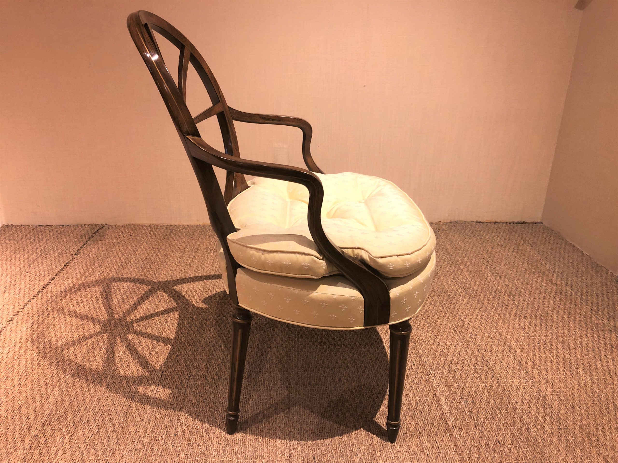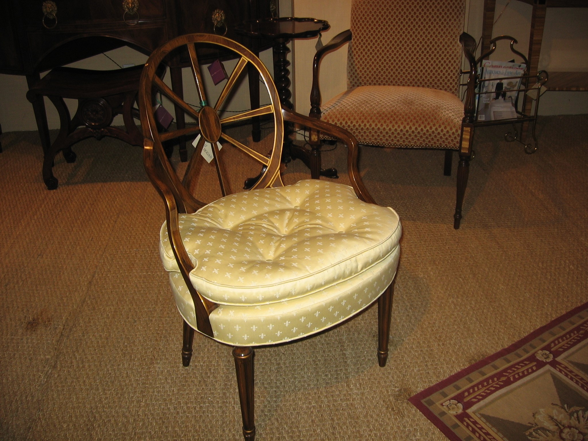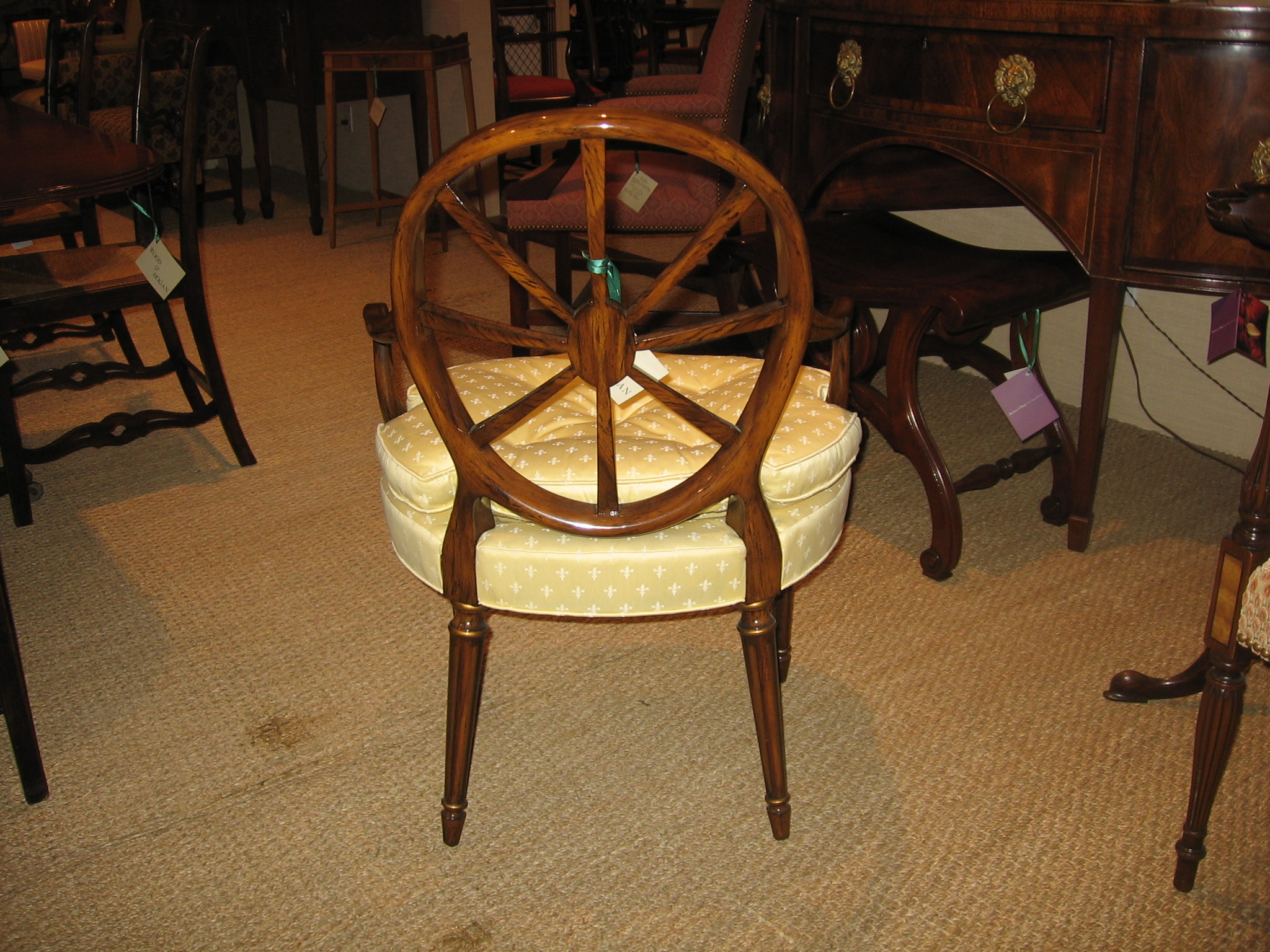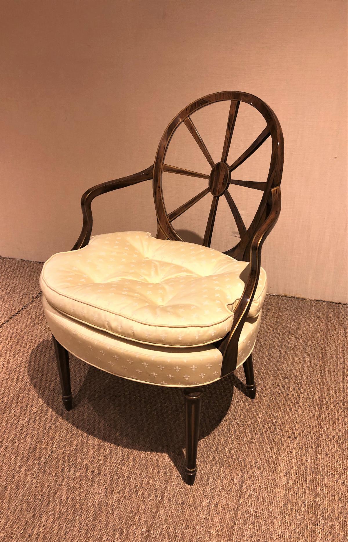 https://www.woodandhogan.com/inventory/wheelback-open-armchair/ Wheelback Open Armchair Item #: WU-514 Dimensions: 23"W 26"D 36"H; 26 1/2"AH Description: Wheelback Open Armchair with Loose Cushion and Faux Rosewood Finish with Gilt Trim. COM: 2 yards; 50″ Plain. Image Gallery: For additional product information, contact Wood & Hogan: 200 Lexington Avenue, Rm. 812, New York, NY, USA 10016-6101 (212) 532-7440, (212) 532-4640 FAX, sales@woodandhogan.com. Back You also might like: Chippendale Style Mahogany Bench. Director’s Open Armchair Mahogany Chippendale Style Chairs LITCHFIELD WING CHAIR Ball & Claw Wing Chair Georgian Mahogany Open Arm Chair.